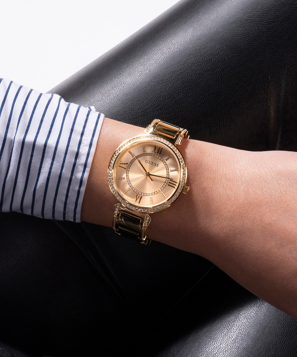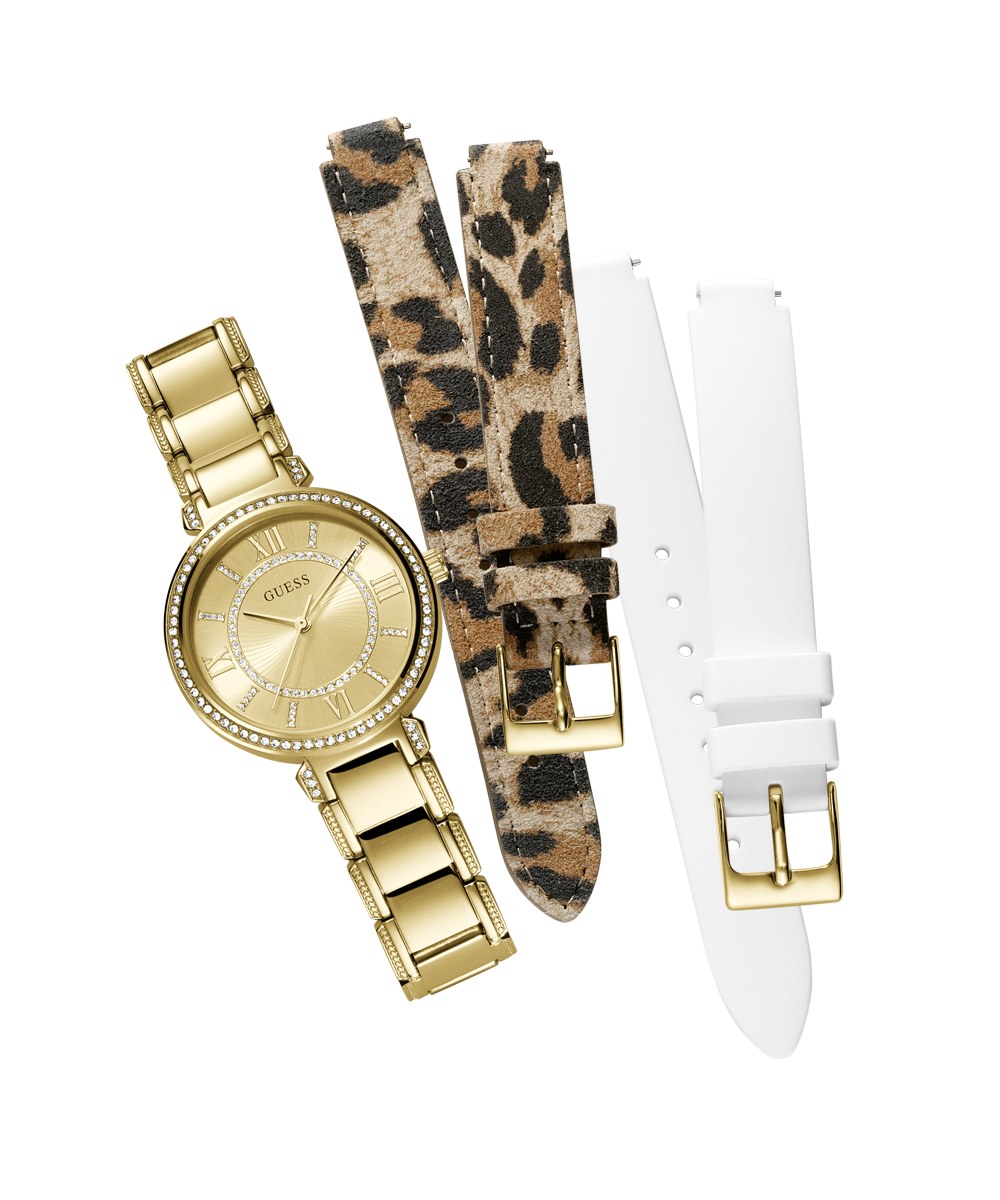 A watch wardrobe that gives you the versatility of a bracelet, silicone strap as well as an ethically sourced leather with ultra-suede backing that are all interchangeable on this great fully glitz crystal look with a dressed up 3H dial. This style ships in packaging.