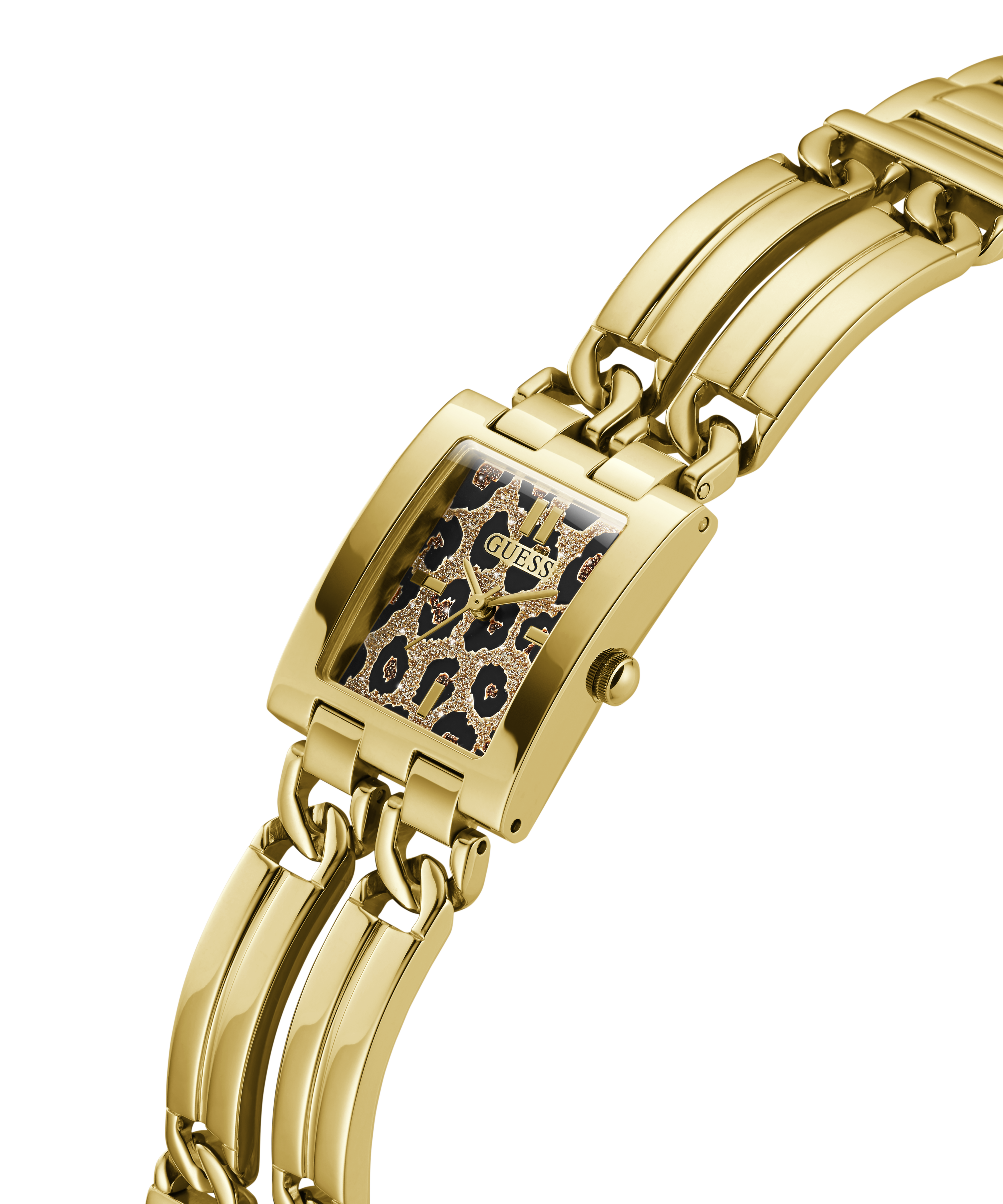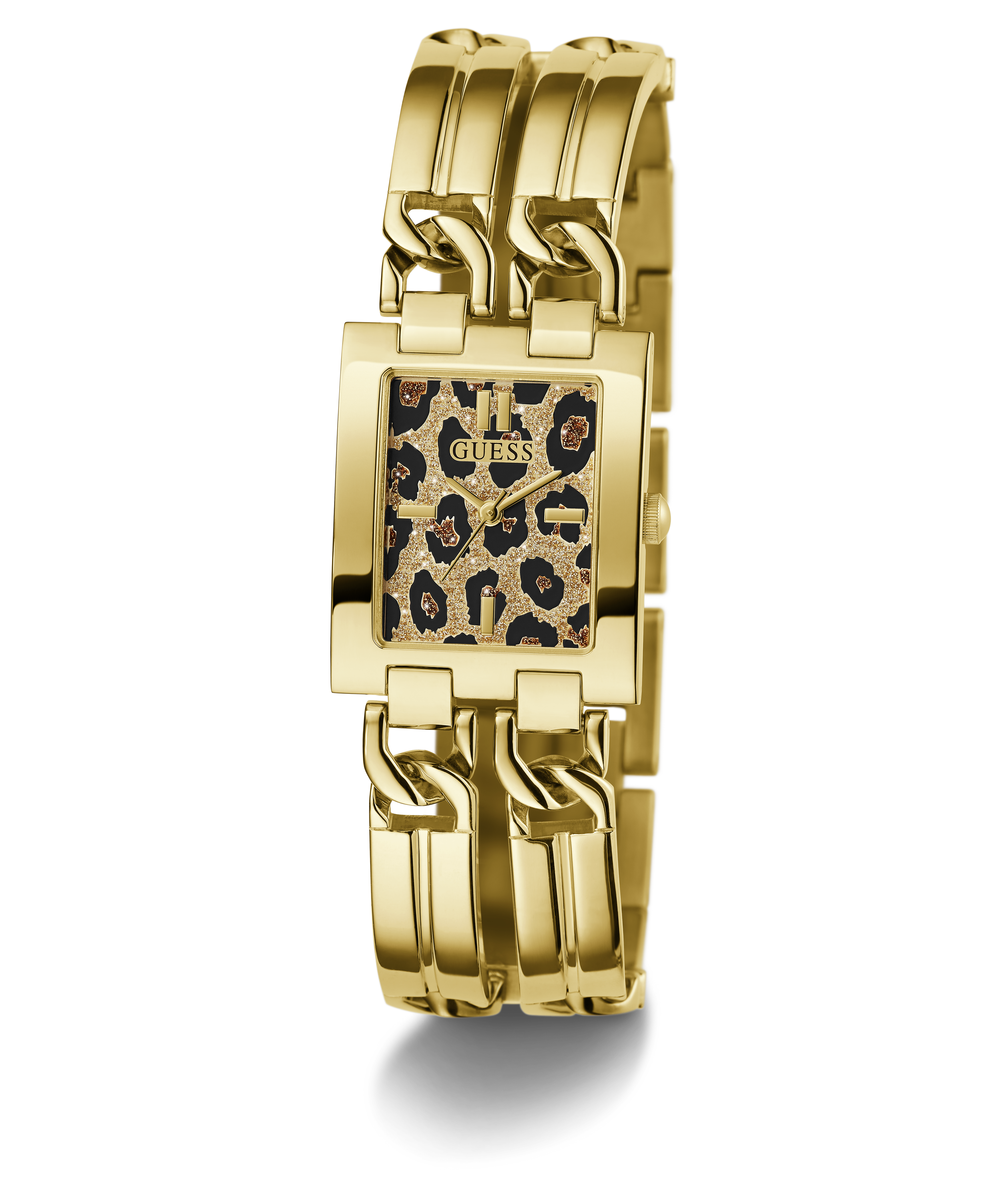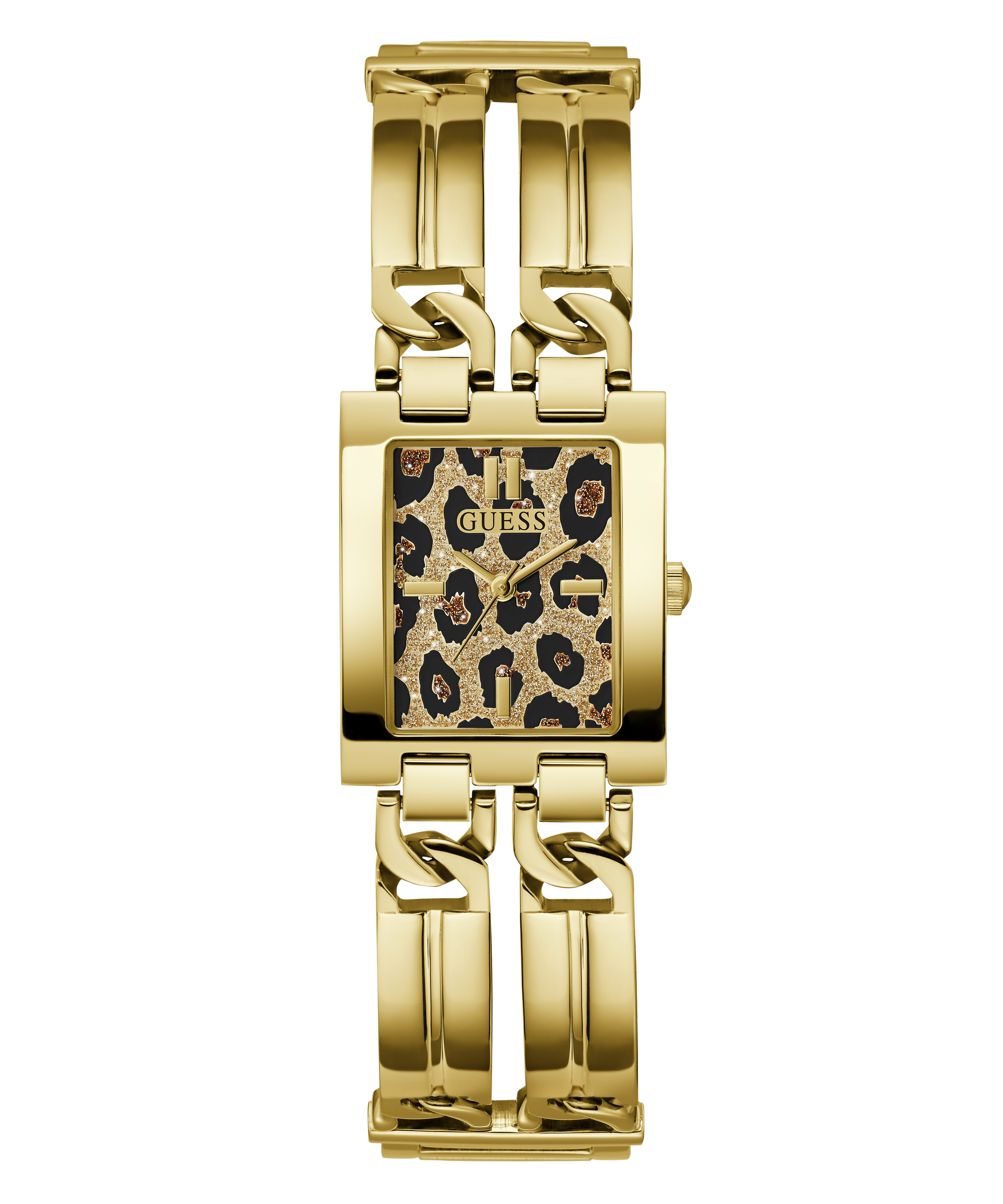 A fresh update to a classic style this look features a sleek ID chain and a glitzed out leopard print dial. Self-adjustable g-links make this piece easy to size. Great on its own or layered with other jewelry!