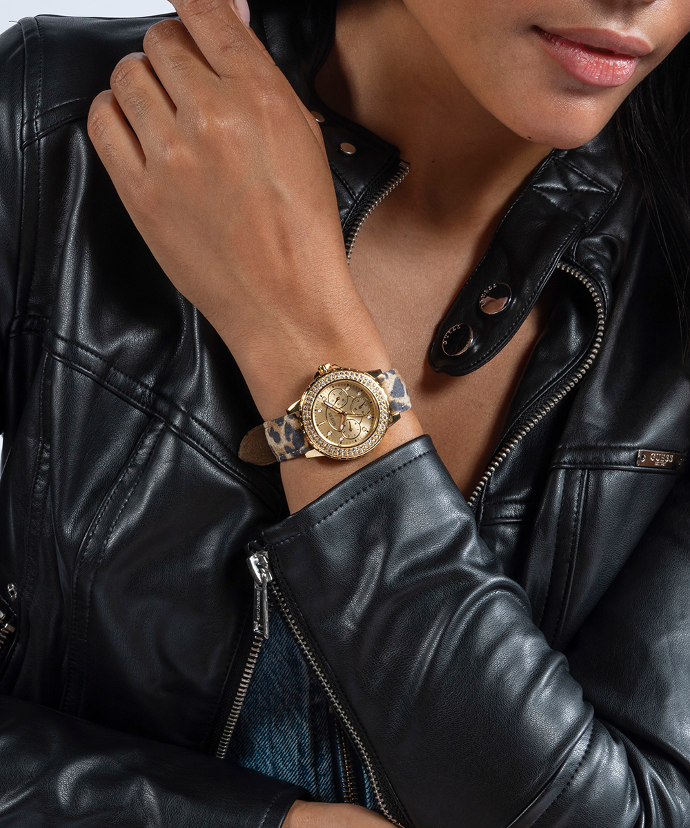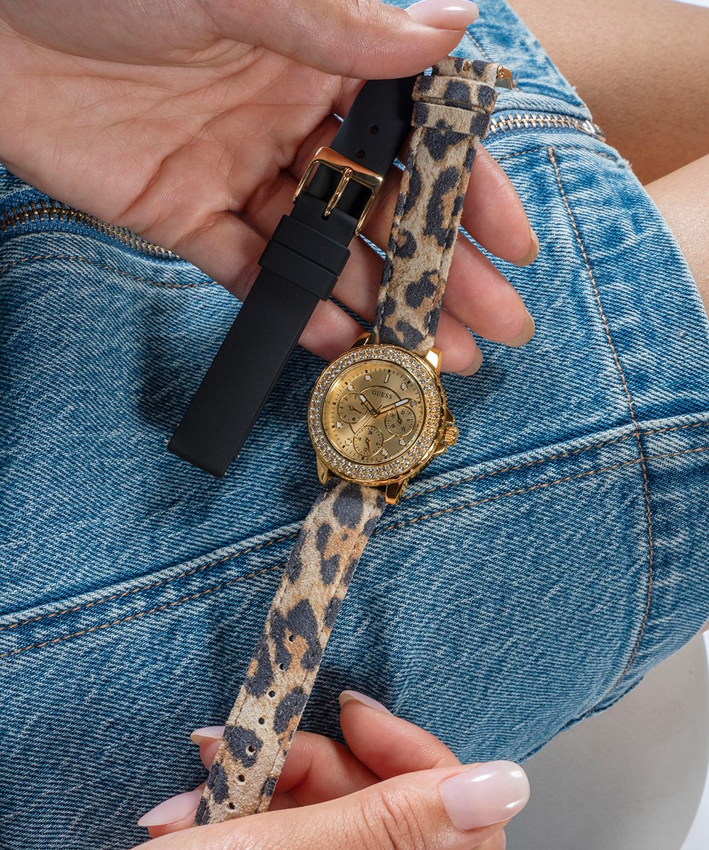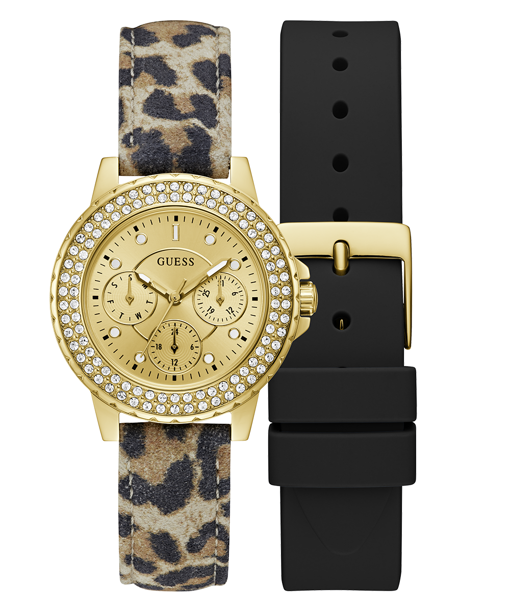 Our crown jewel of the season, this style offers a double row of delicate crystal details with a refined multi-function dial paired with the option of both a leopard leather strap or interchangeable black silicone strap and comes together in a gift box.