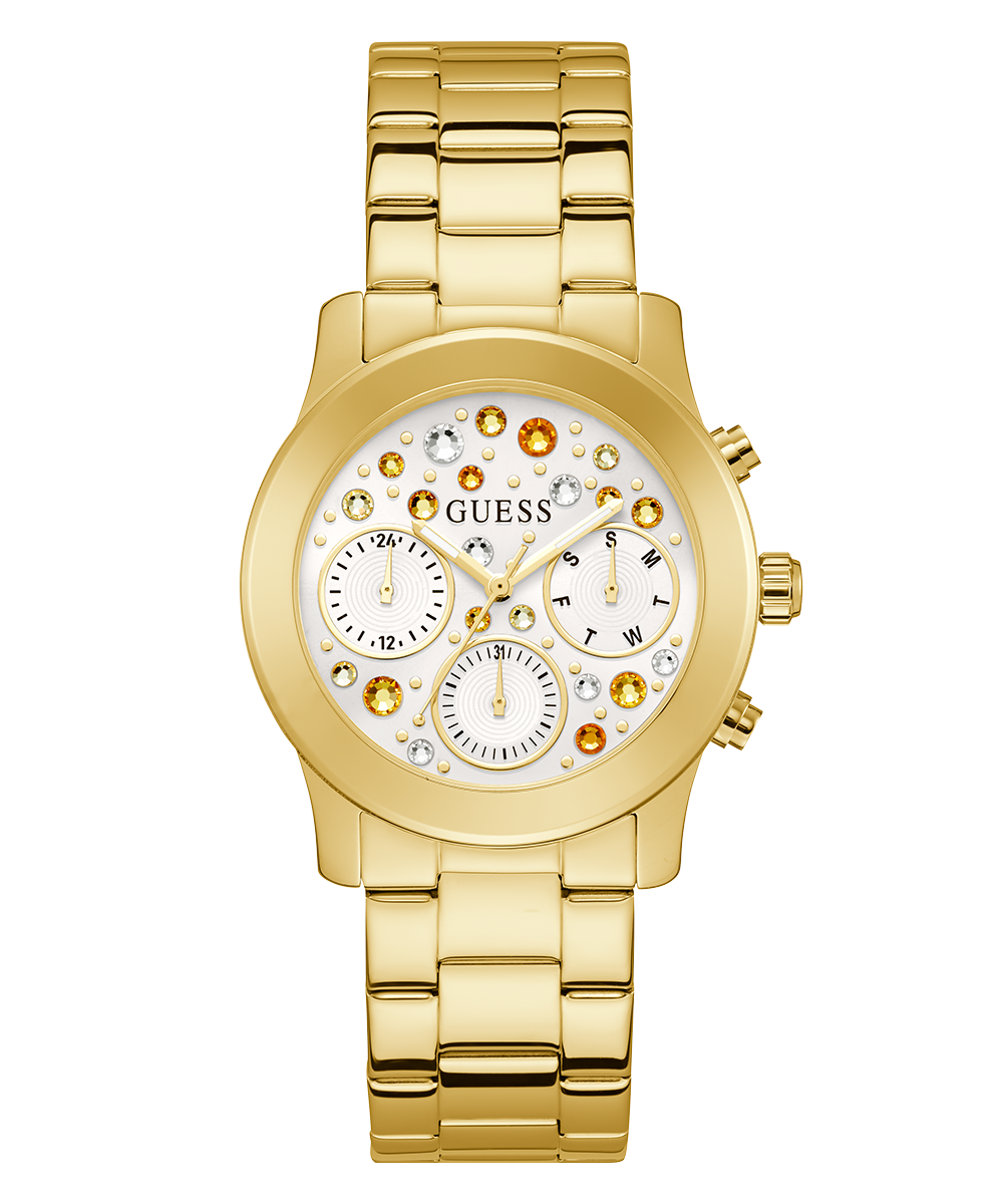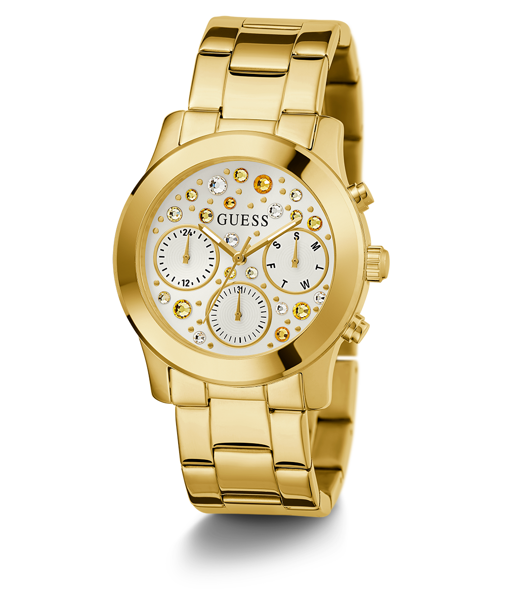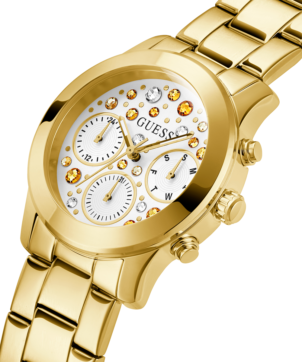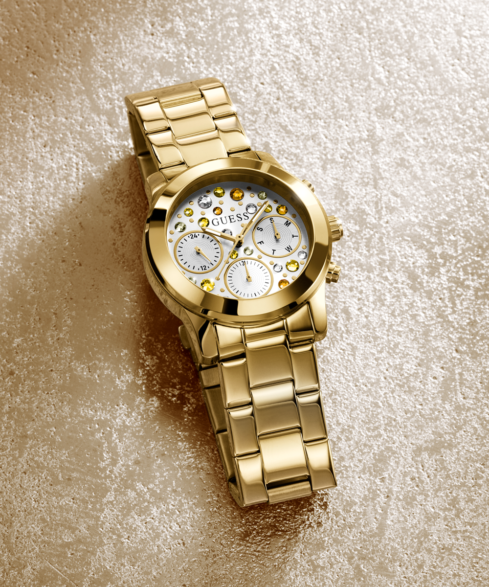 Go to the shopA fantasy of color surrounds this beautiful timepiece that features a multi-colored crystal dial and chrono-look multi-function movement