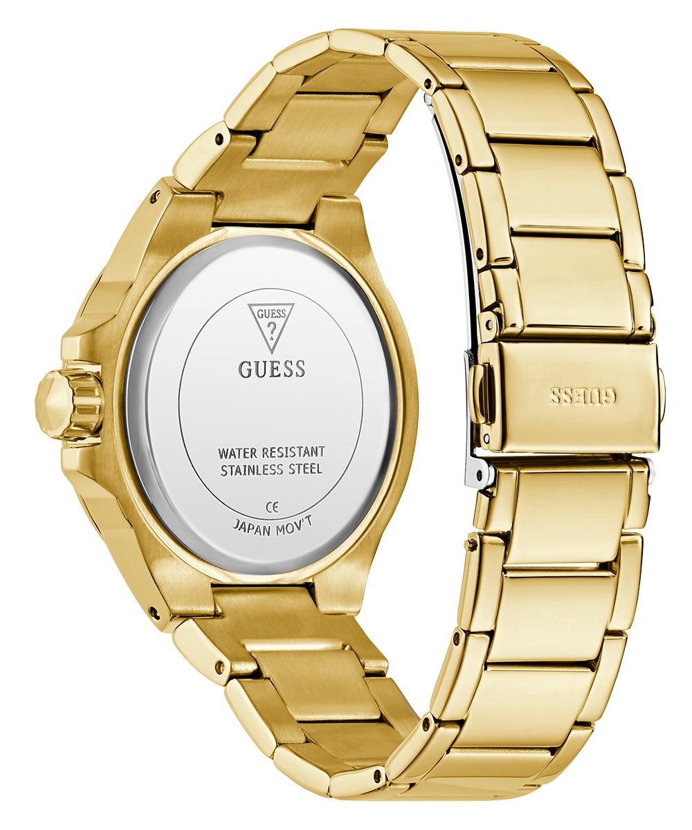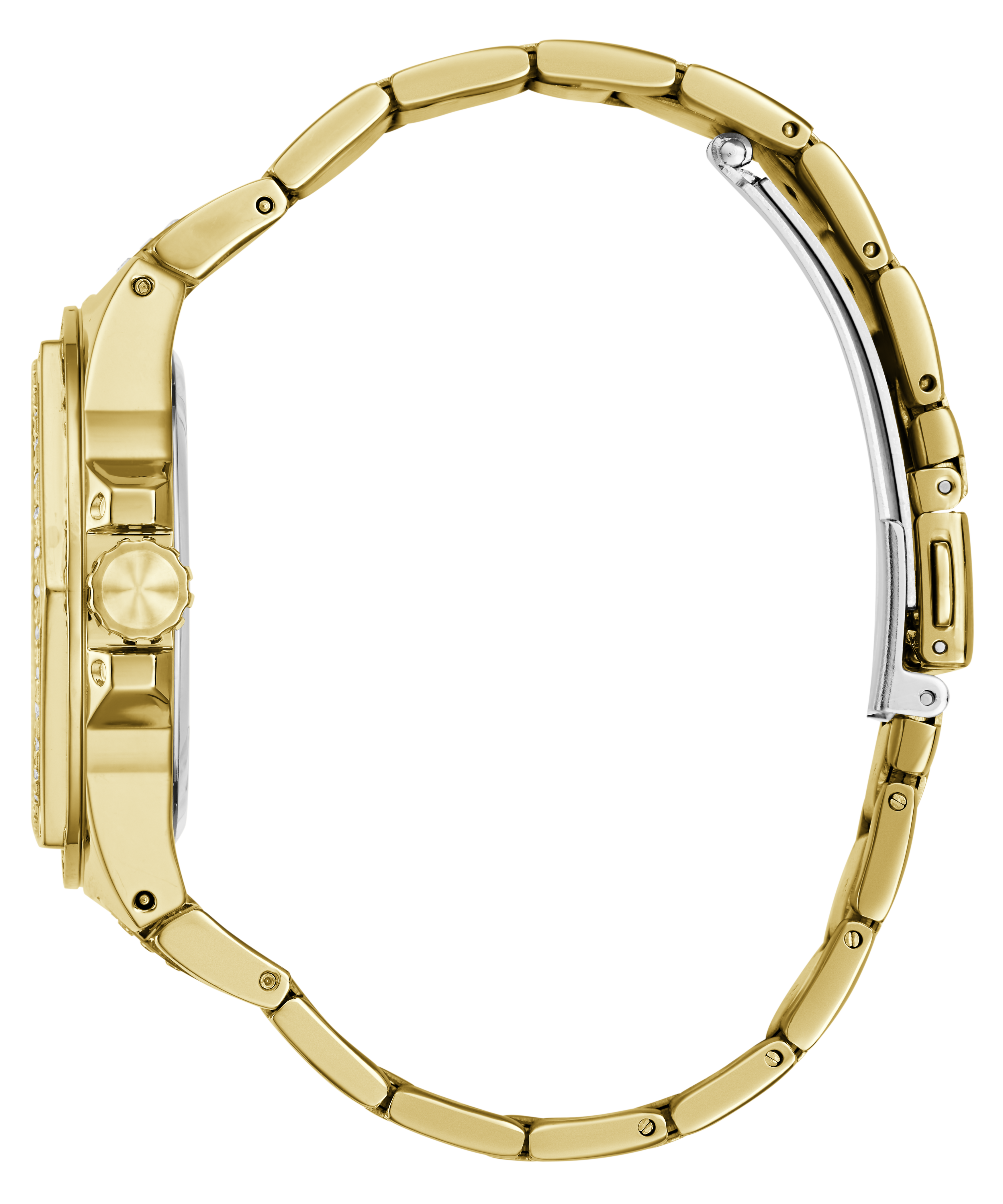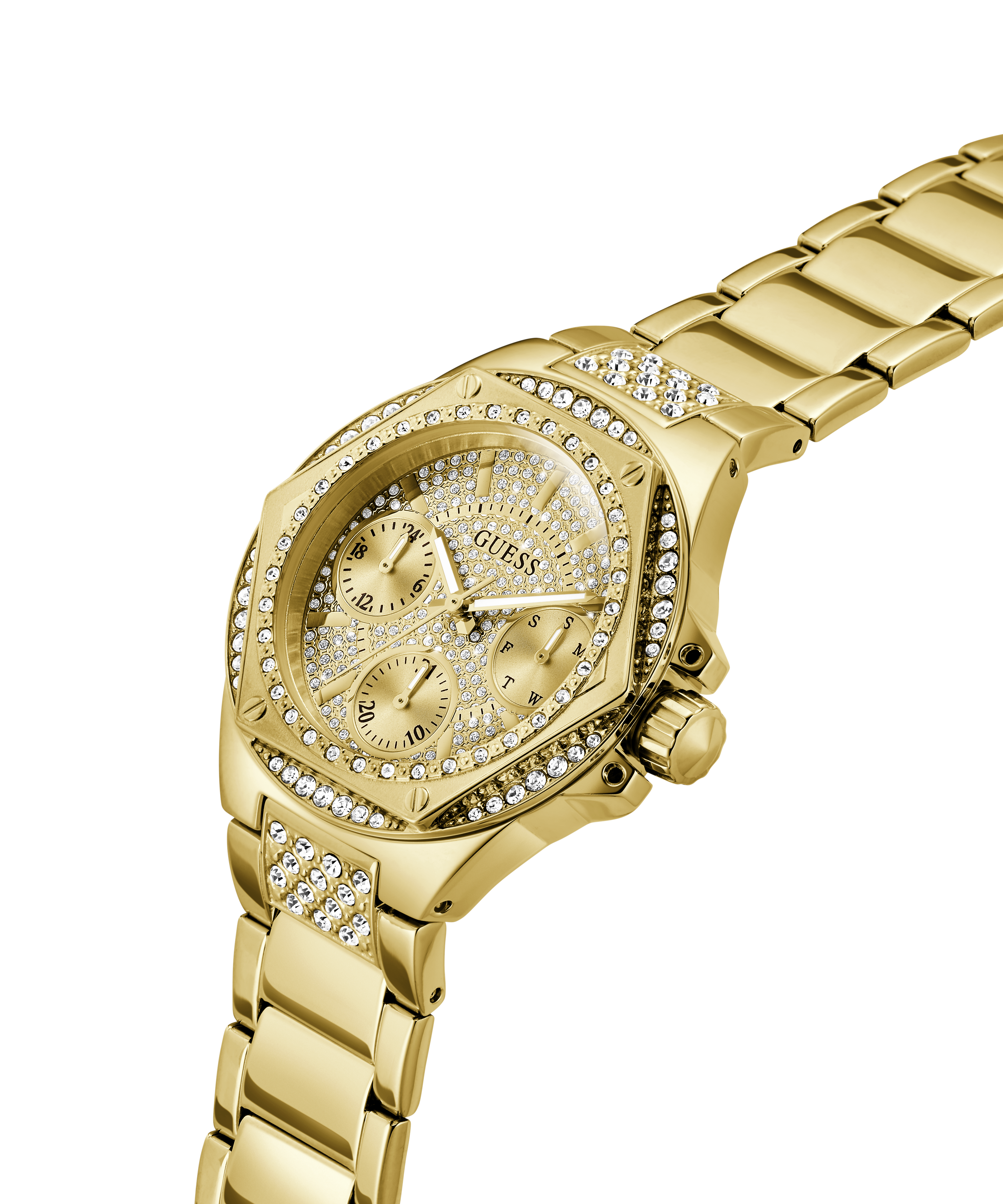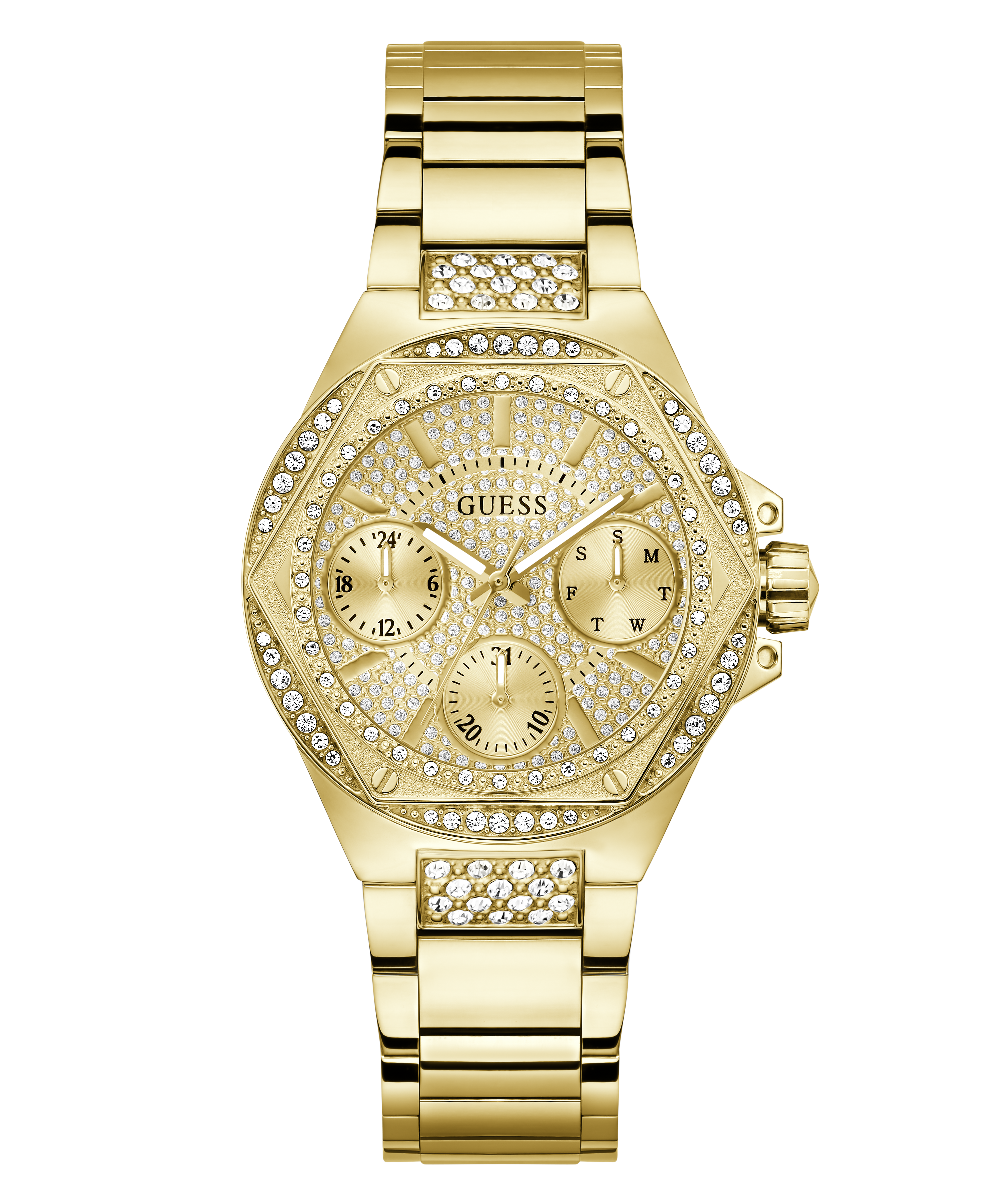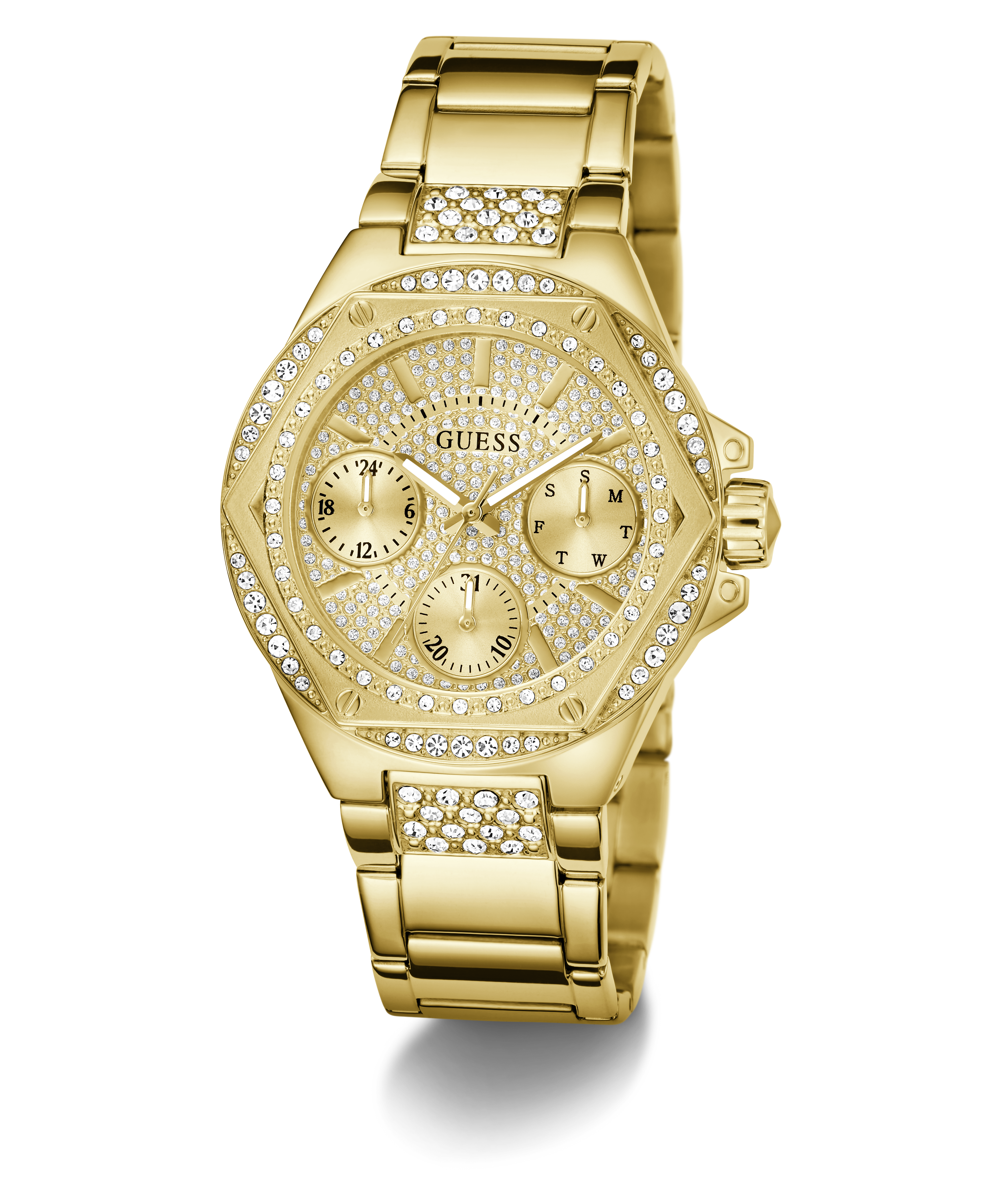 Be the envy of all when you wear this trendy new style with angular details on the bezel paired with stone details and a full glitz multi-function dial!