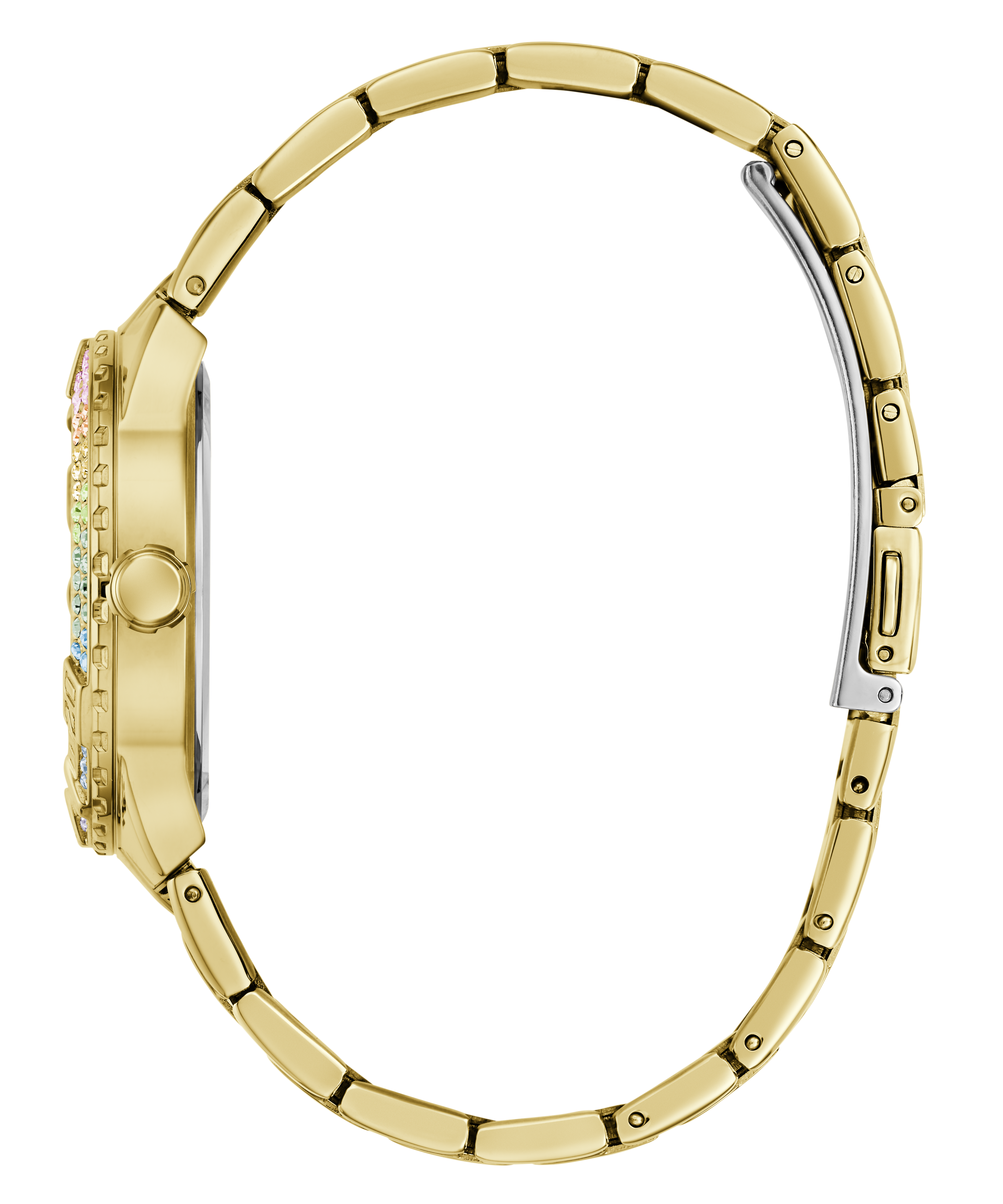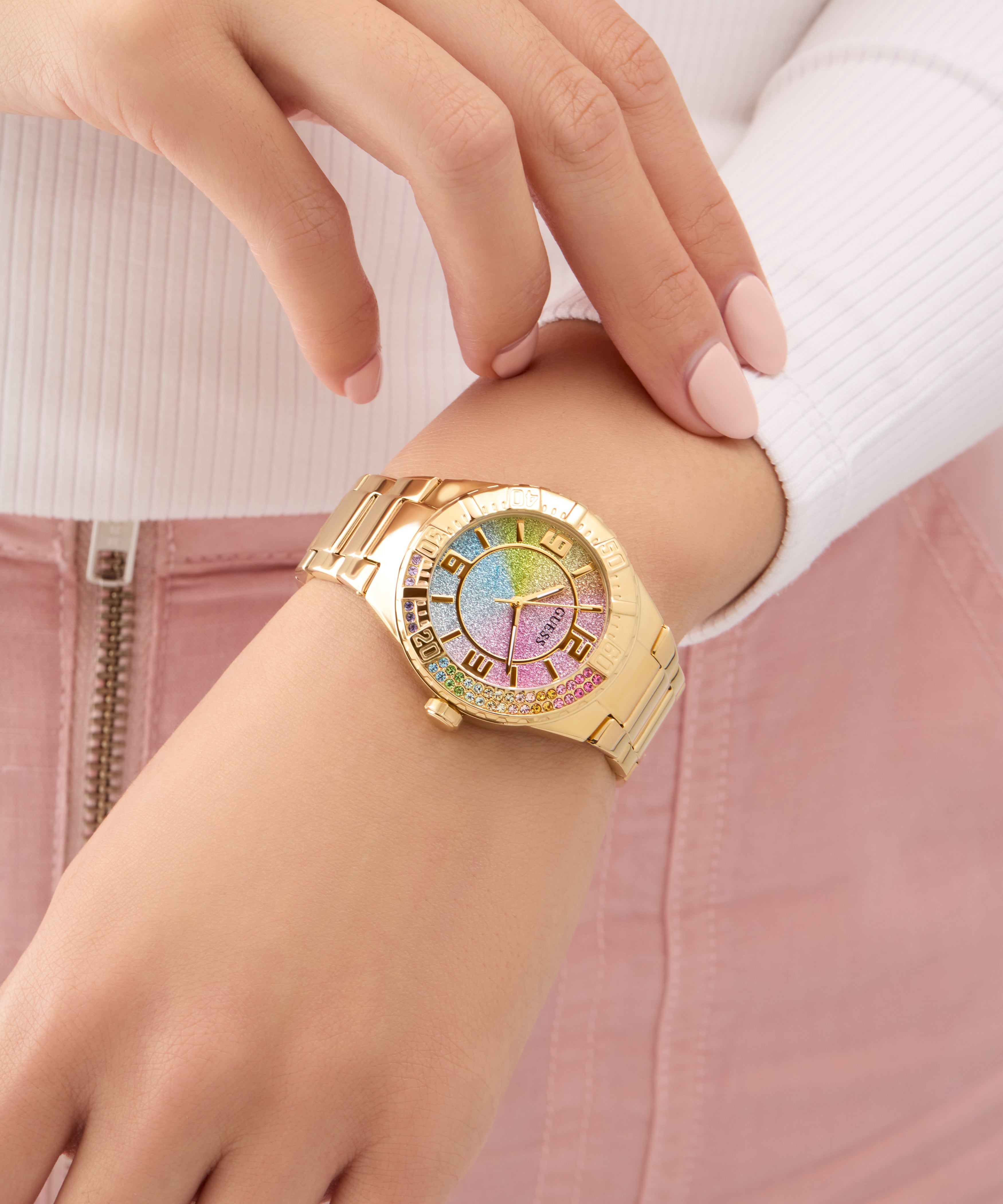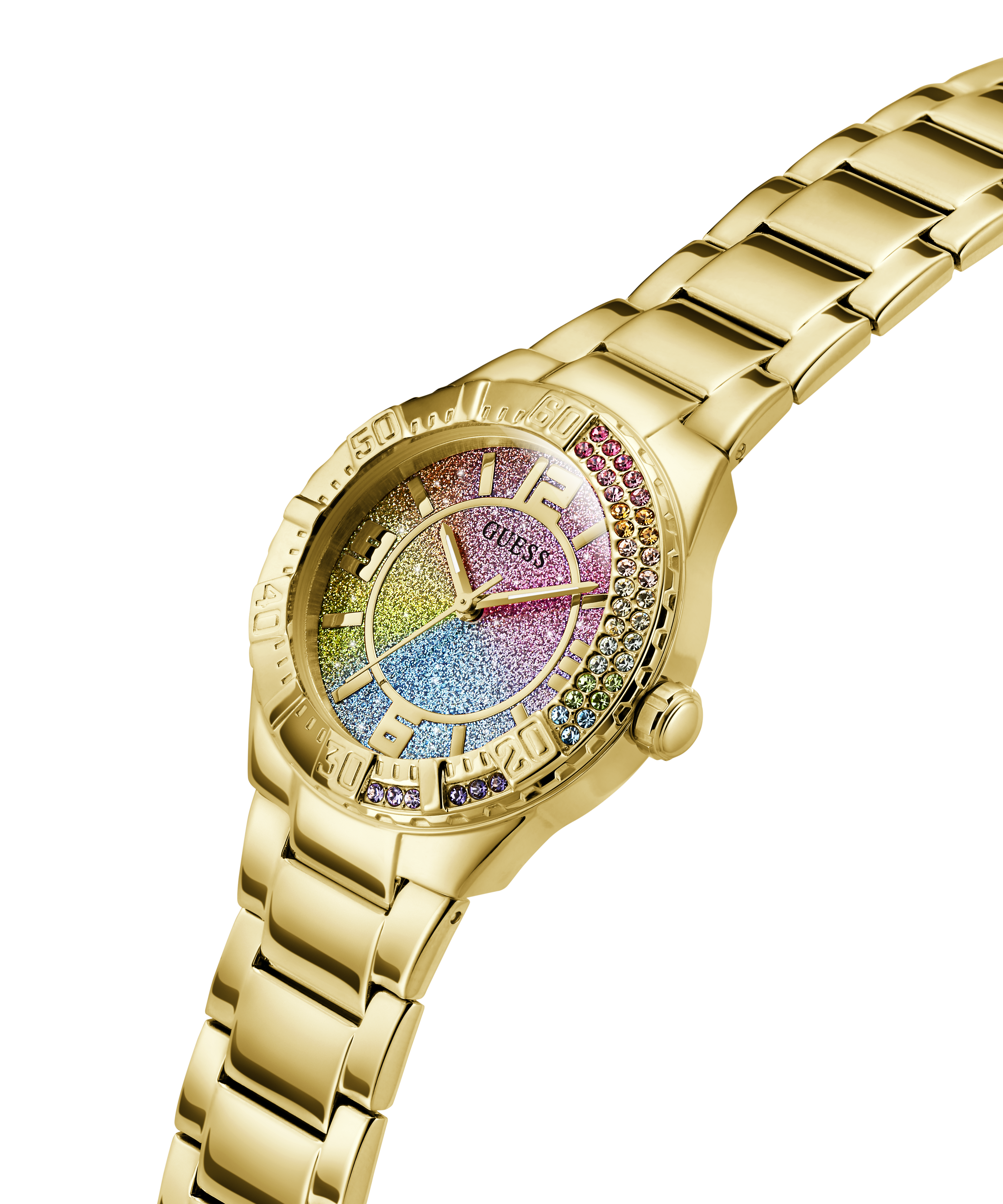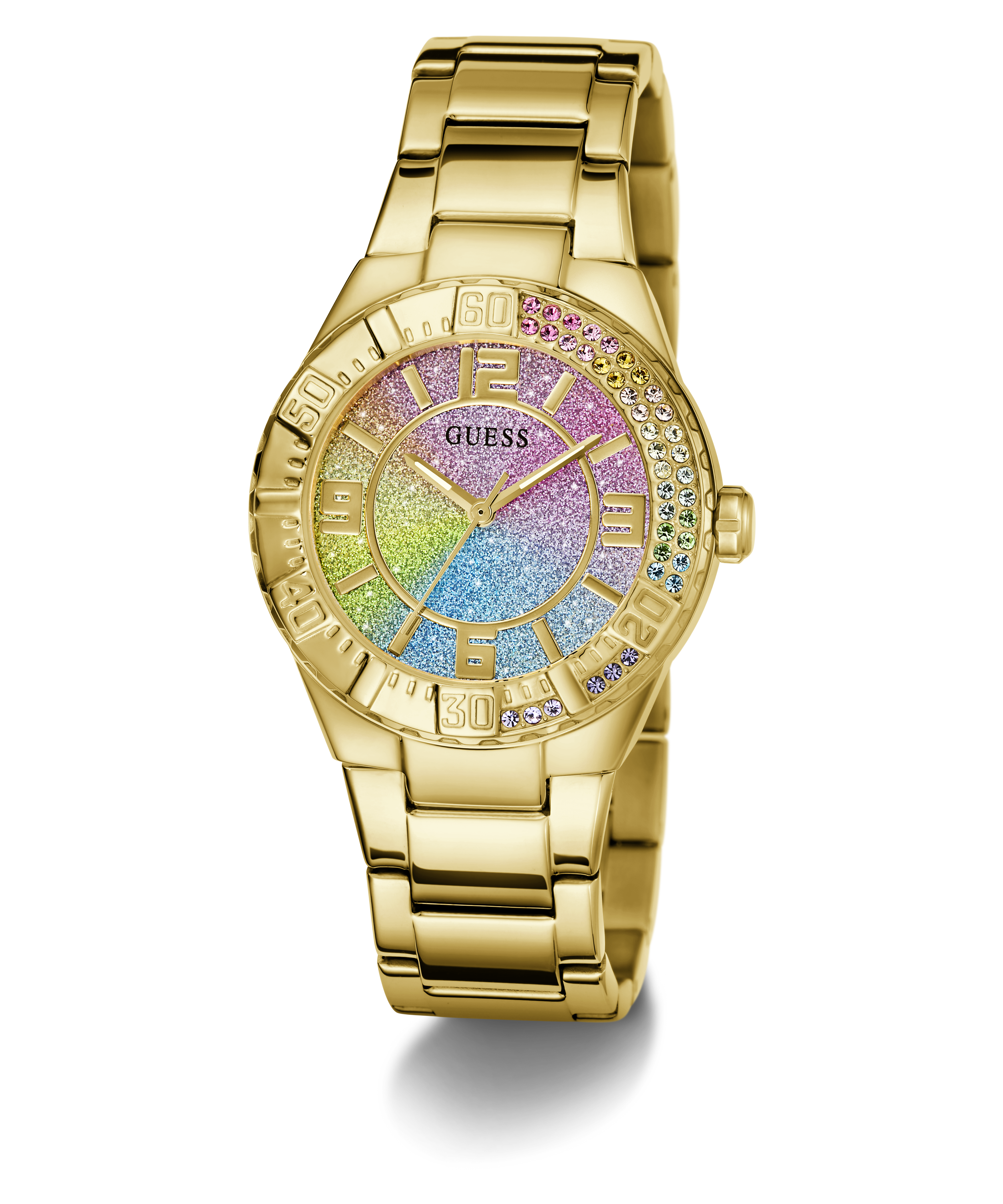 Brighten up your look with this shiny new style featuring a partial crystal bezel and an ombre glitter dial and with a sleek metal bracelet!