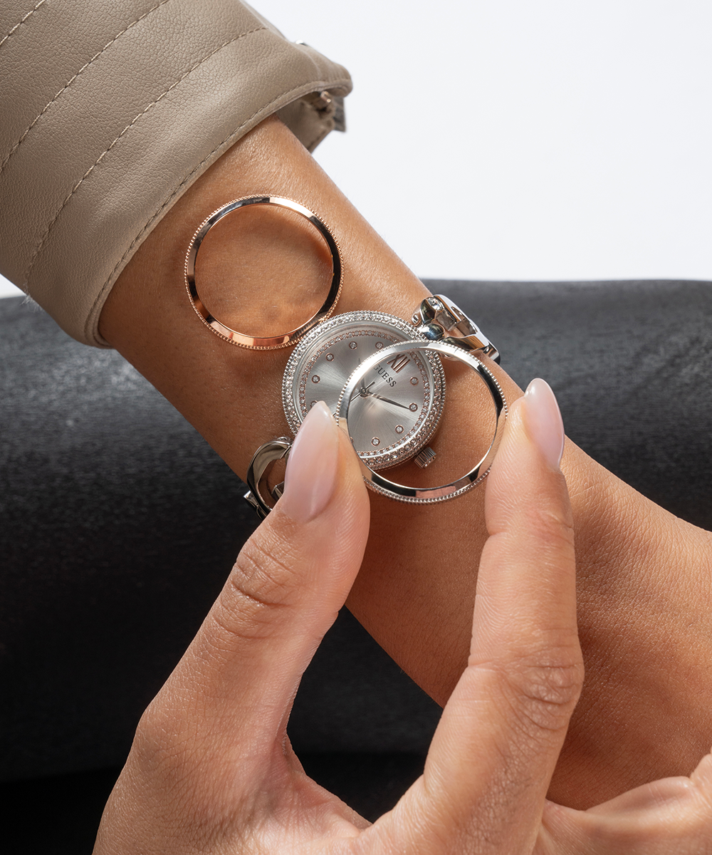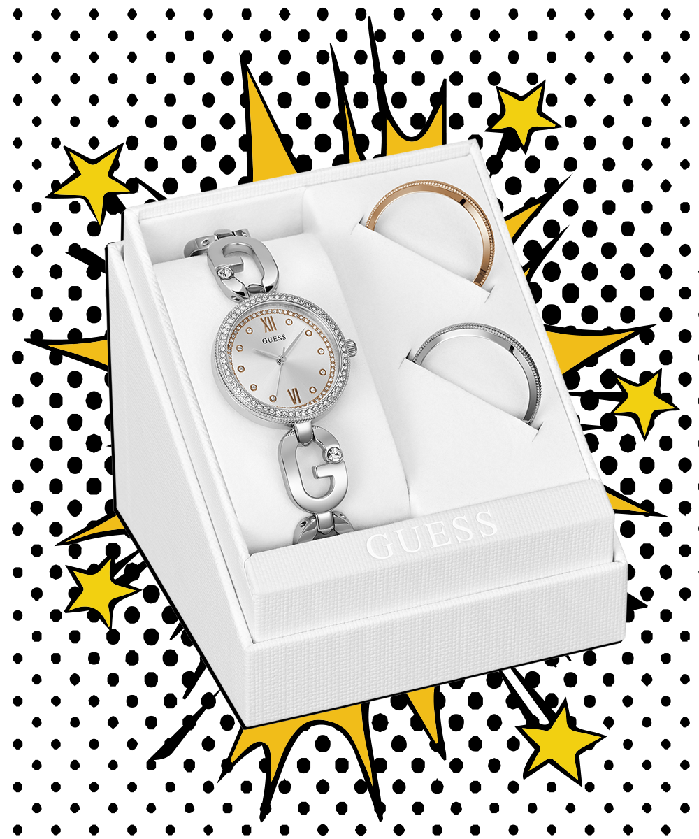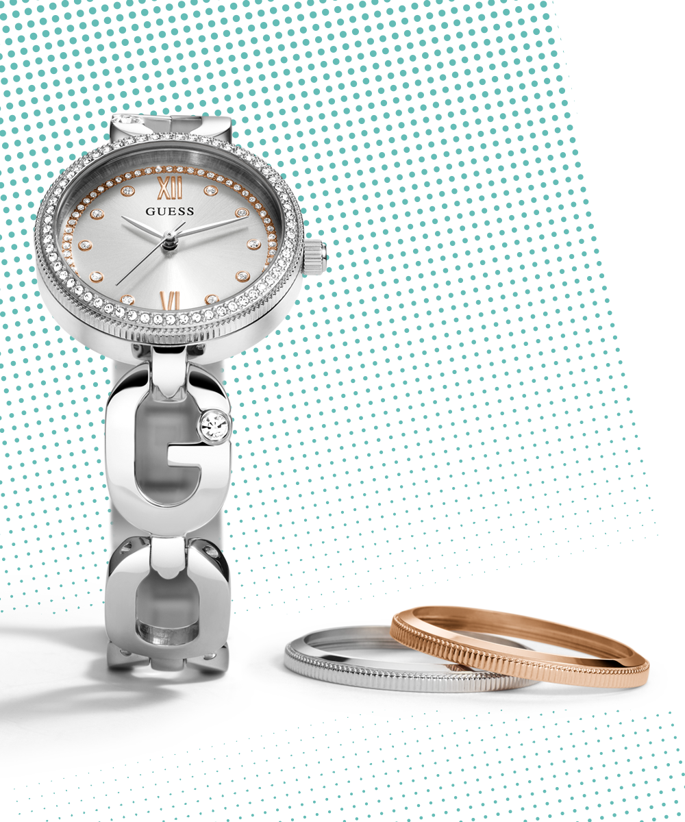 A watch wardrobe that lets you show your love of GUESS in a subtle way with a sculpted 'G' chain connection and a touch of glitz. This special piece features 3 interchangeable bezel options - a clean silver bezel, a crystal silver bezel, and a clean rose gold dial that...