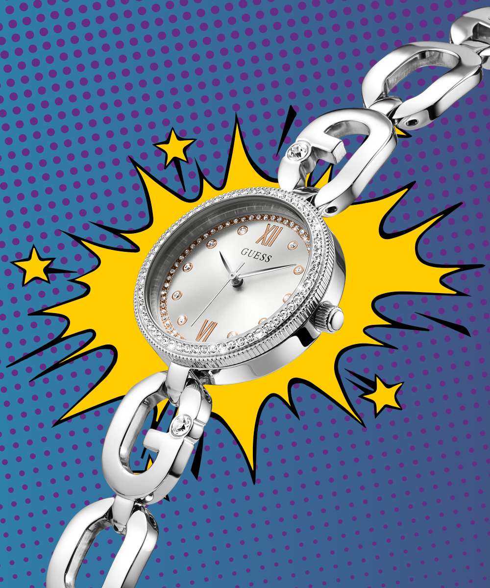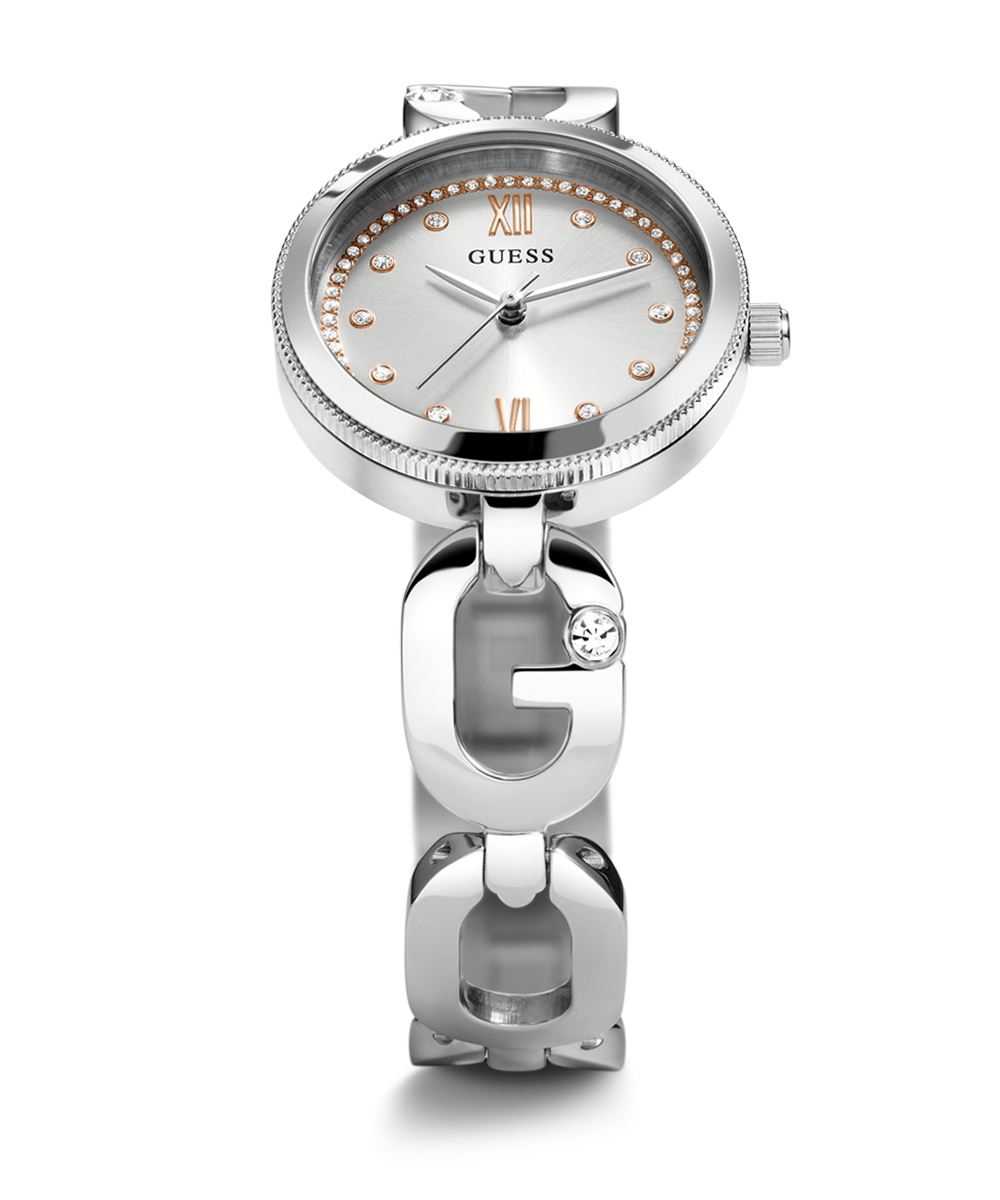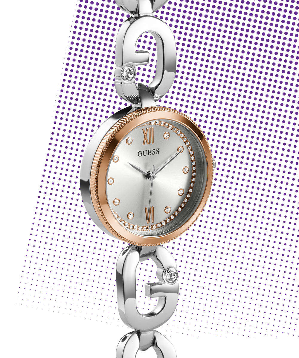 A watch wardrobe that lets you show your love of GUESS in a subtle way with a sculpted 'G' chain connection and a touch of glitz. This special piece features 3 interchangeable bezel options - a clean silver bezel, a crystal silver bezel, and a clean rose gold dial that...
