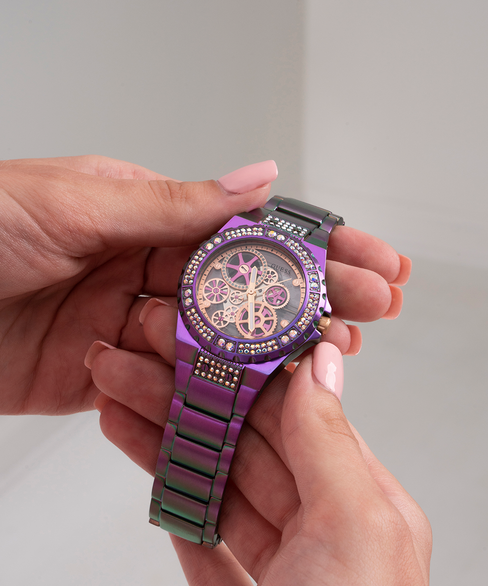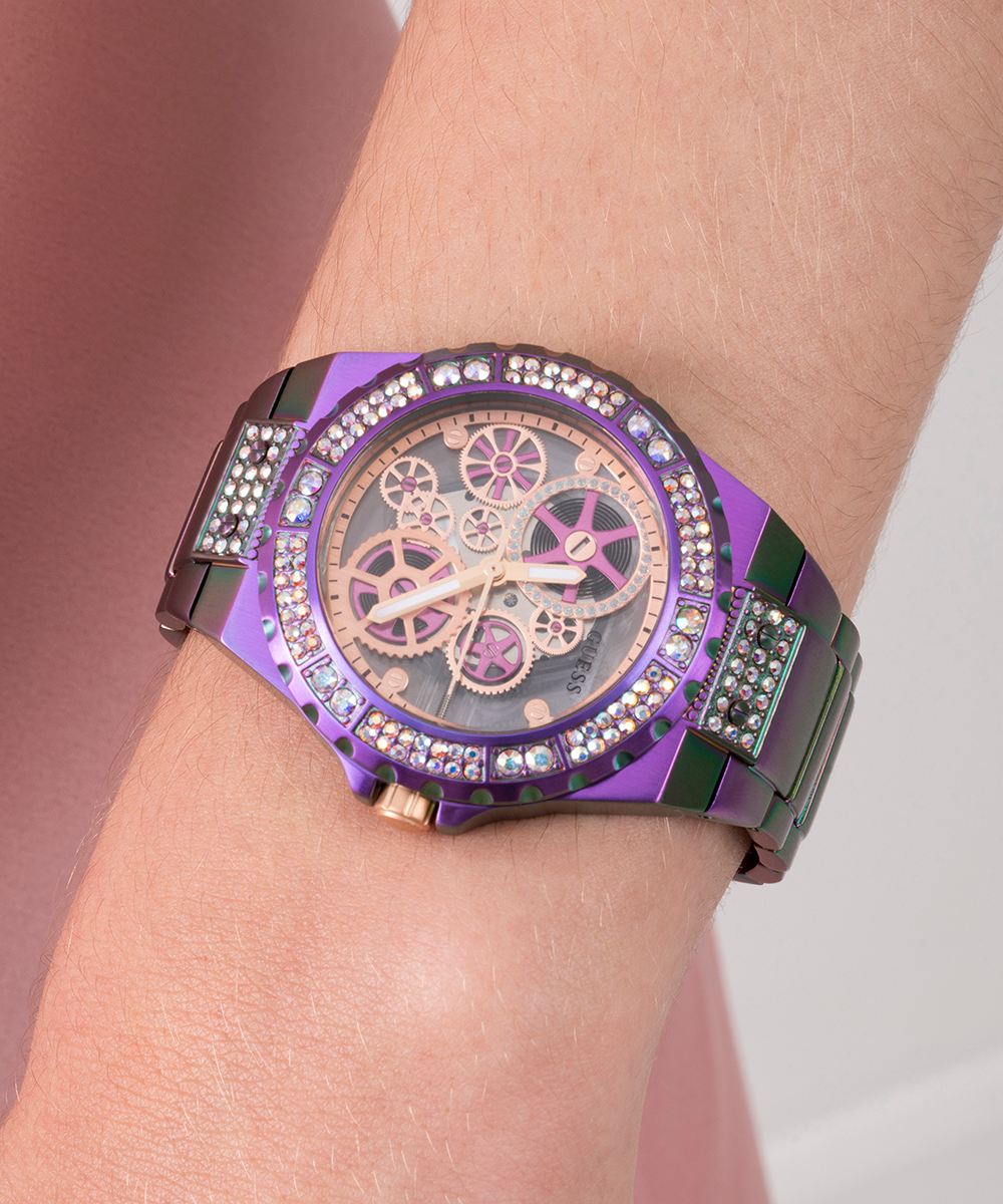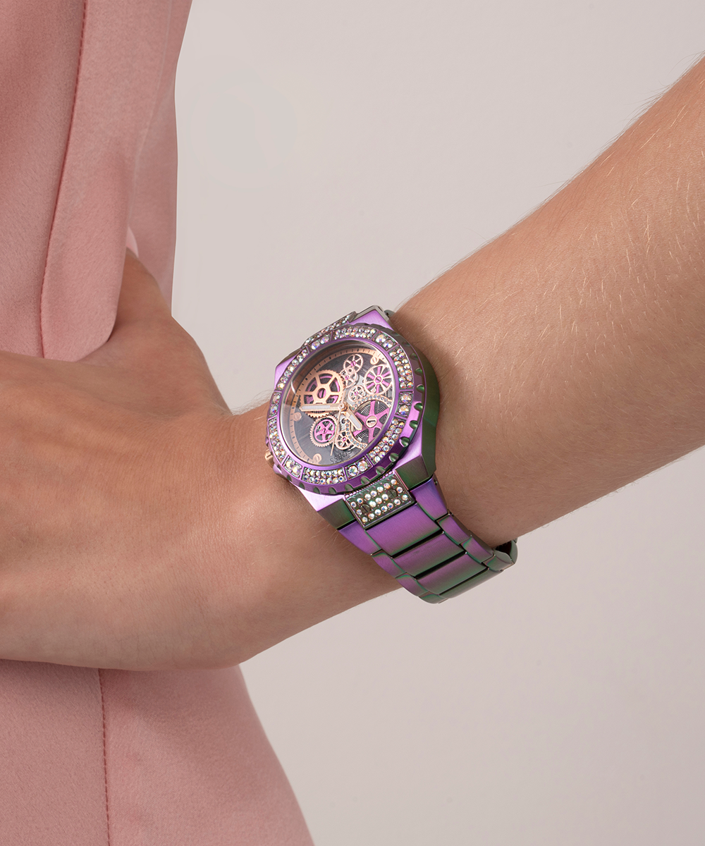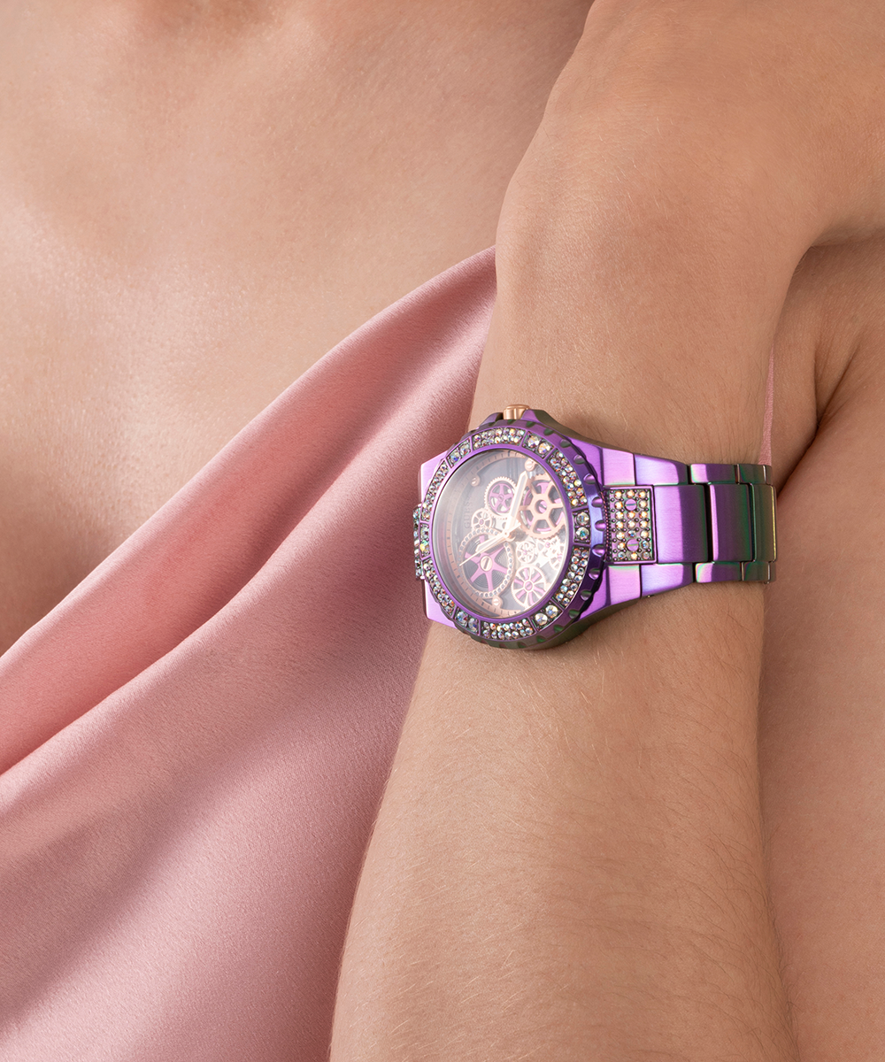 Our biggest reveal yet, this watch features a clear-cut view of both its movement and your wrist and has double the glitz throughout its bezel and bracelet connection with our signature iridescent plating.