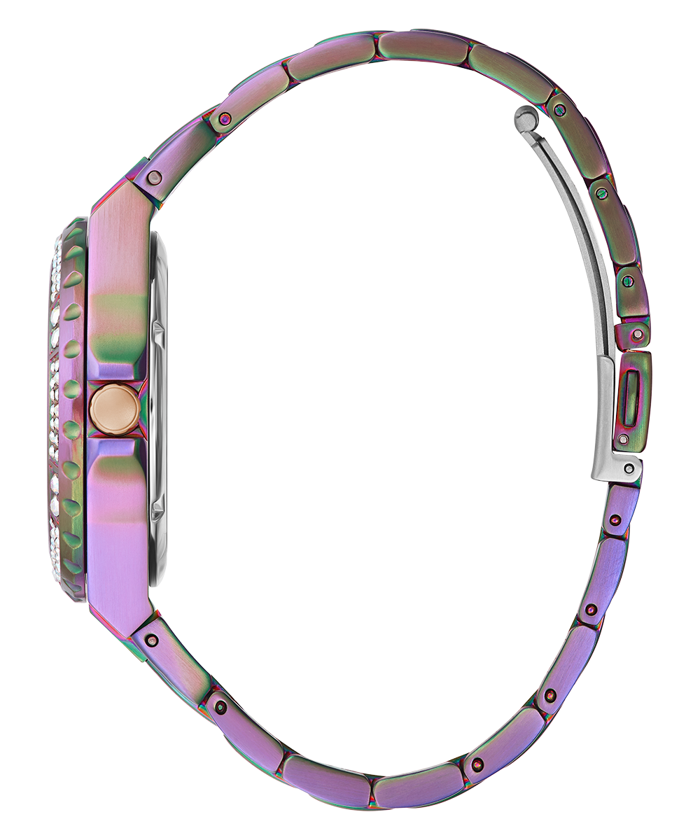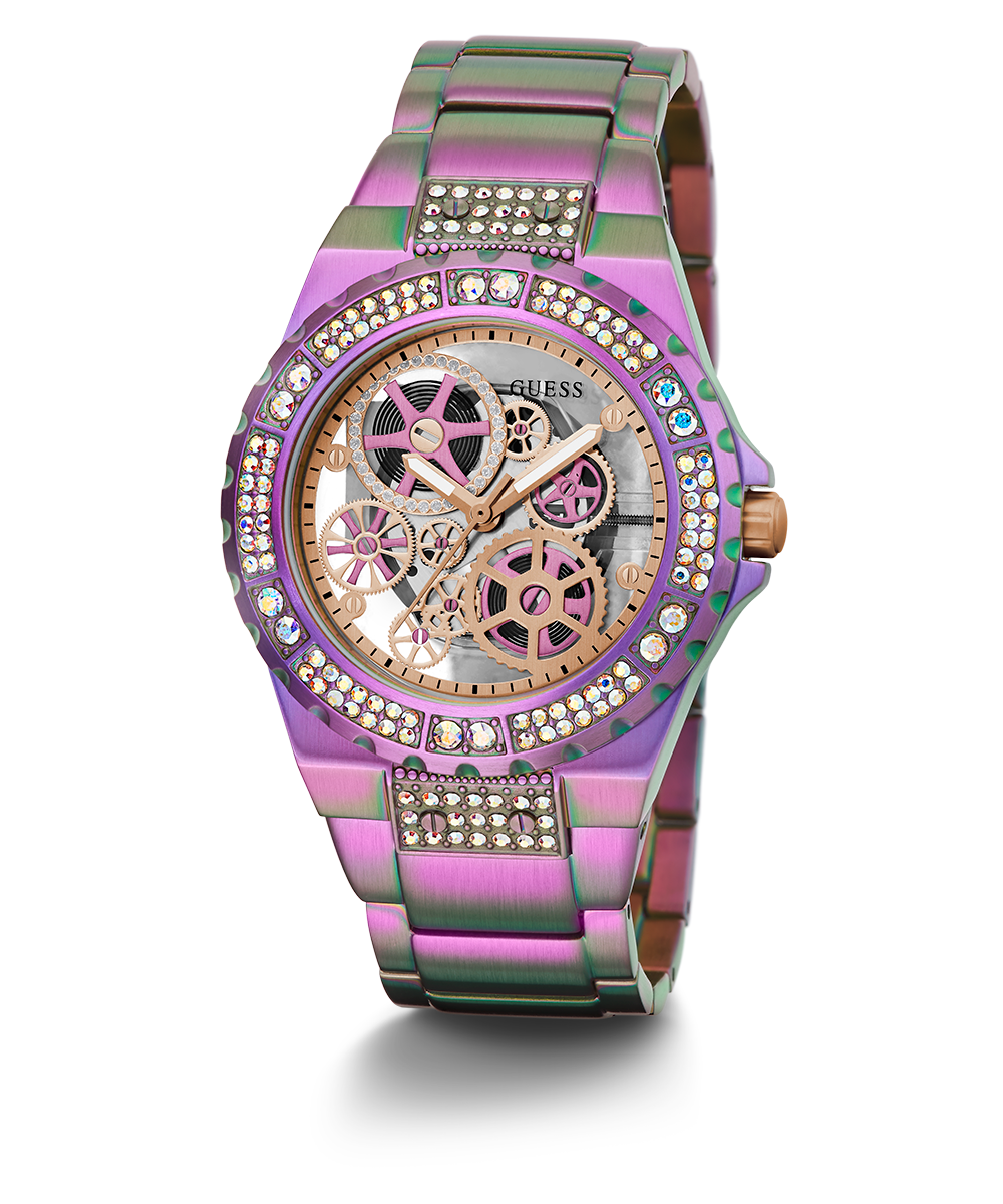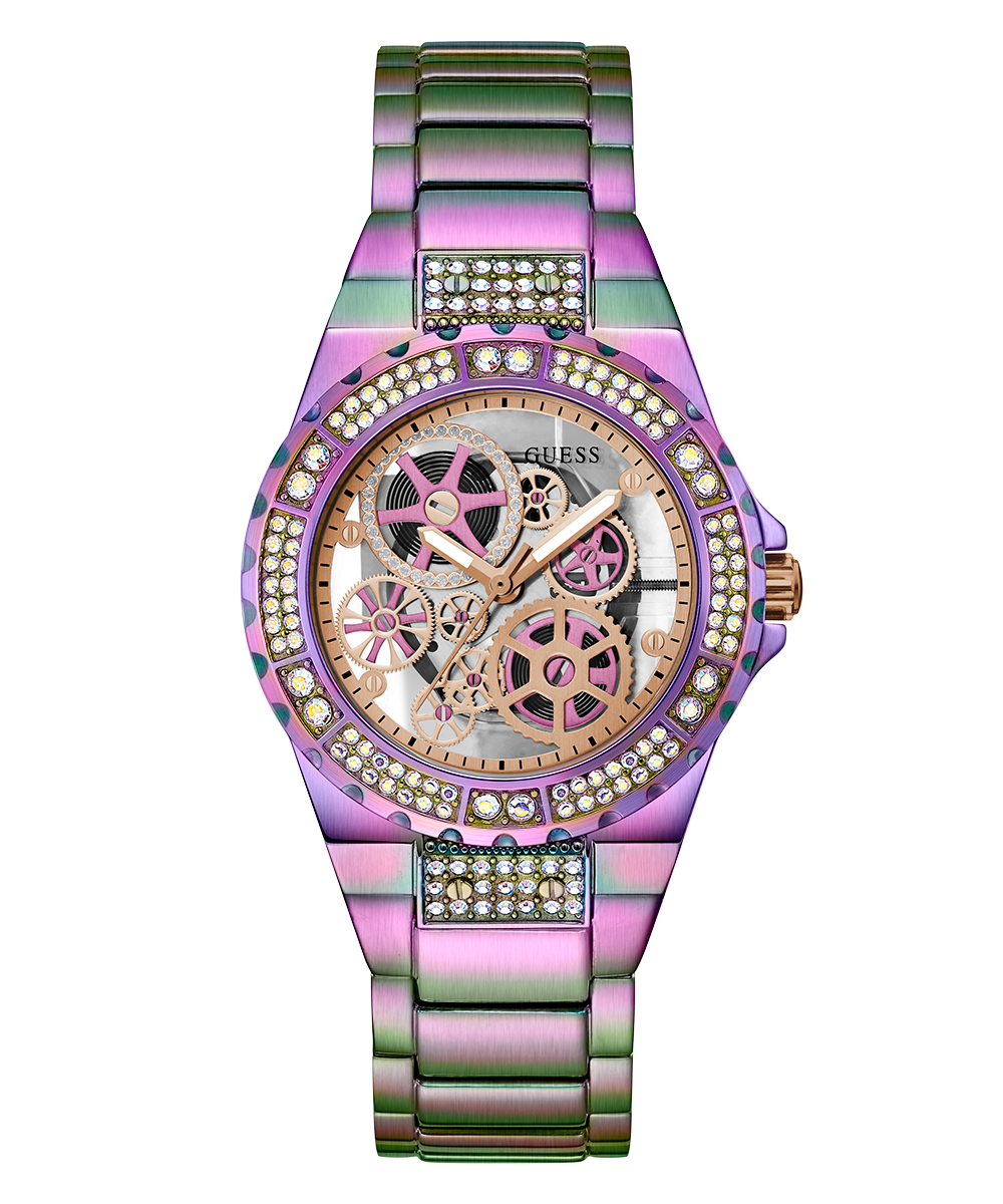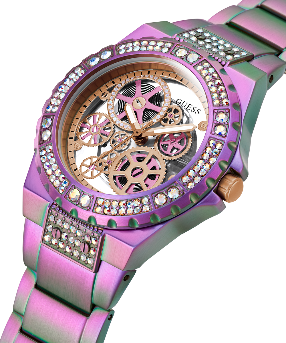 Our biggest reveal yet, this watch features a clear-cut view of both its movement and your wrist and has double the glitz throughout its bezel and bracelet connection with our signature iridescent plating.