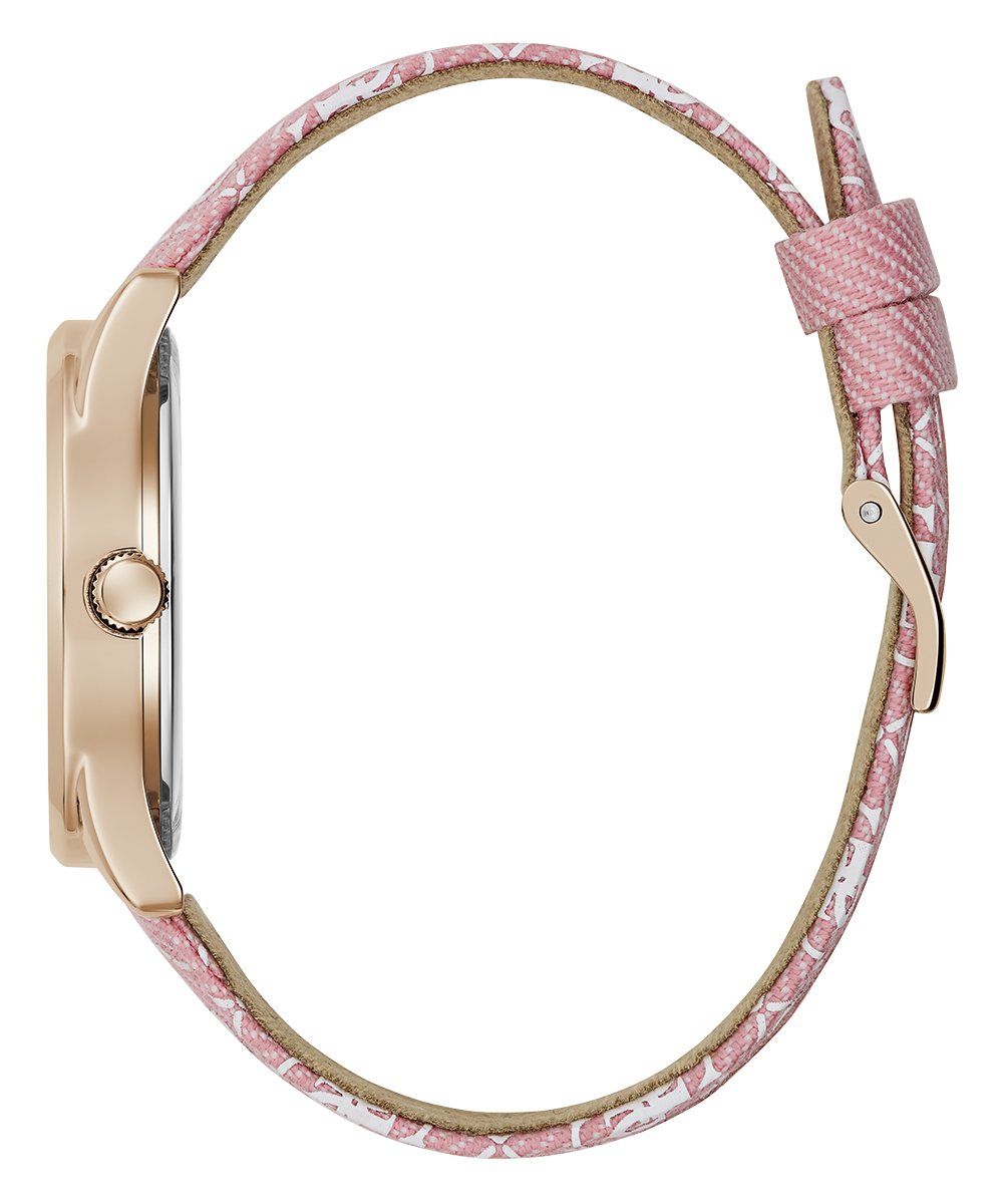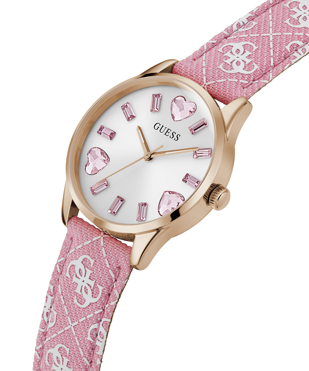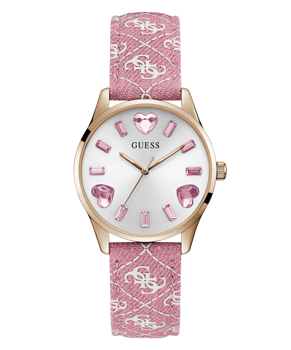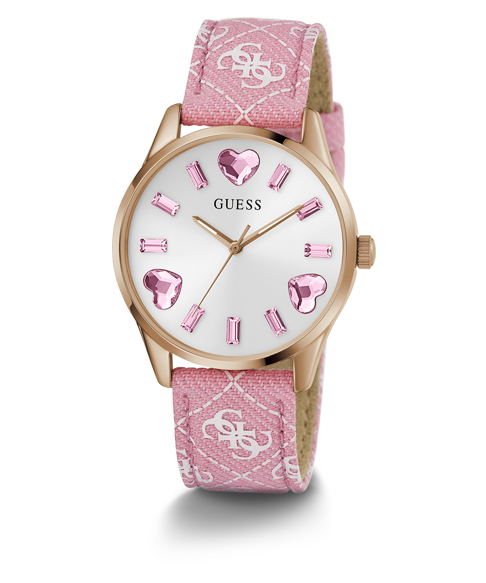 Go to the shopPlayful heart and baguette crystals in rainbow colors are perfectly paired with a quattro G recycled denim leather strap