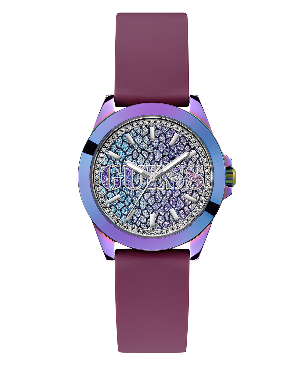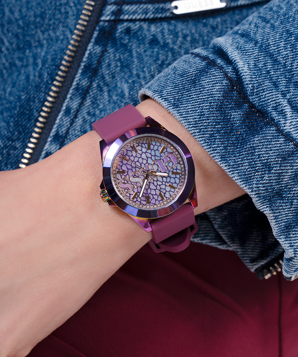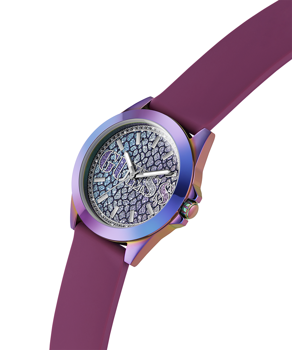 Enter a menagerie with this exotic look. Featuring a bold GUESS logo on the dial with a glitzed out digitally printed python pattern, this look is sure to pop in your watch wardrobe.