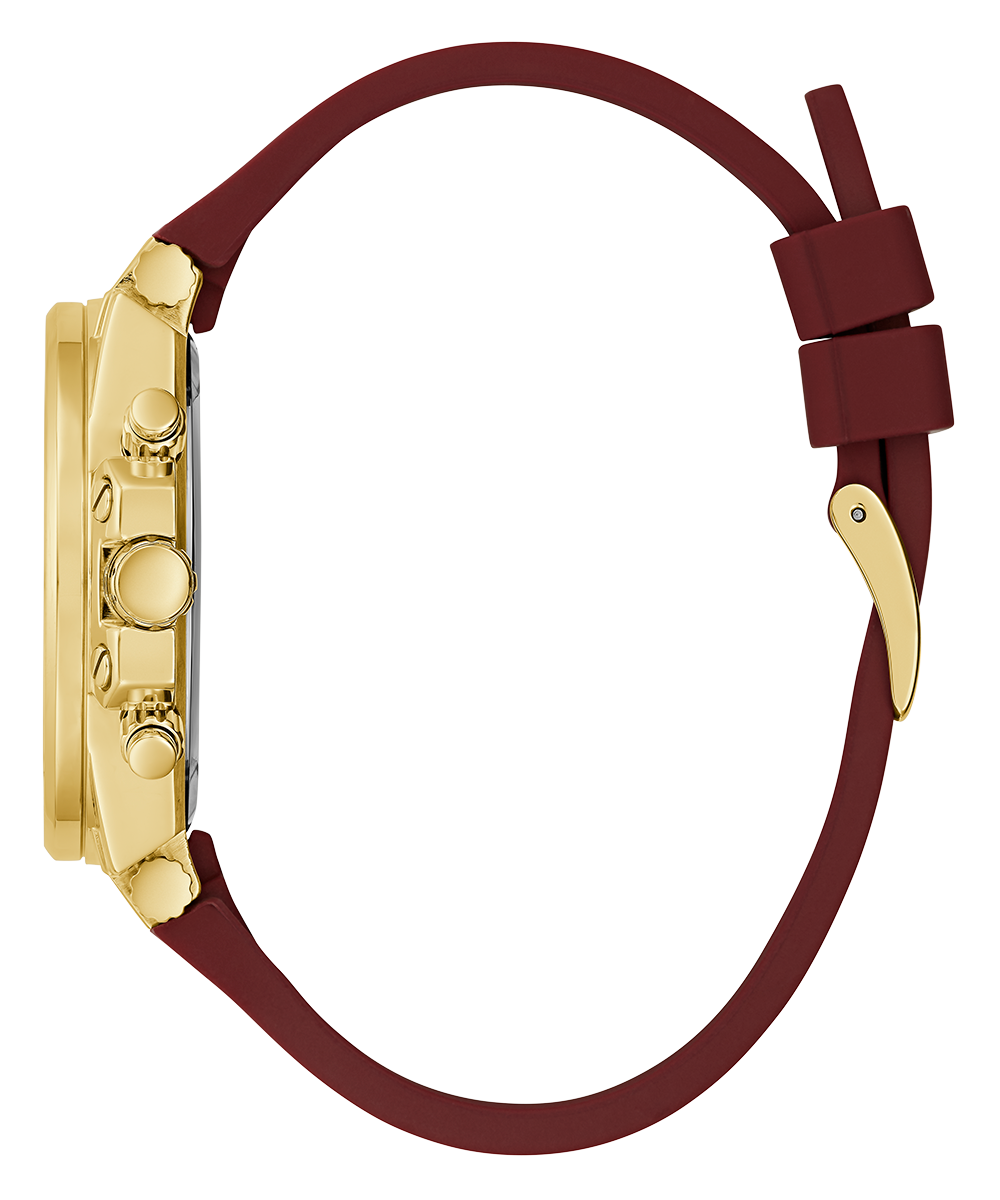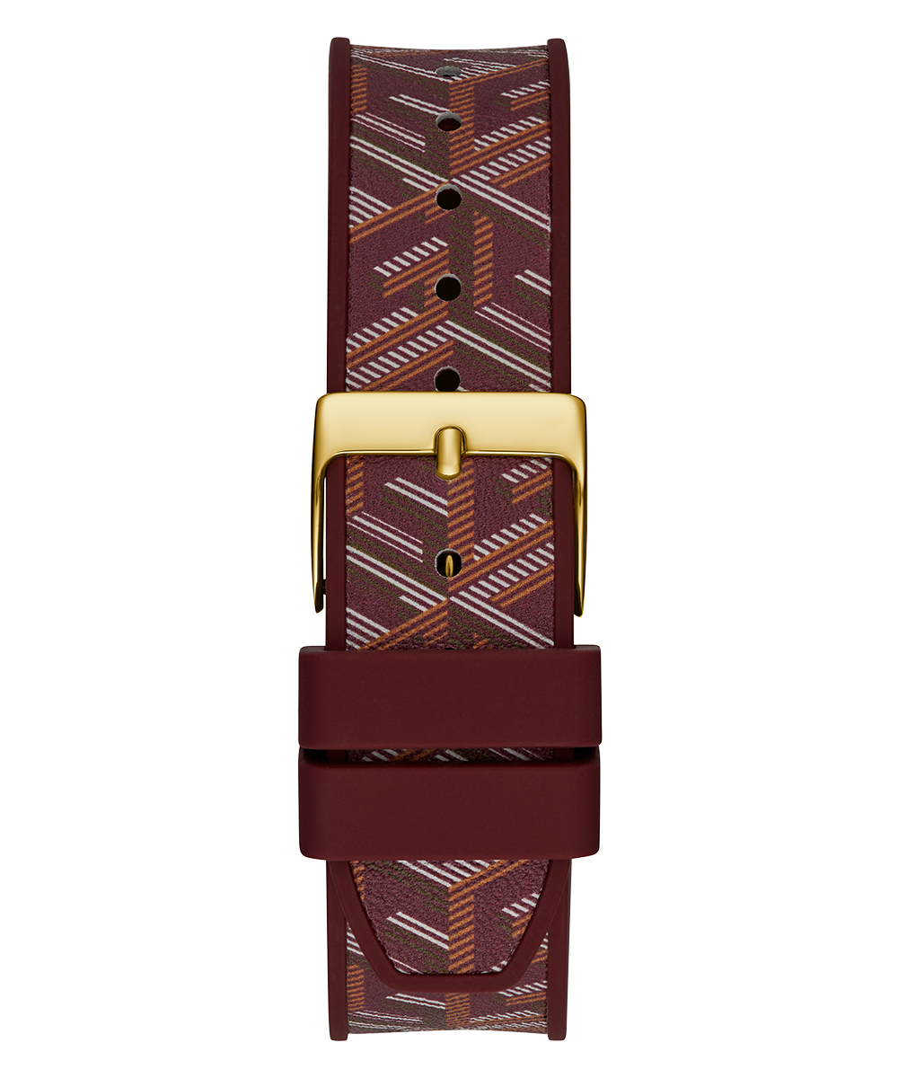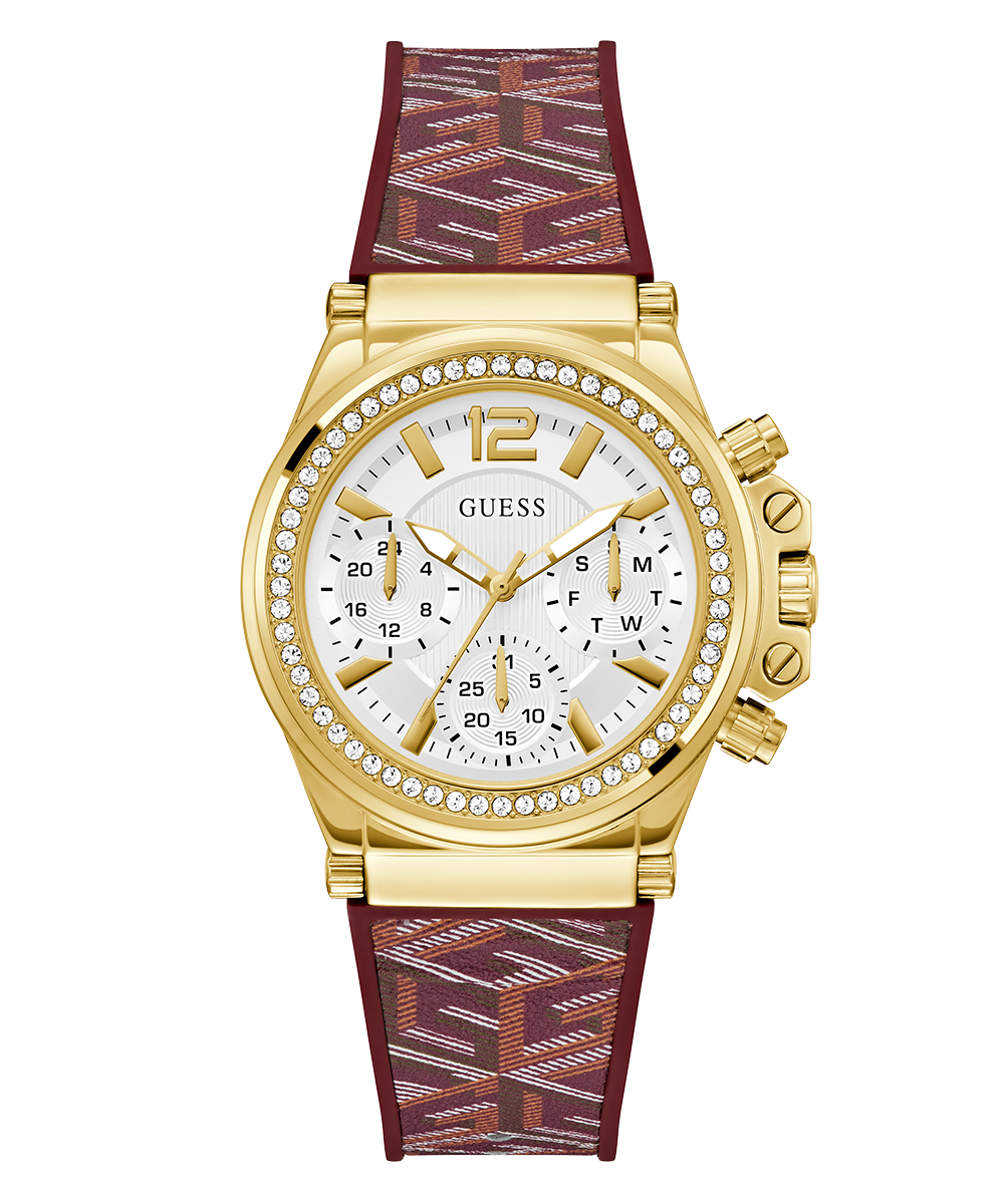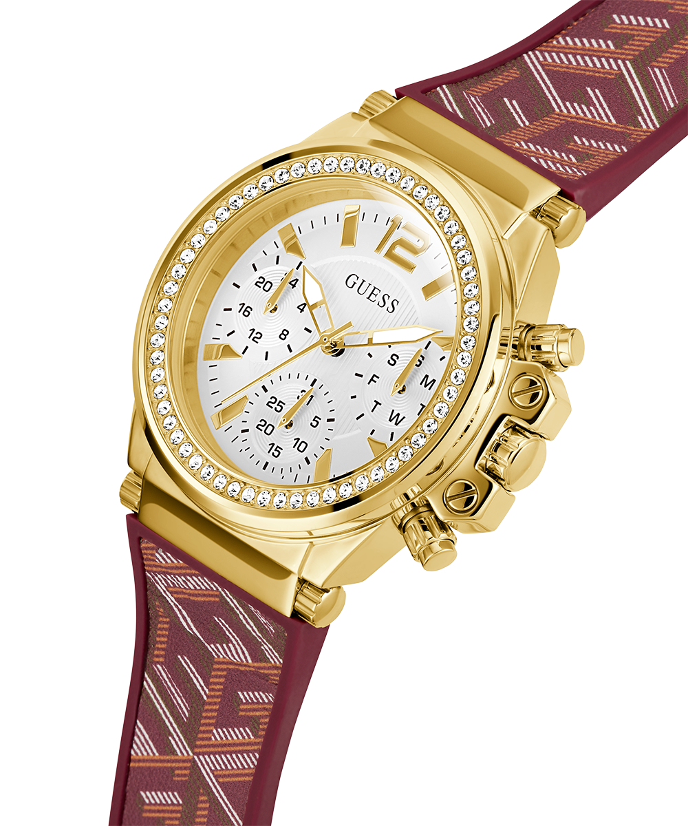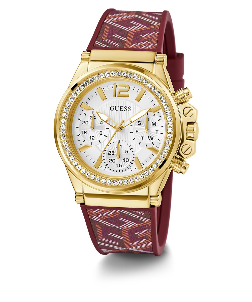 Go to the shopA charismatic look with elegant crystal details paired with a chrono-look multi-function movement and paired with a flexible silicone with G Cube pattern leather strap