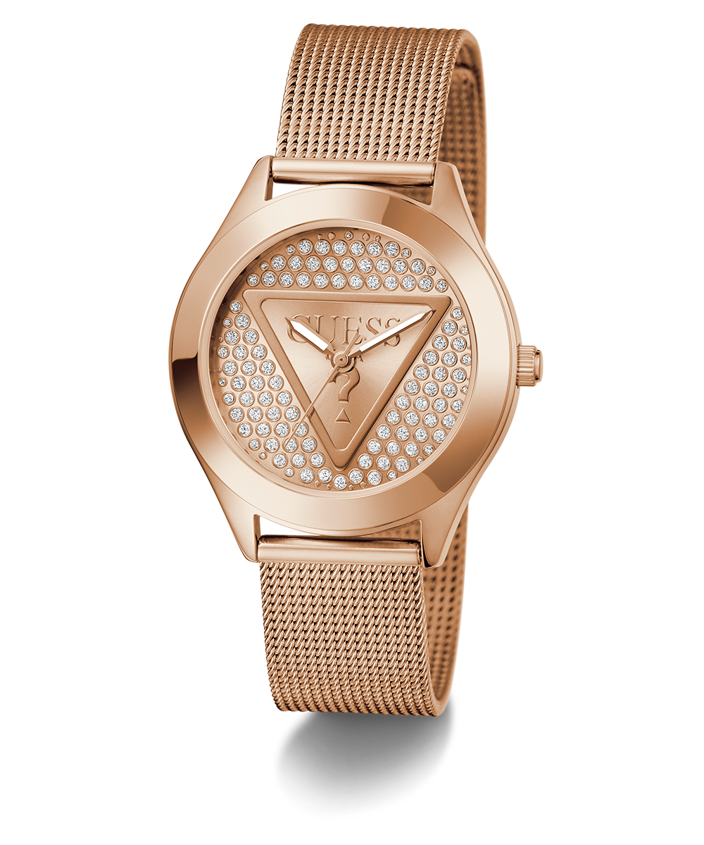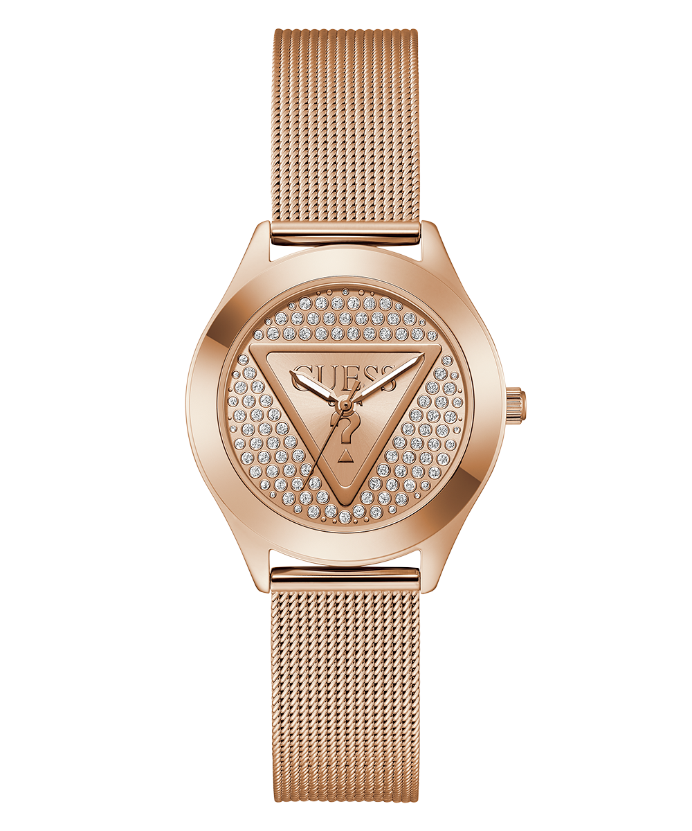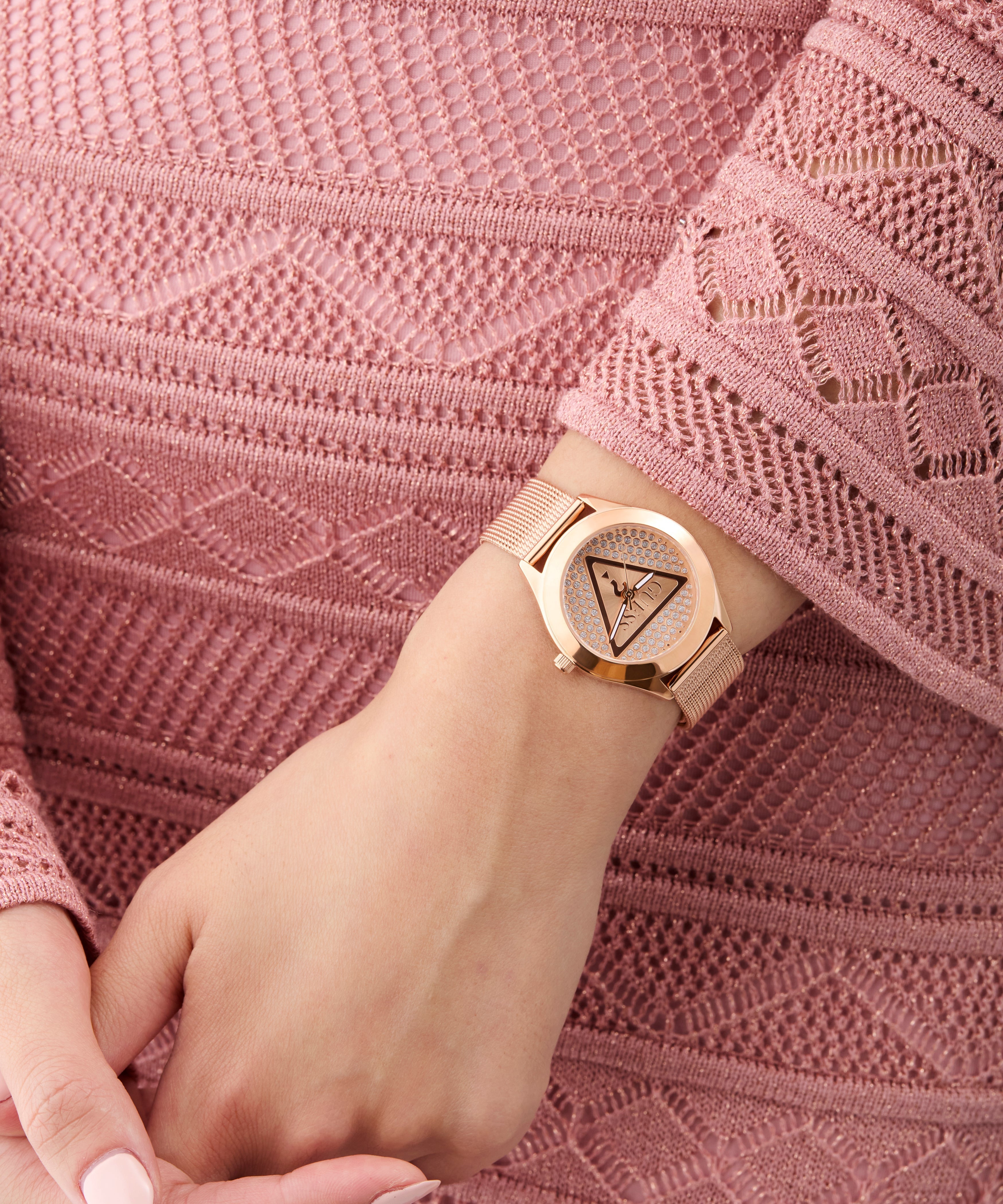 Go to the shopSure to be a staple in your watch wardrobe, this style features a polished case with a glitzed out dial and a triangle logo plaque. Paired with a sleek self-adjustable mesh bracelet.