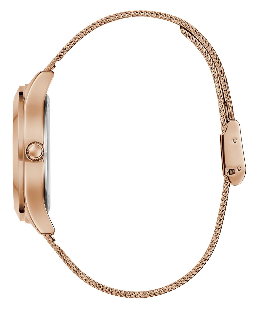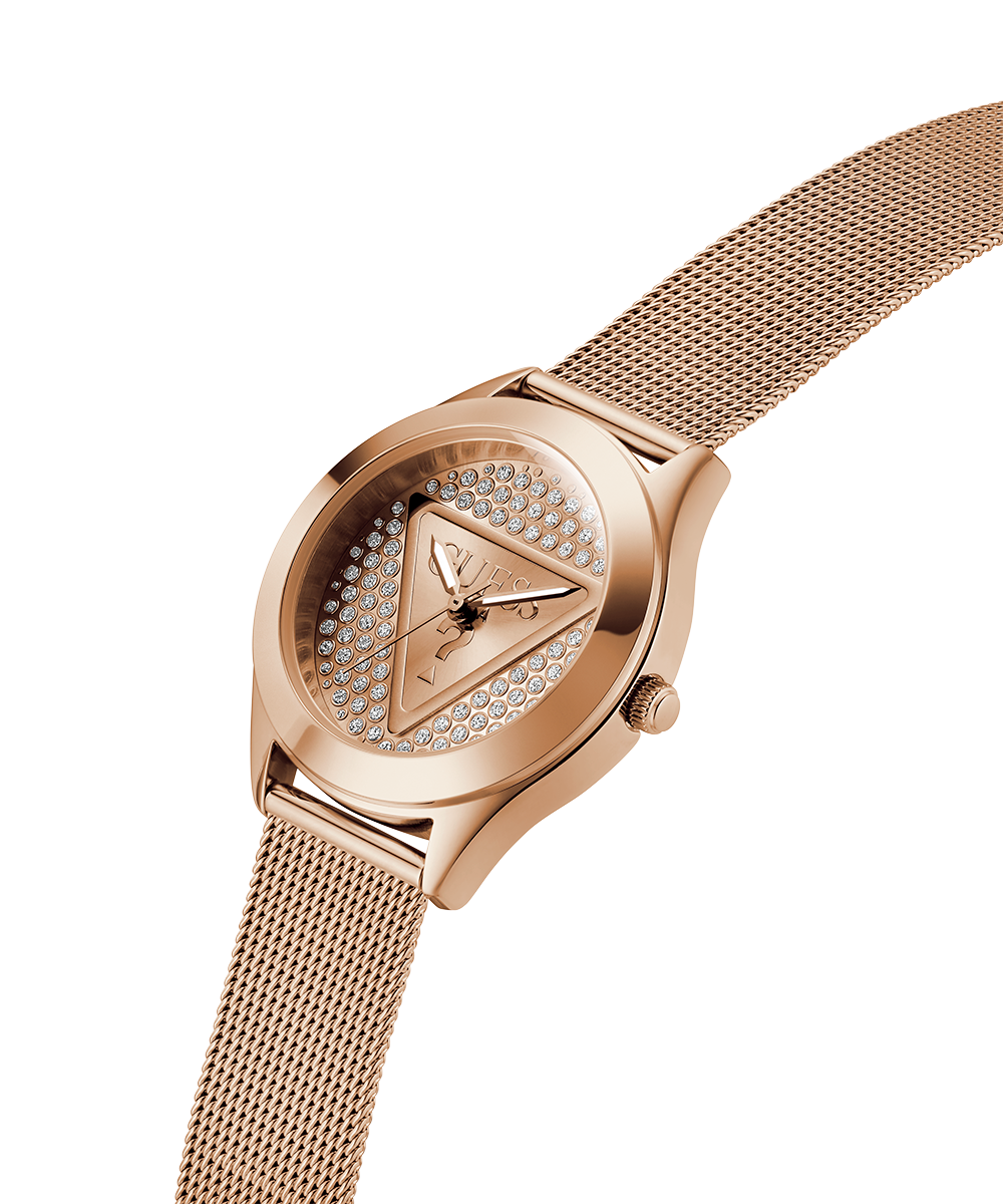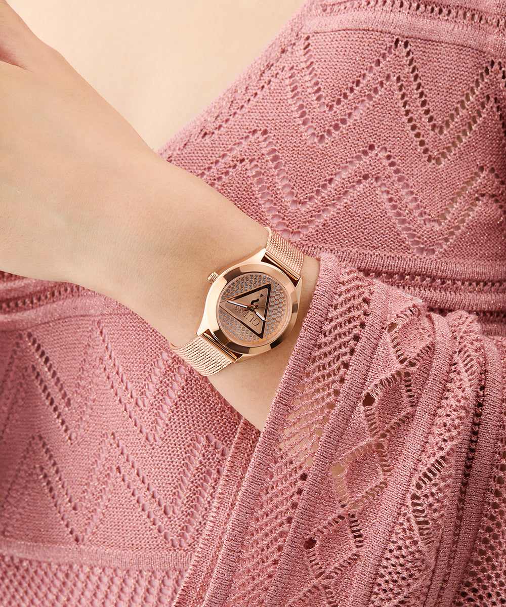 Go to the shopSure to be a staple in your watch wardrobe, this style features a polished case with a glitzed out dial and a triangle logo plaque. Paired with a sleek self-adjustable mesh bracelet.