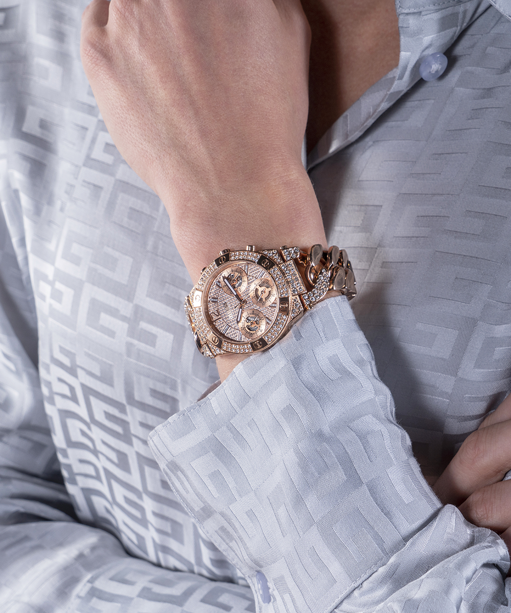Show stopping crystal details combined with an edgy chain give this style the ultimate look! Featuring a cut thru chrono-look multi-function dial and oversized stones on both the bezel and chain links as well as screw details