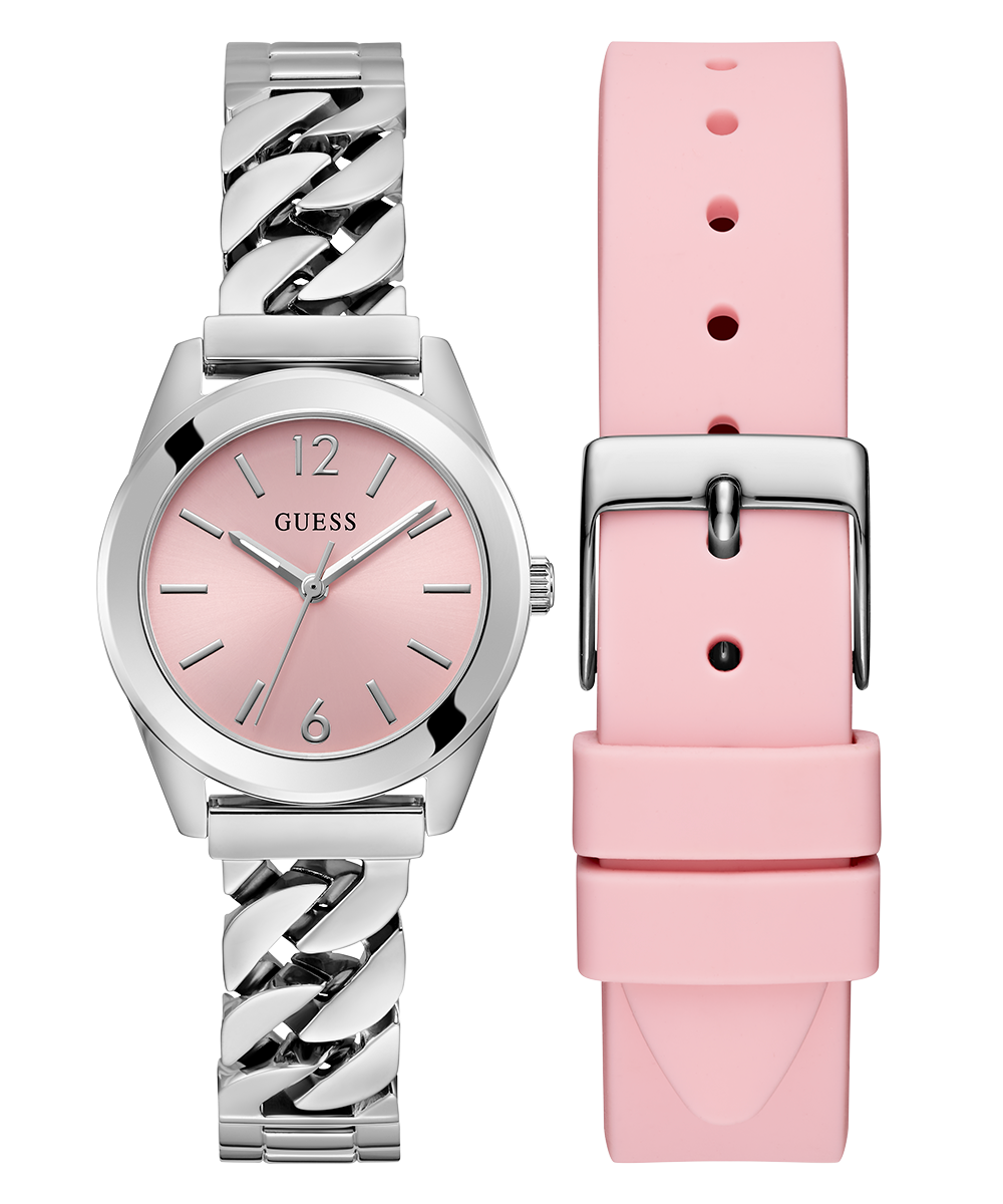 This striking style has all the elegance of a bracelet chain with the added benefit of time-telling in this unique watch design with smooth bezel and chain links, complete with self-adjustable g-links. Its silver bracelet is interchangeable with a pink smooth silicone strap.