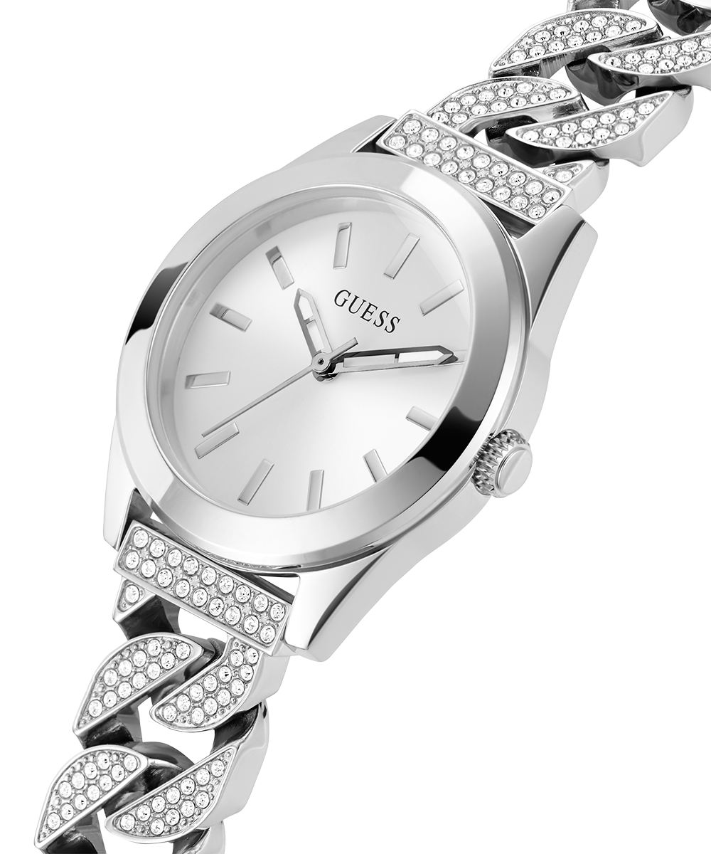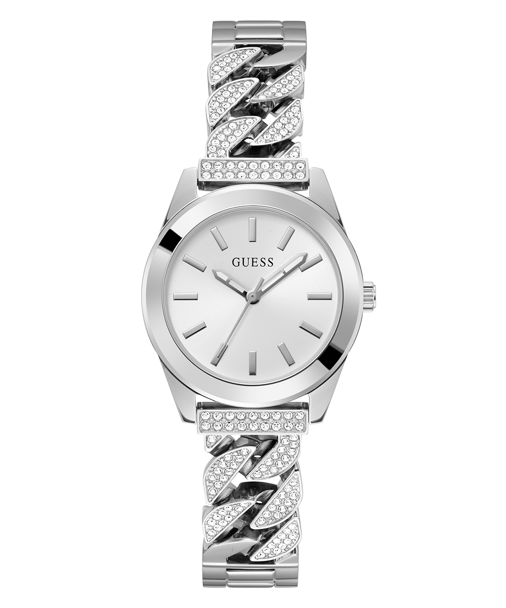 This striking style has all the elegance of a bracelet chain with the added benefit of time-telling in this unique watch design with smooth bezel and full crystal chain links, complete with self-adjustable g-links.