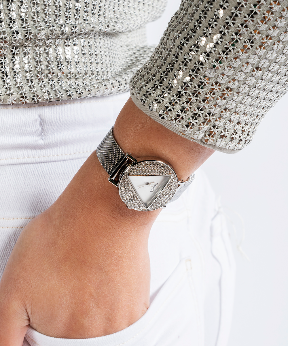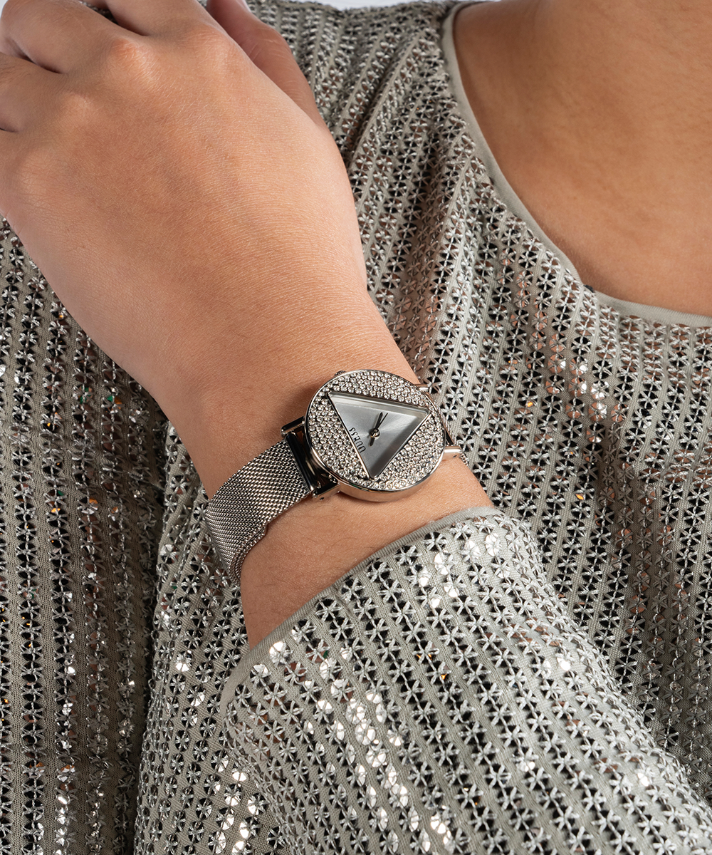 A mini version of a classic look this cute new style features a triangle cutout on the lens surrounded by glitz powder paired with a sleek self-adjustable mesh bracelet.