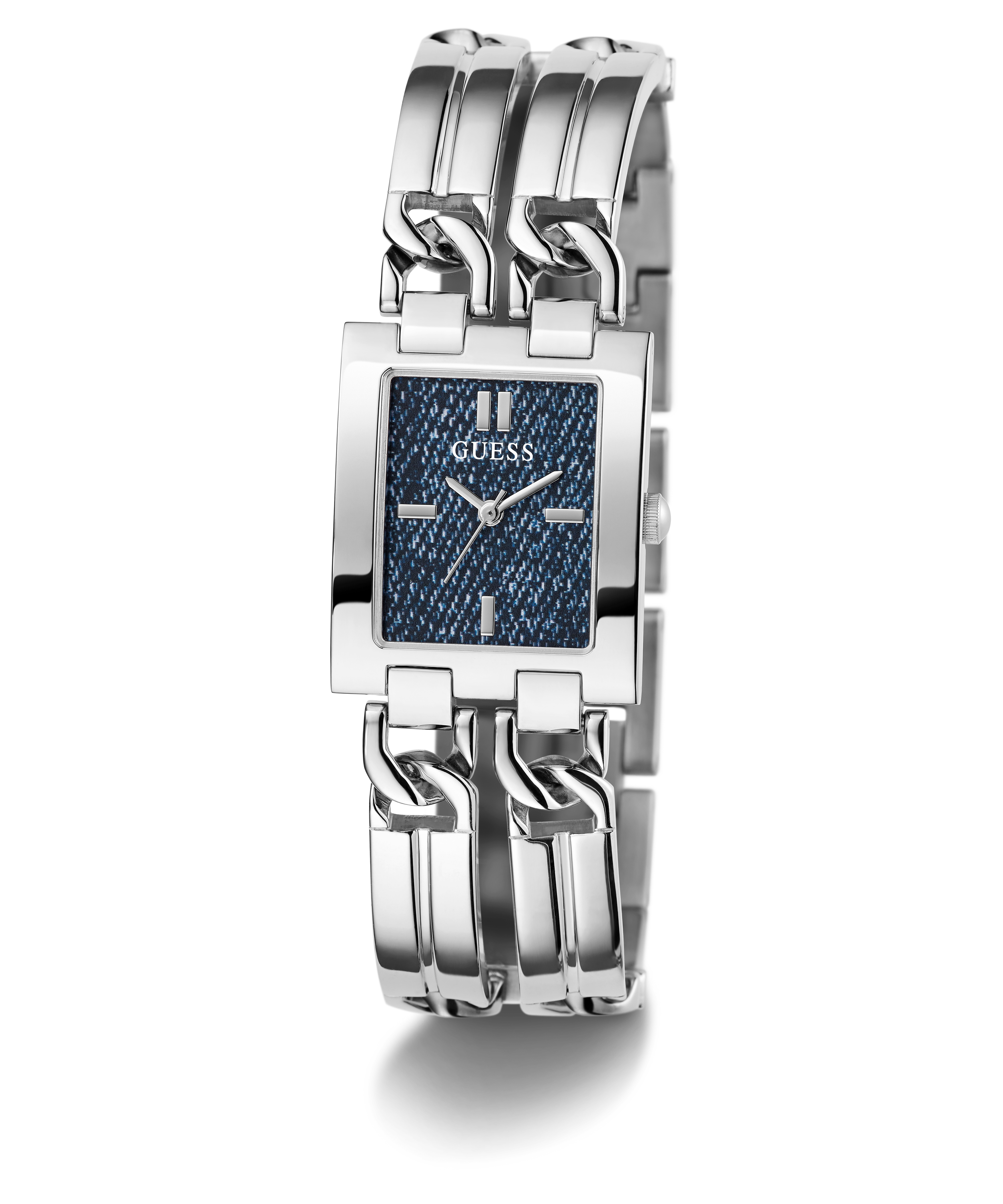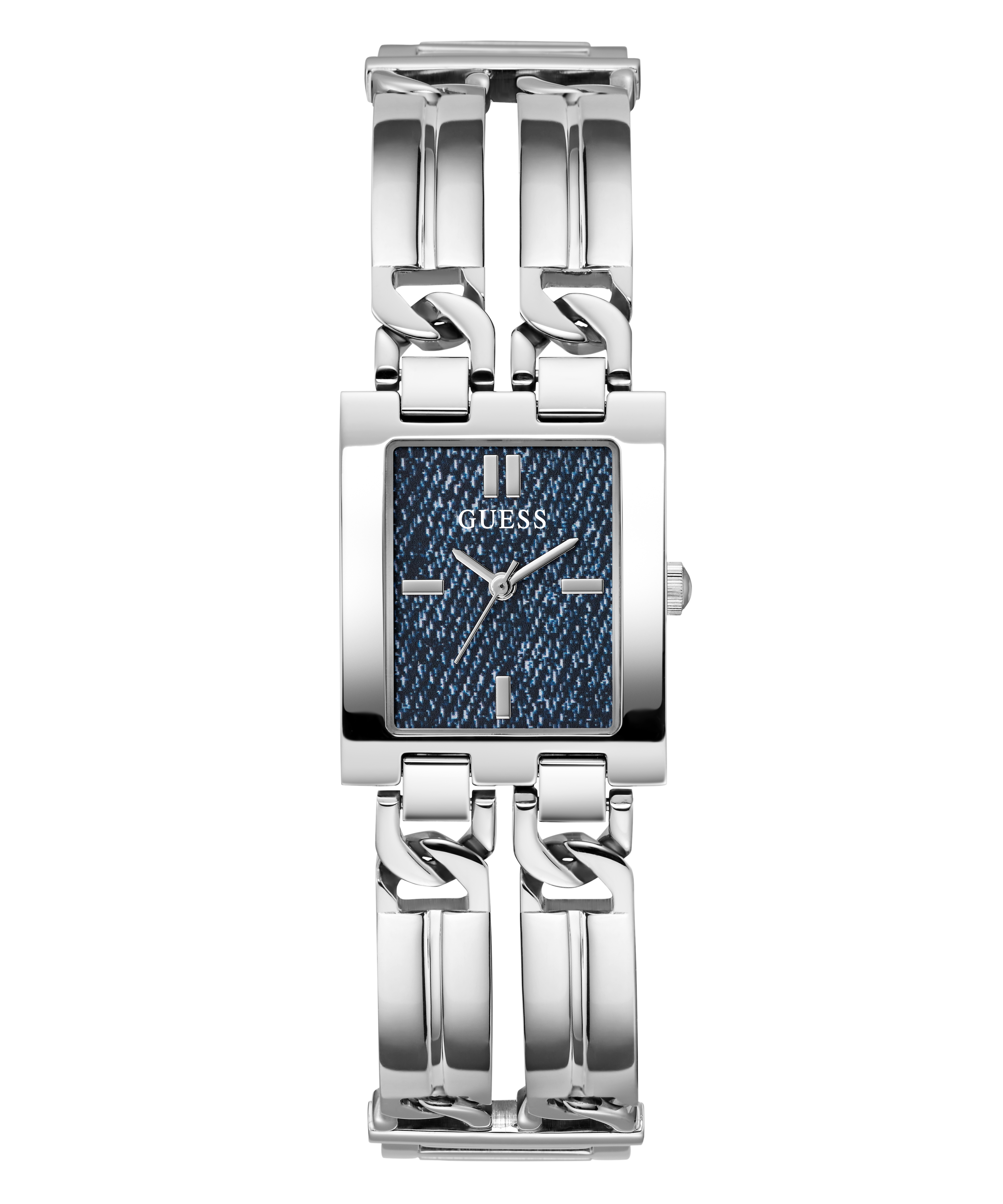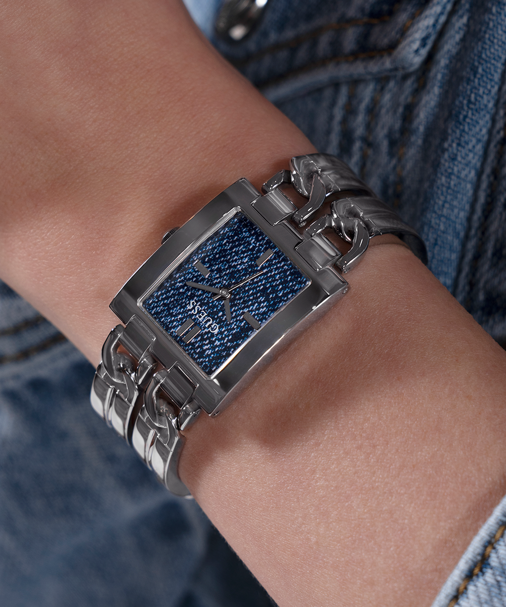 A fresh update to a classic style this look features a sleek ID chain and a digitally printed denim dial. Self-adjustable g-links make this piece easy to size. Great on its own or layered with other jewelry!