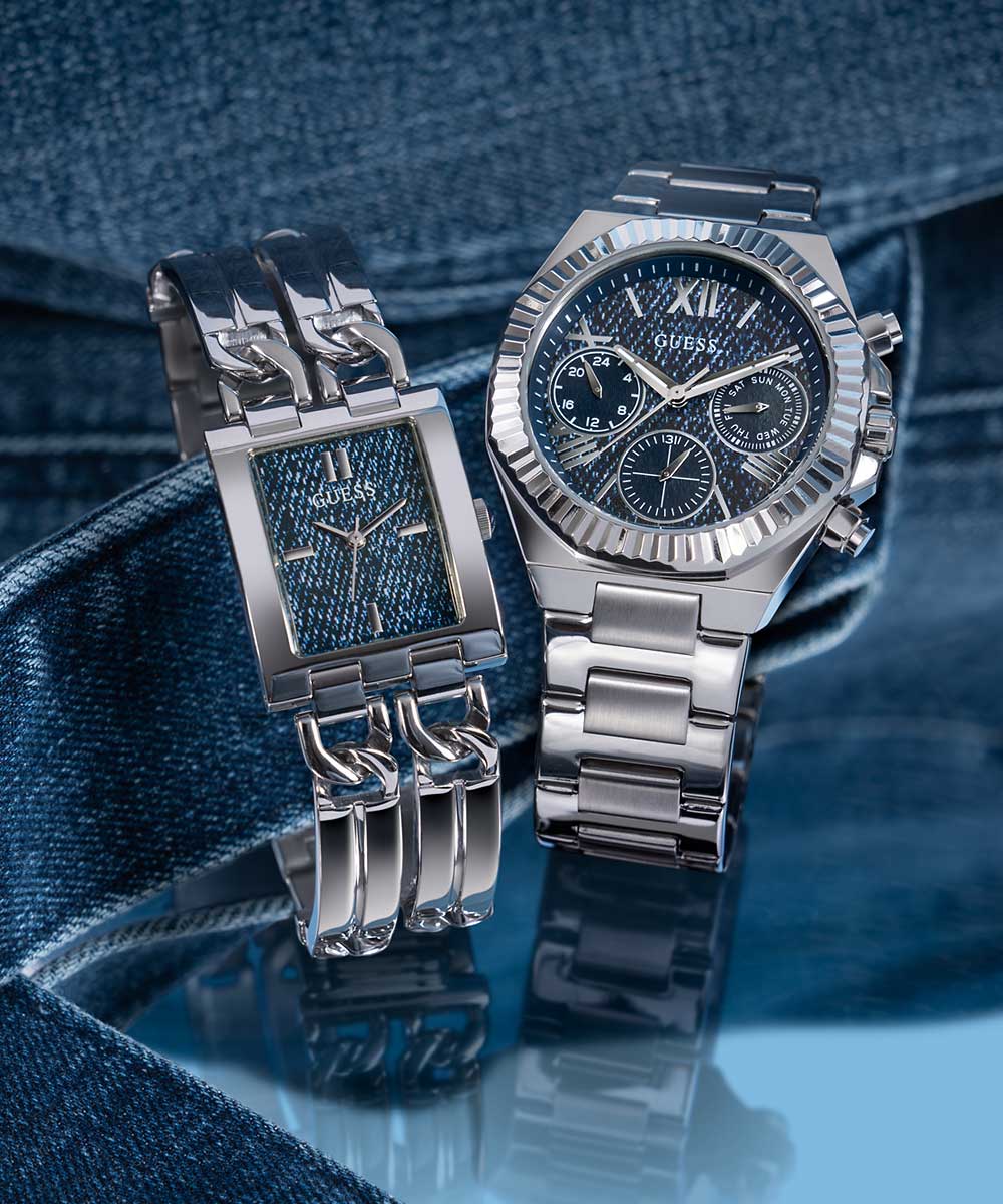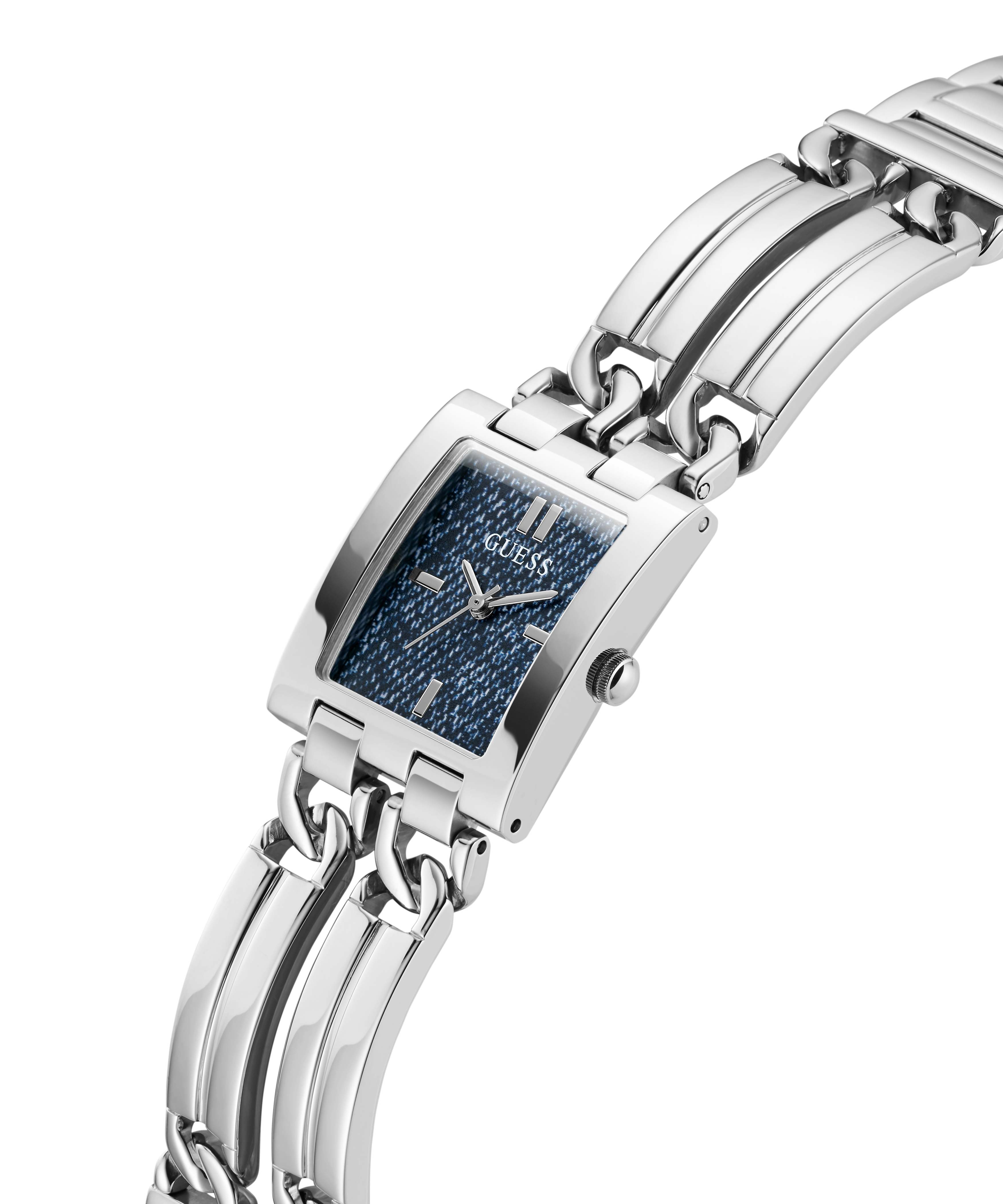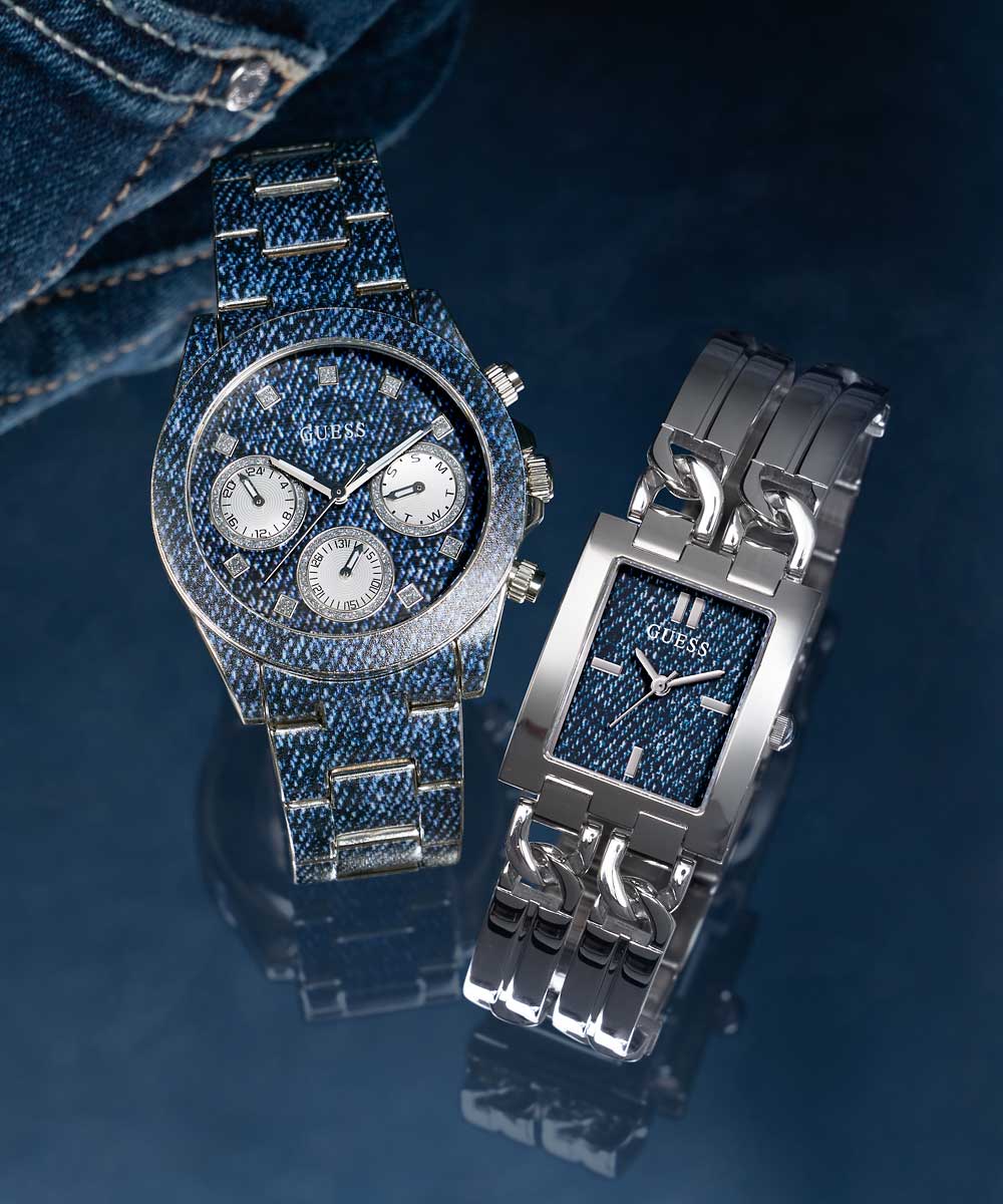 A fresh update to a classic style this look features a sleek ID chain and a digitally printed denim dial. Self-adjustable g-links make this piece easy to size. Great on its own or layered with other jewelry!