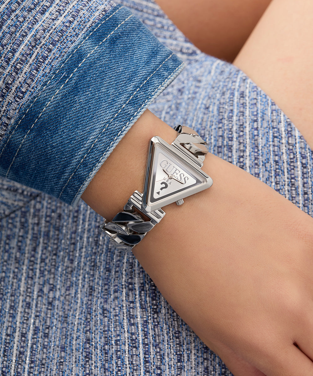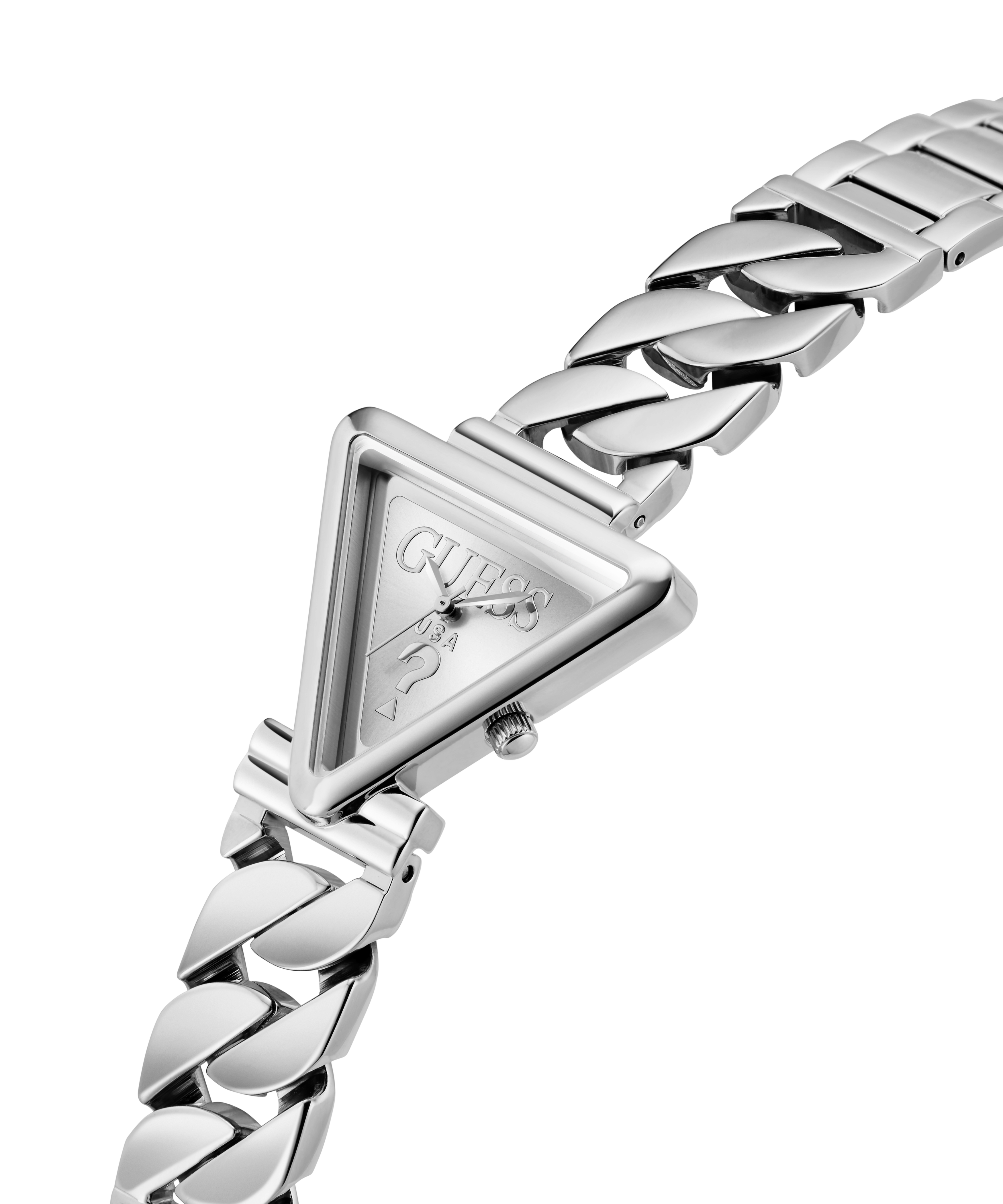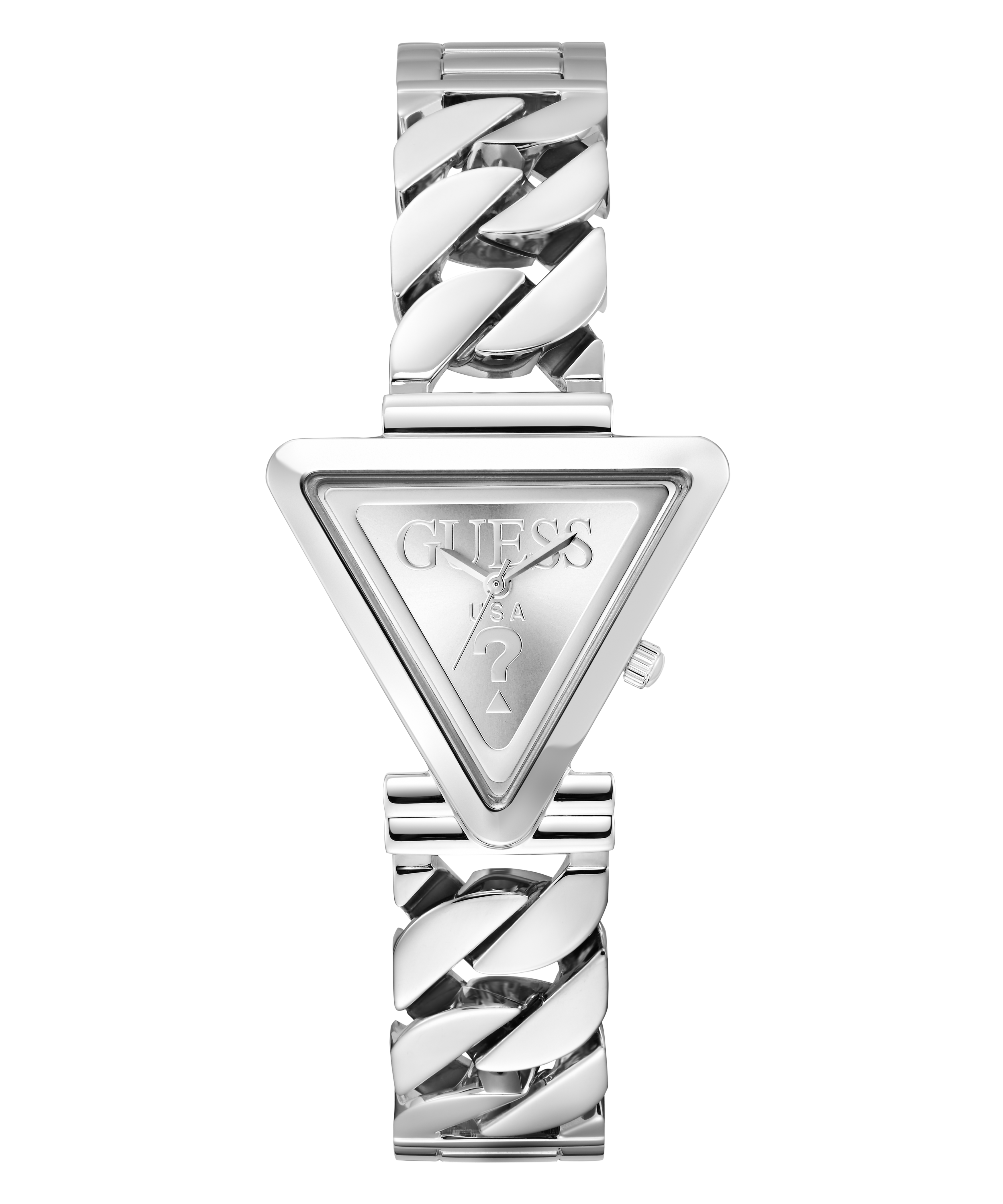 This alluring case design of the GUESS triangle logo has an added logo detail on the dial paired with a thick cowboy chain. Self-adjustable g-links make this style easy to size. Great on its own or stacked with other jewelry!