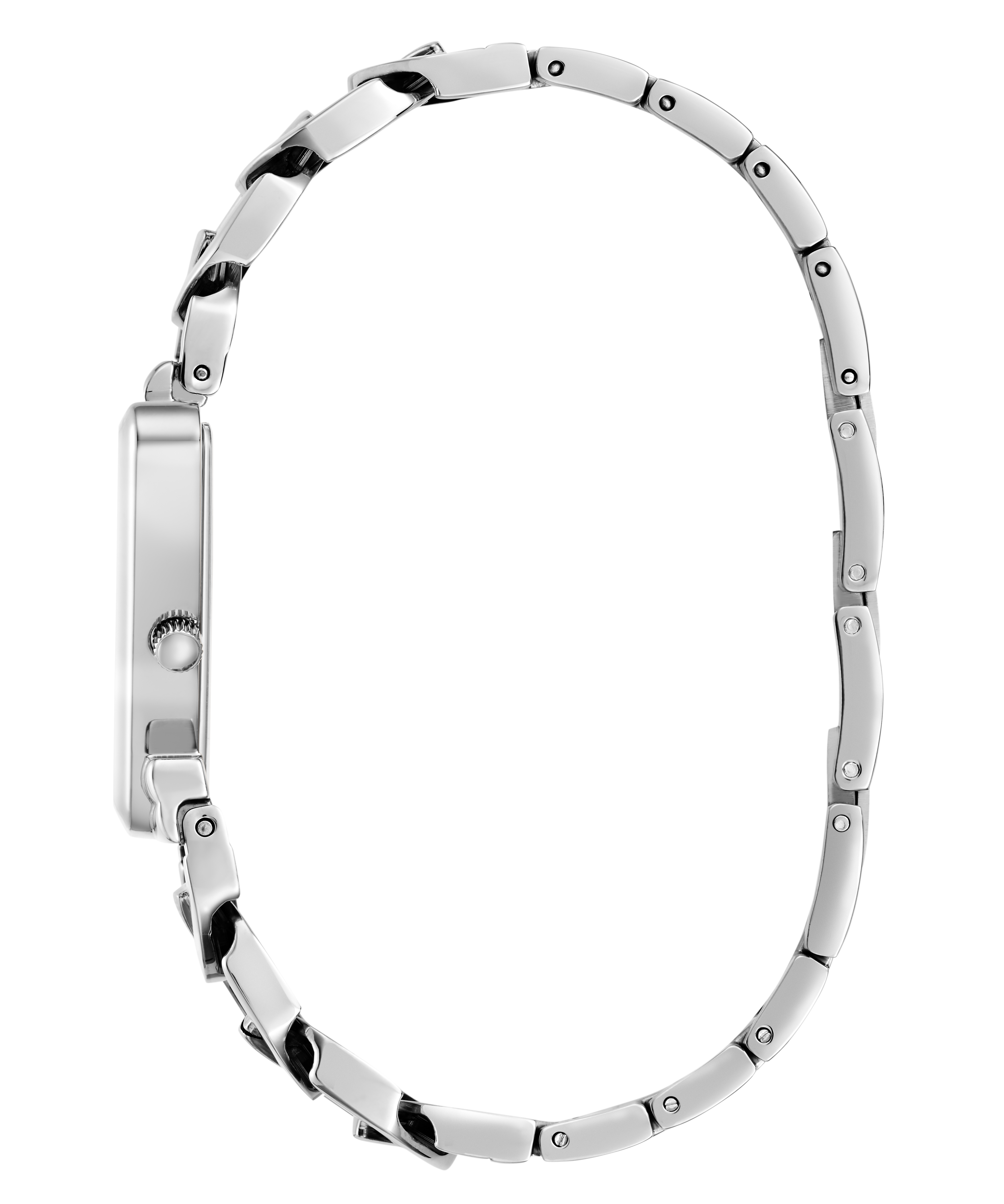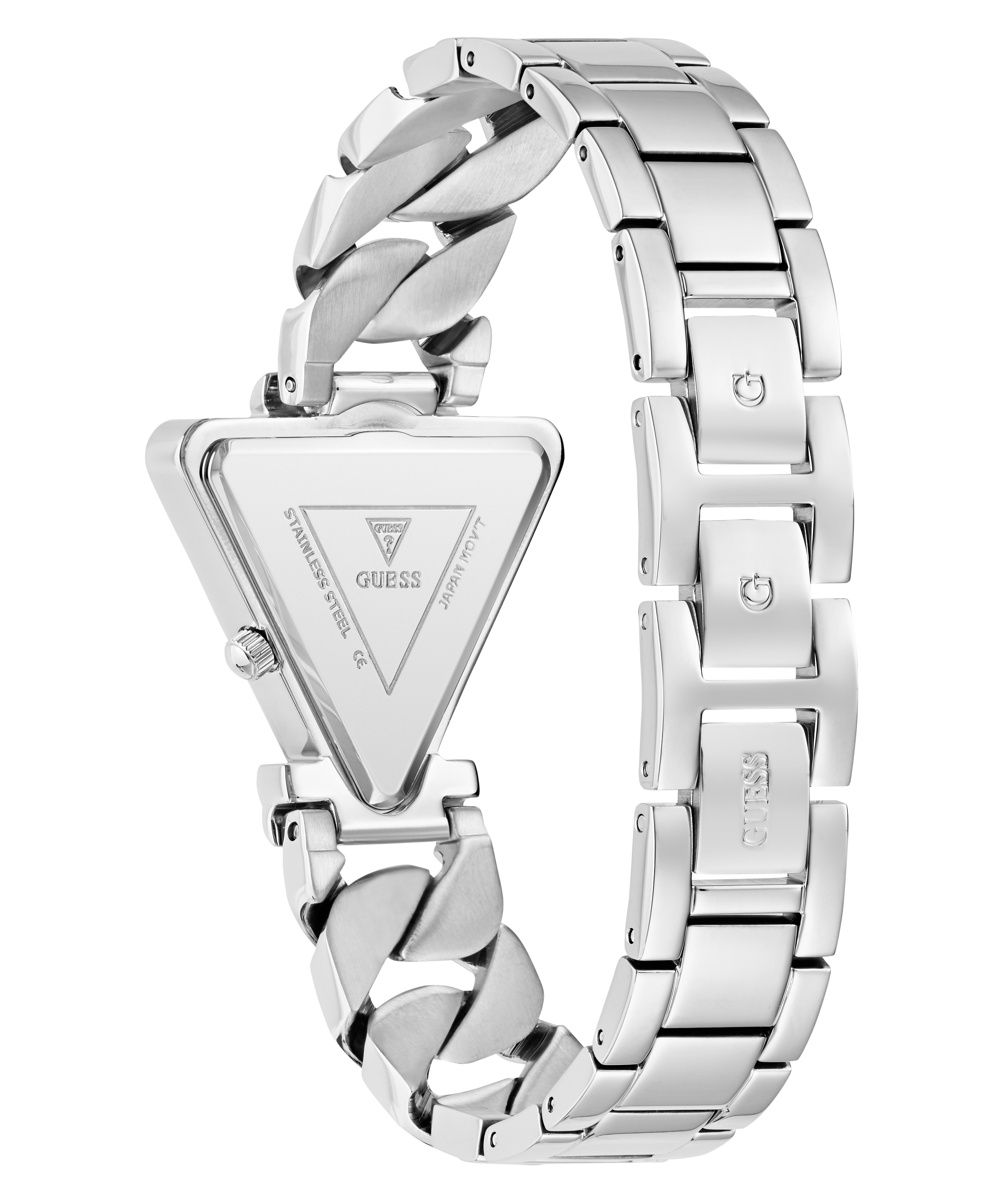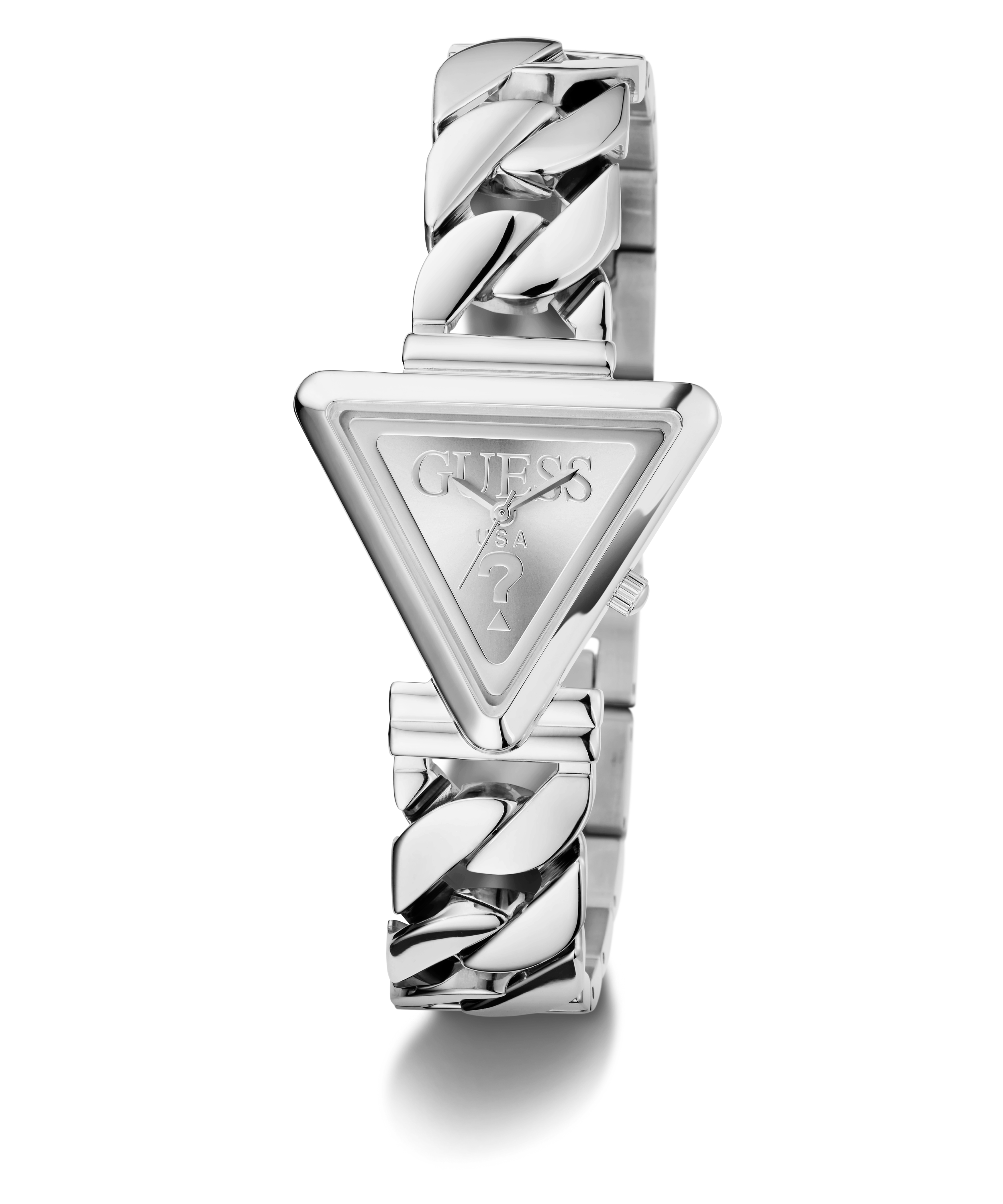 This alluring case design of the GUESS triangle logo has an added logo detail on the dial paired with a thick cowboy chain. Self-adjustable g-links make this style easy to size. Great on its own or stacked with other jewelry!