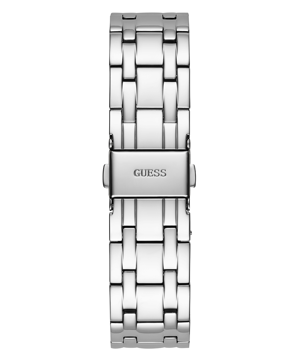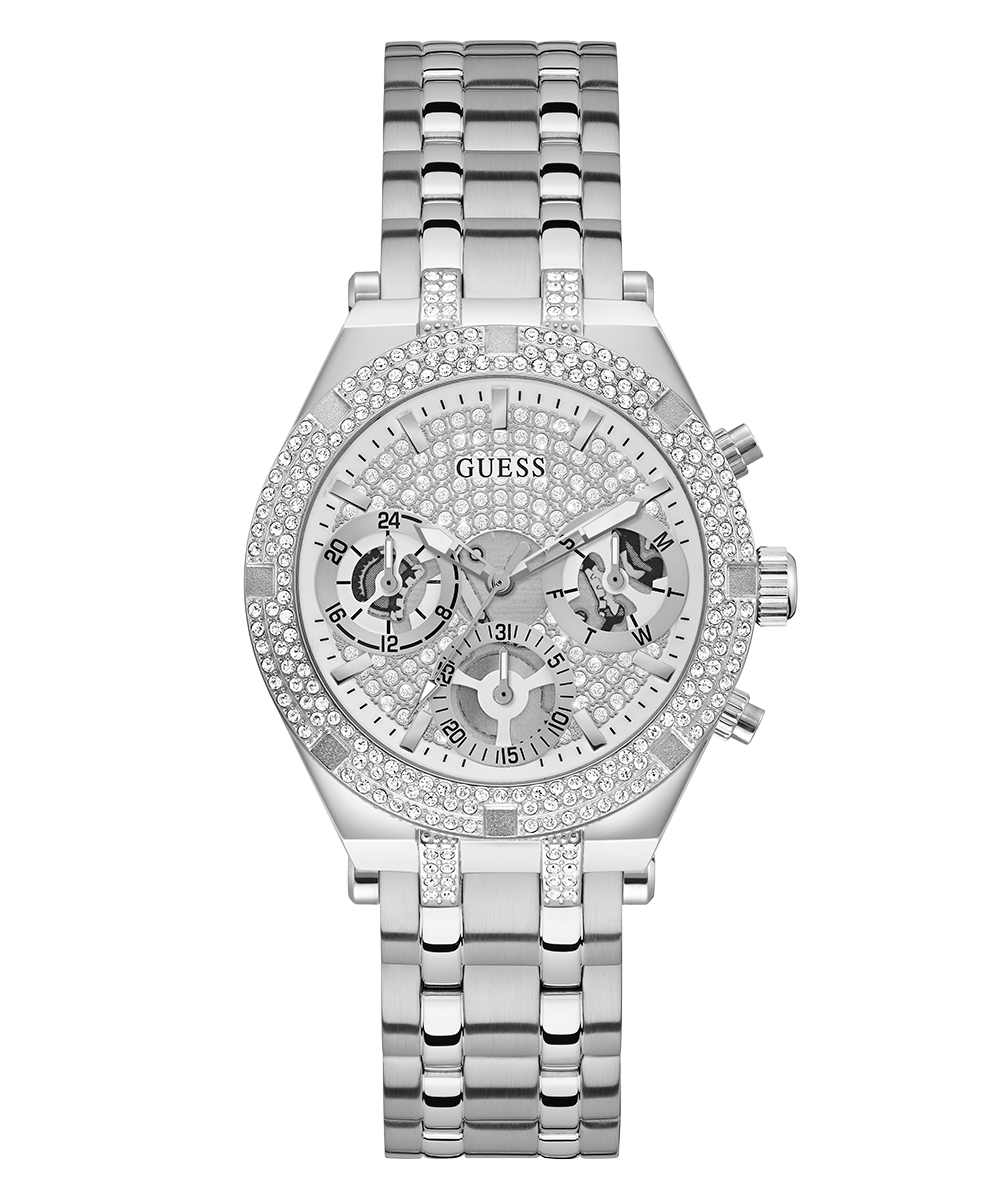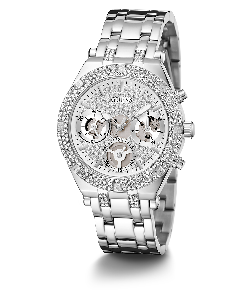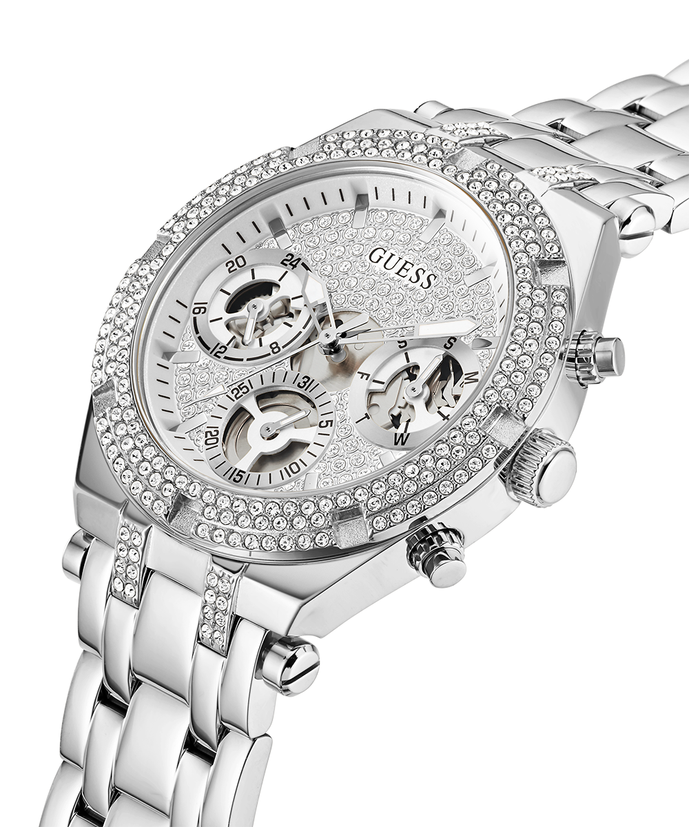 A true heiress, this stunning style features close to 300 crystals on its bezel. Its cut thru dial with chrono look multi function movement features additional glitz powder and is paired with a brushed and polished bracelet