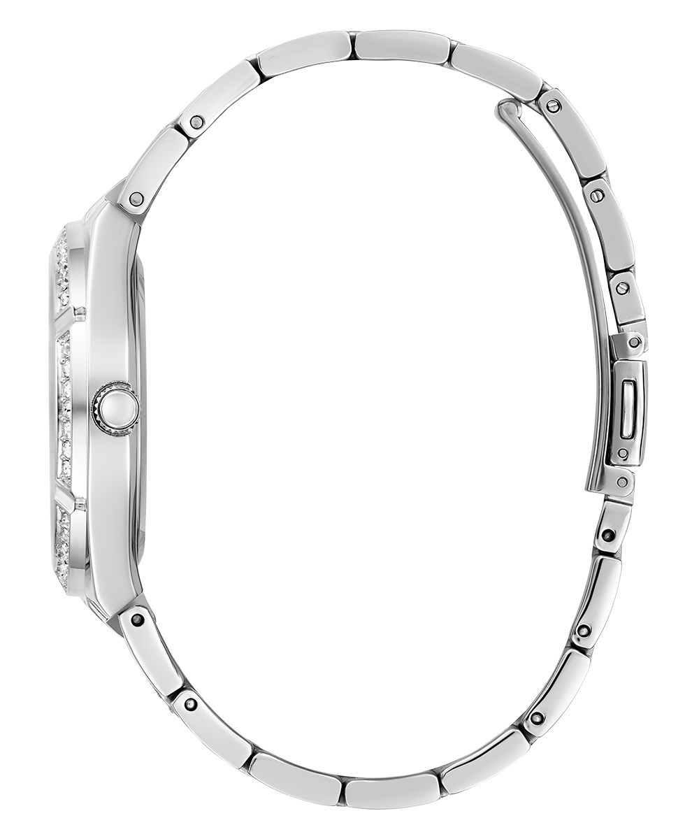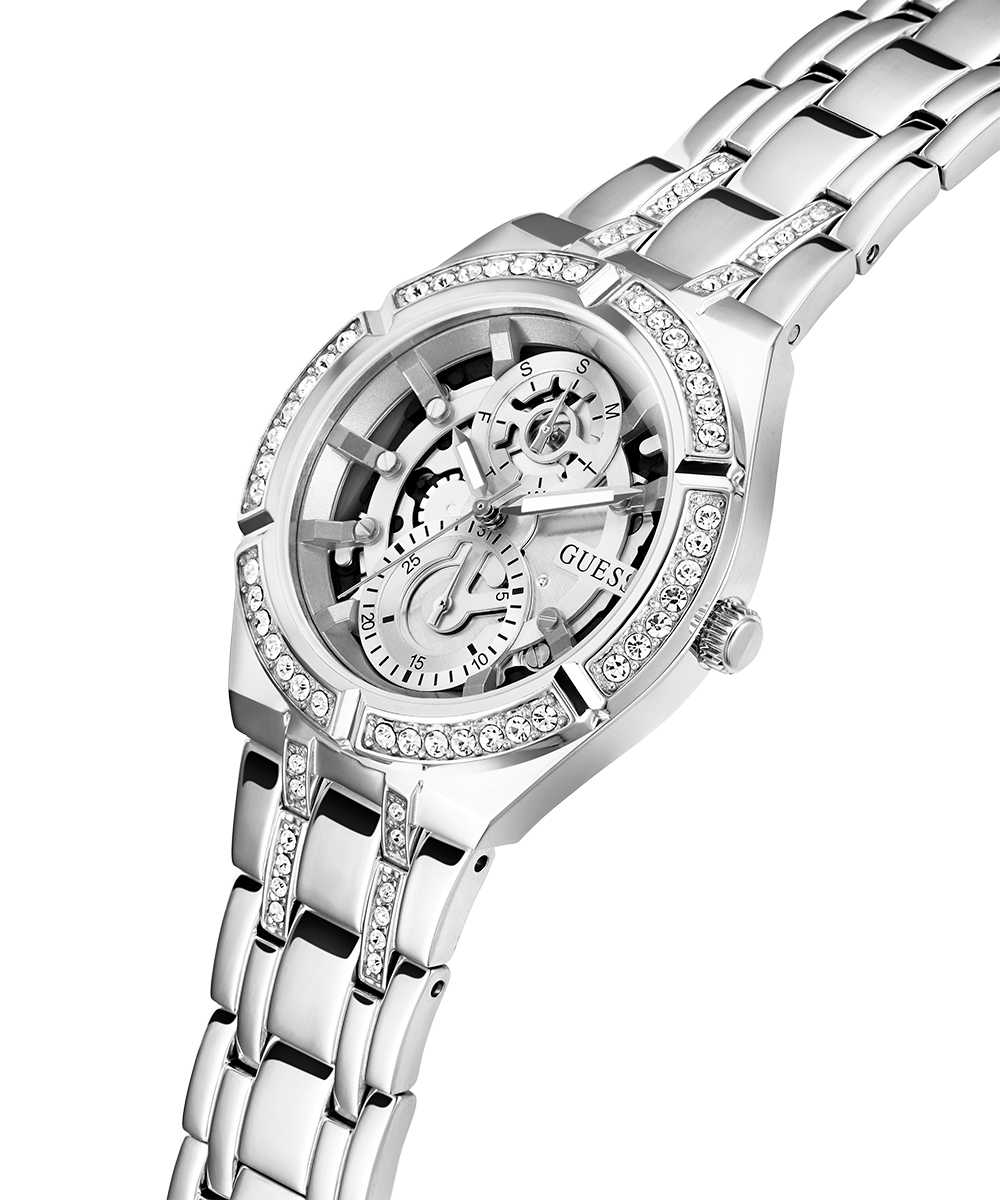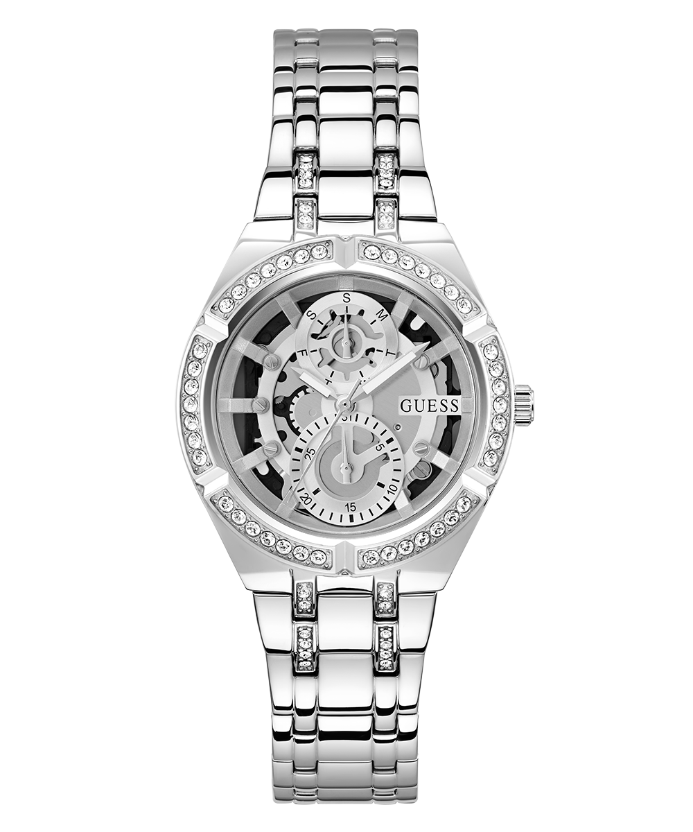An alluring style that is sure to stand out against any look you pair with it. Featuring a beautifully cut thru look on it's dial with a multi-function movement and crystal detail throughout the bracelet connection