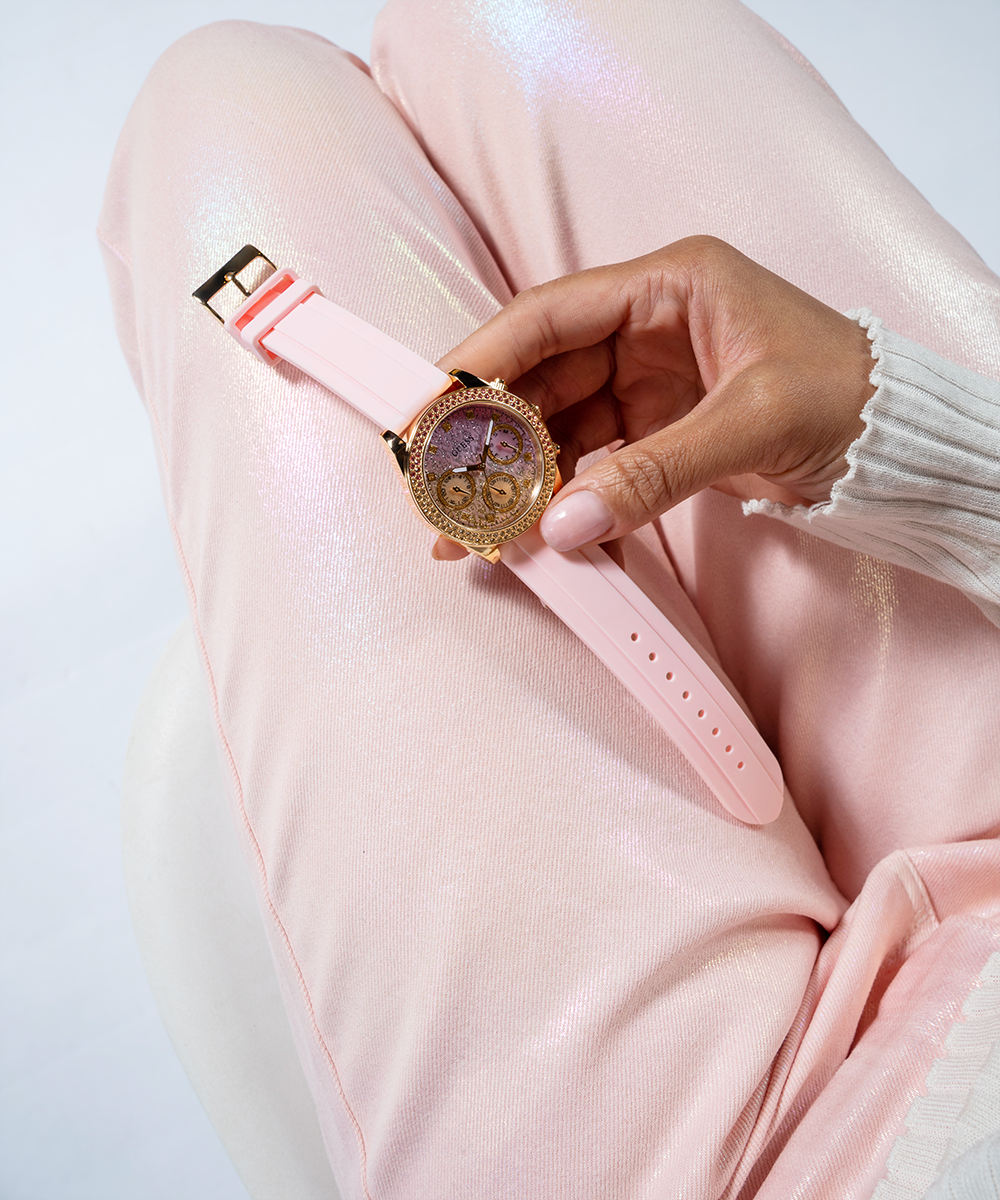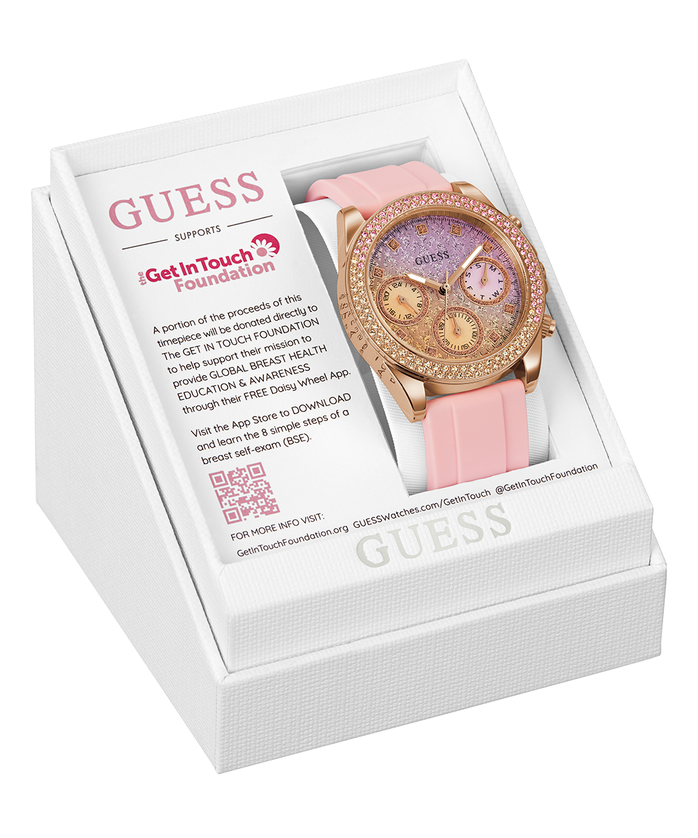This style is the 2023 Sparkling Pink style from GUESS Watches. Benefiting Breast Health Awareness with 10% of each sale going to The Get In Touch Foundation. This year's timepiece, co-designed with GIT president Betsy Nilan, features an ombre pink glitz dial with ghosted ribbon design and a double row of ombre crystal colors on its bezel. This watch ships in special packaging and has a special case back with the pink GIT foundation logo.