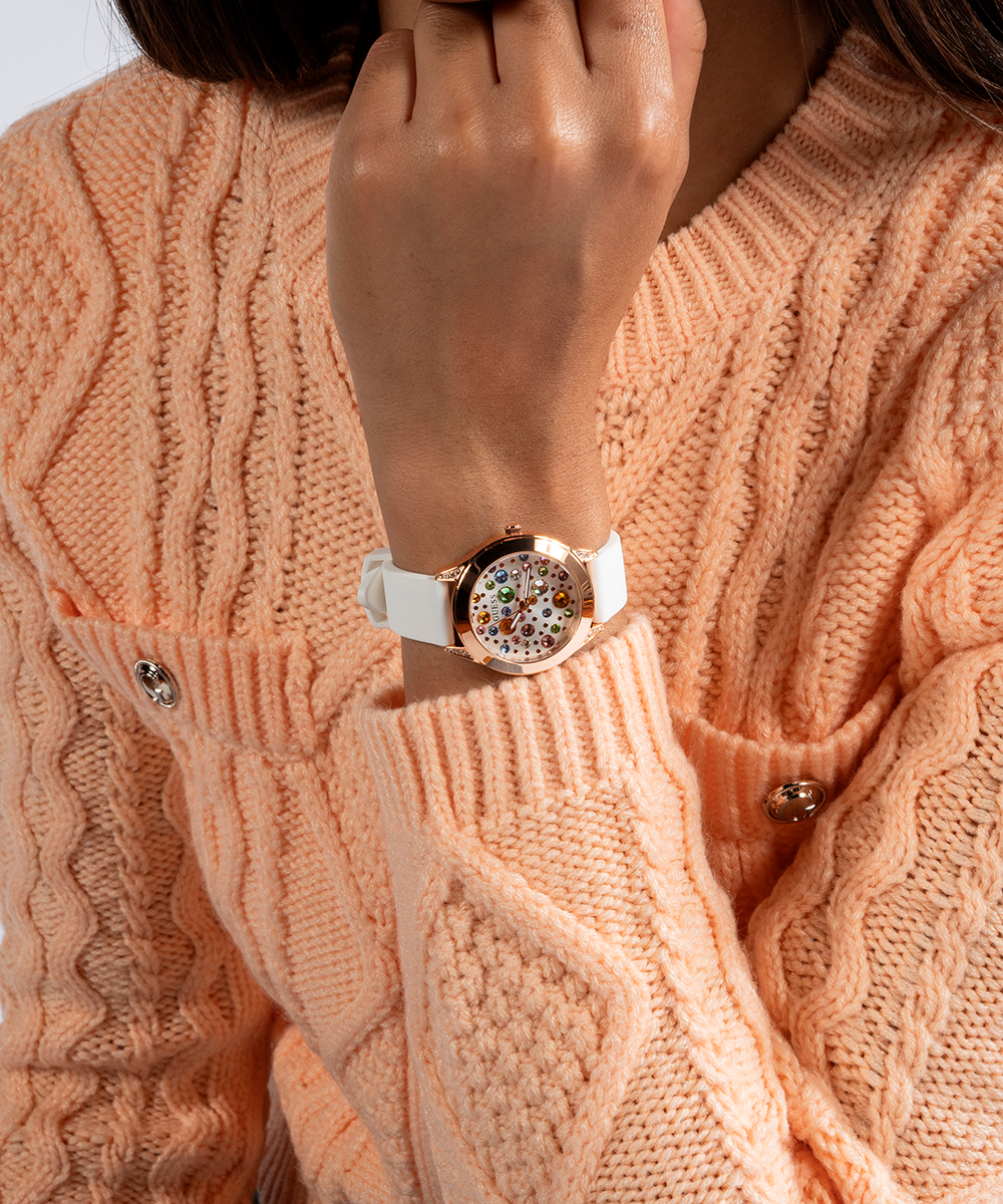 A delicate collection of crystals playfully pair with a sleek case and silicone strap