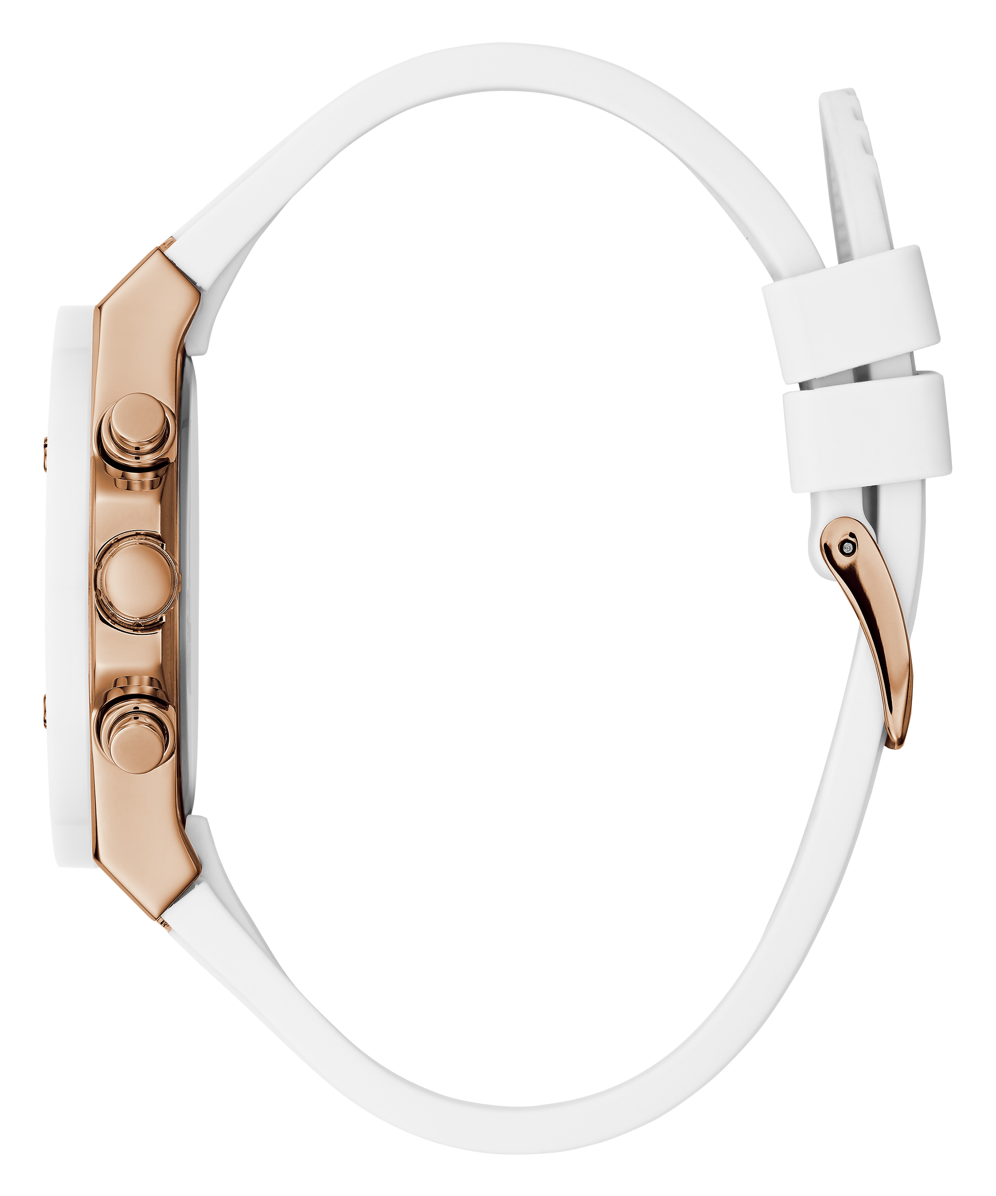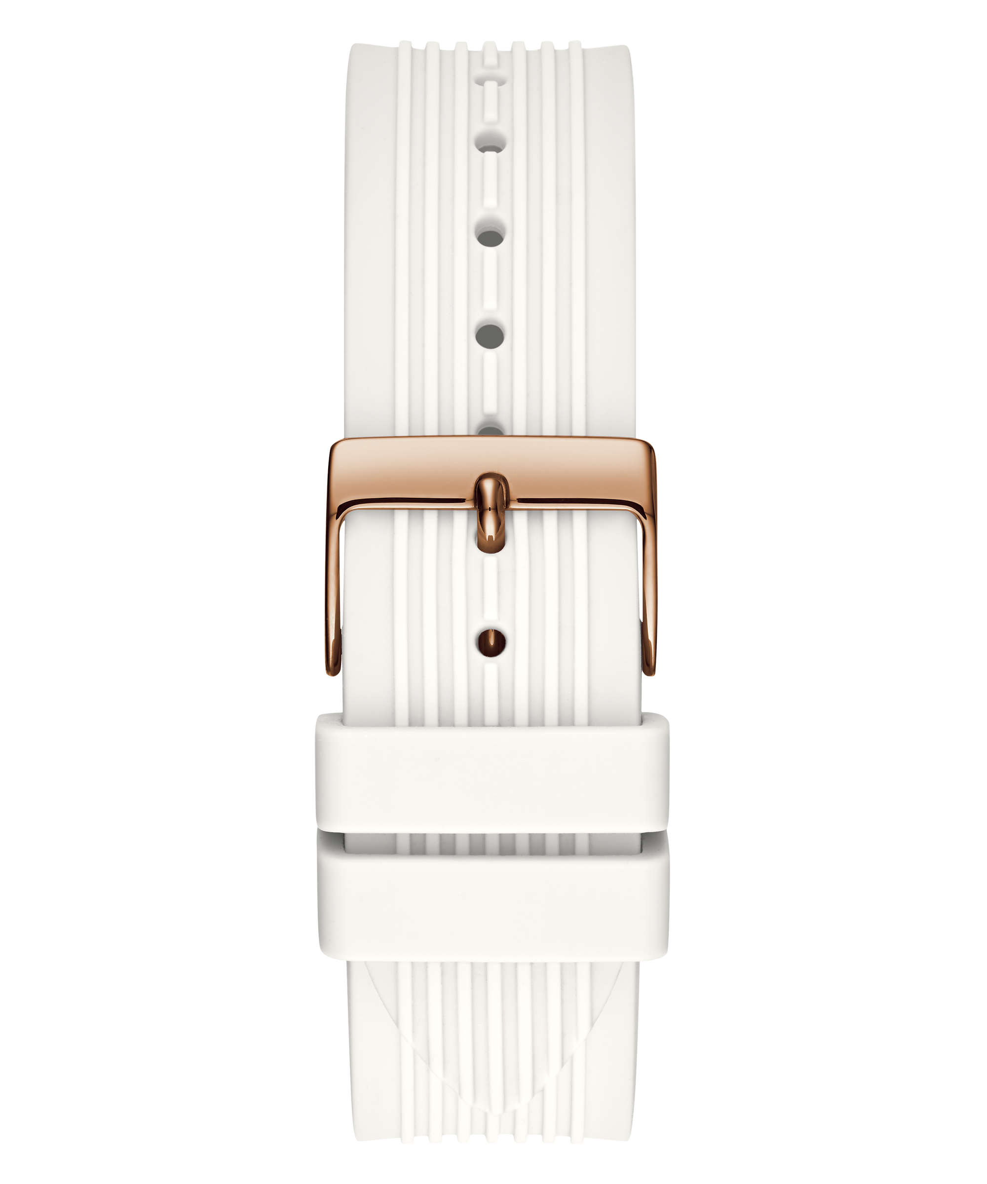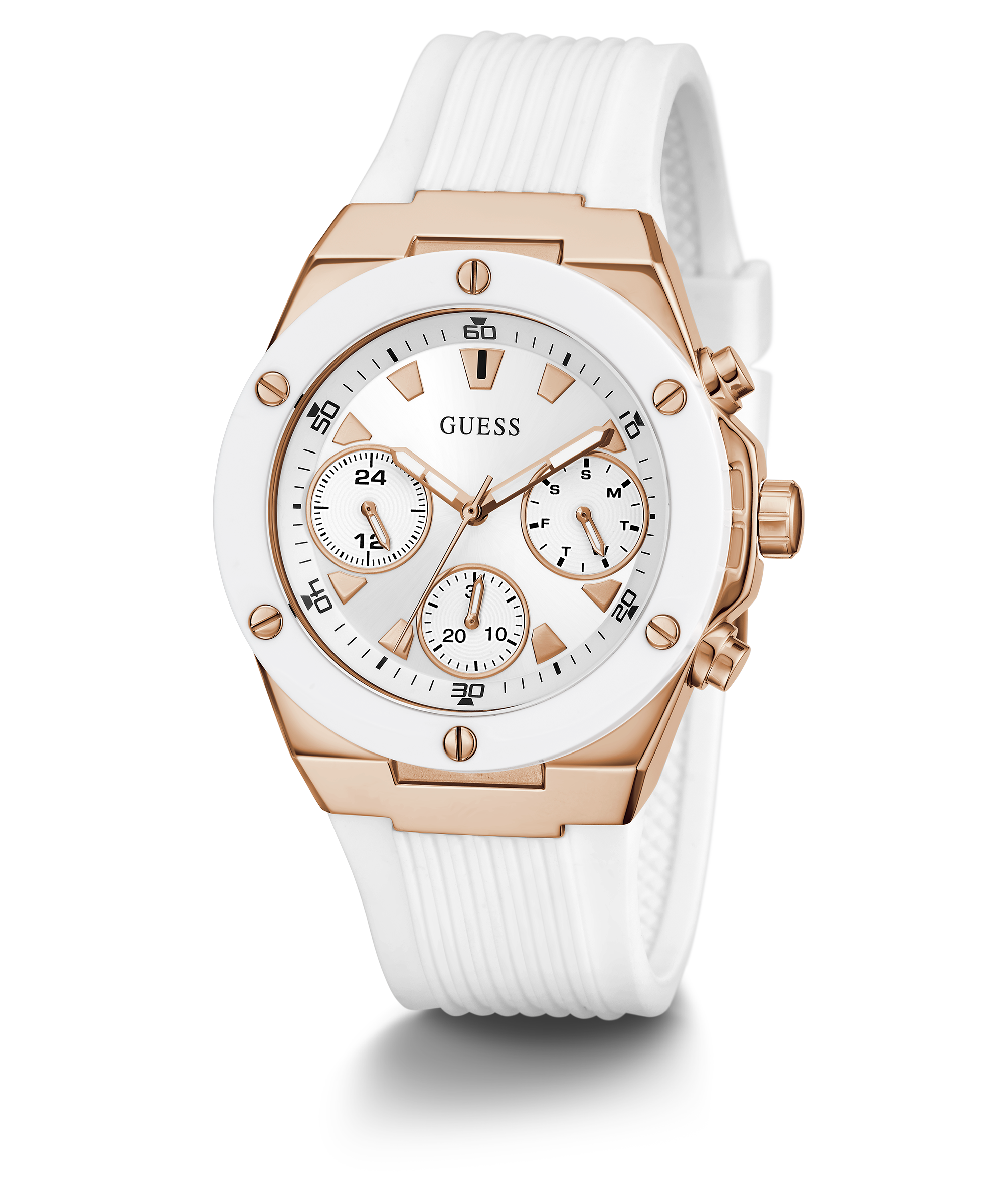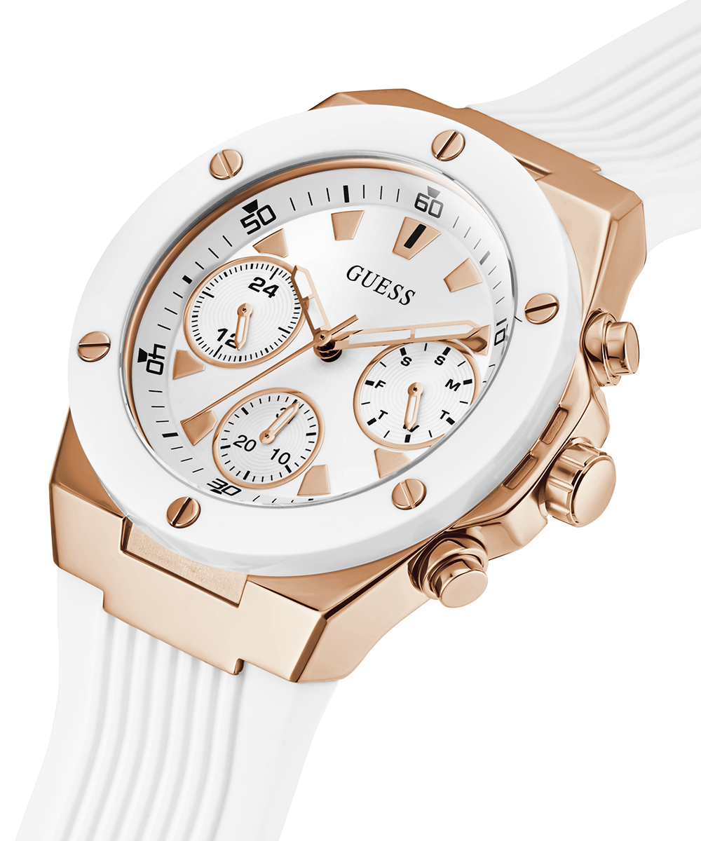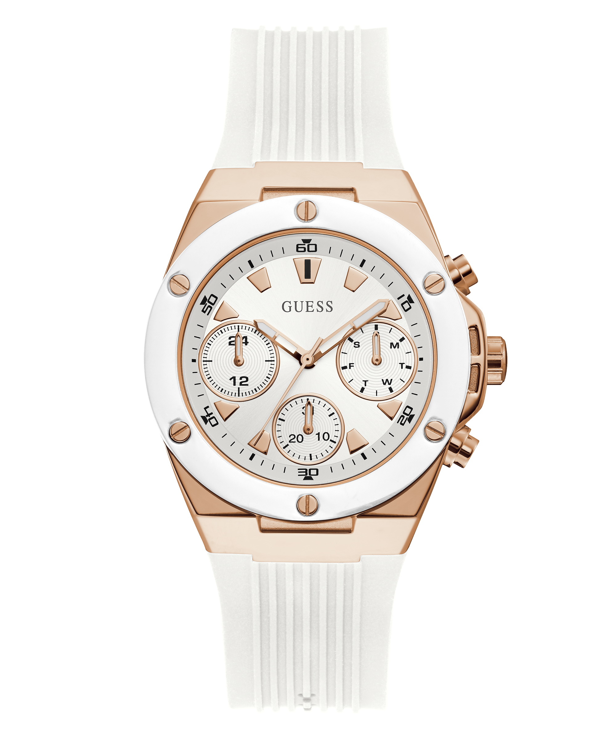 Go to the shopSport meets Glam with this versatile chrono-look style featuring a rose-gold tone case with a white nylon top ring on a white silicone strap.