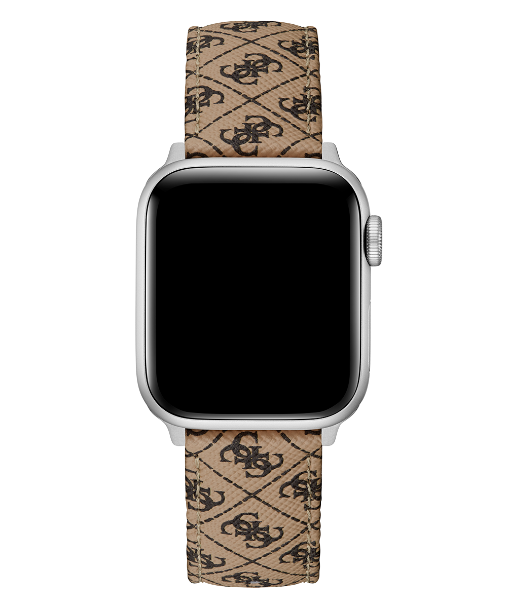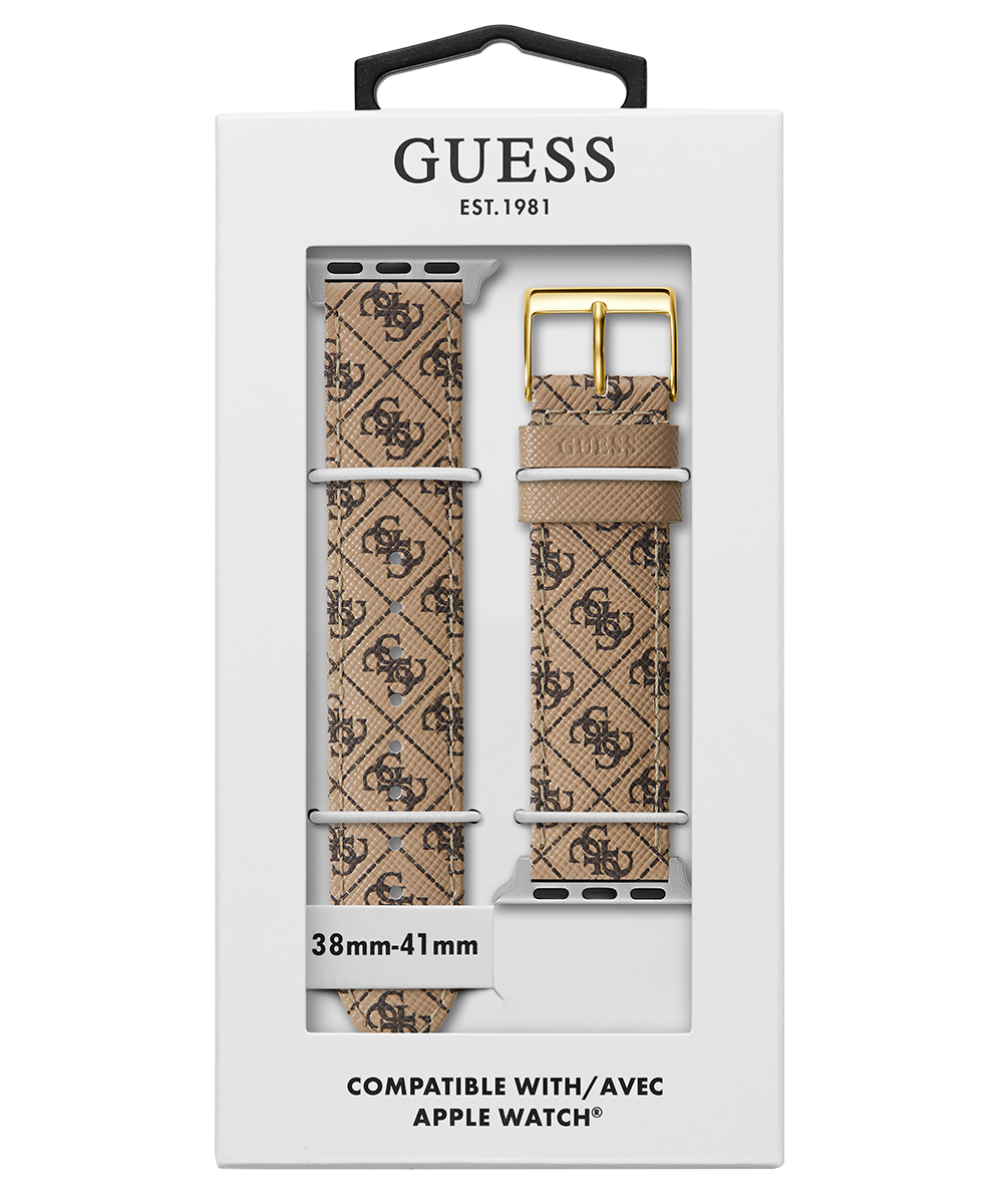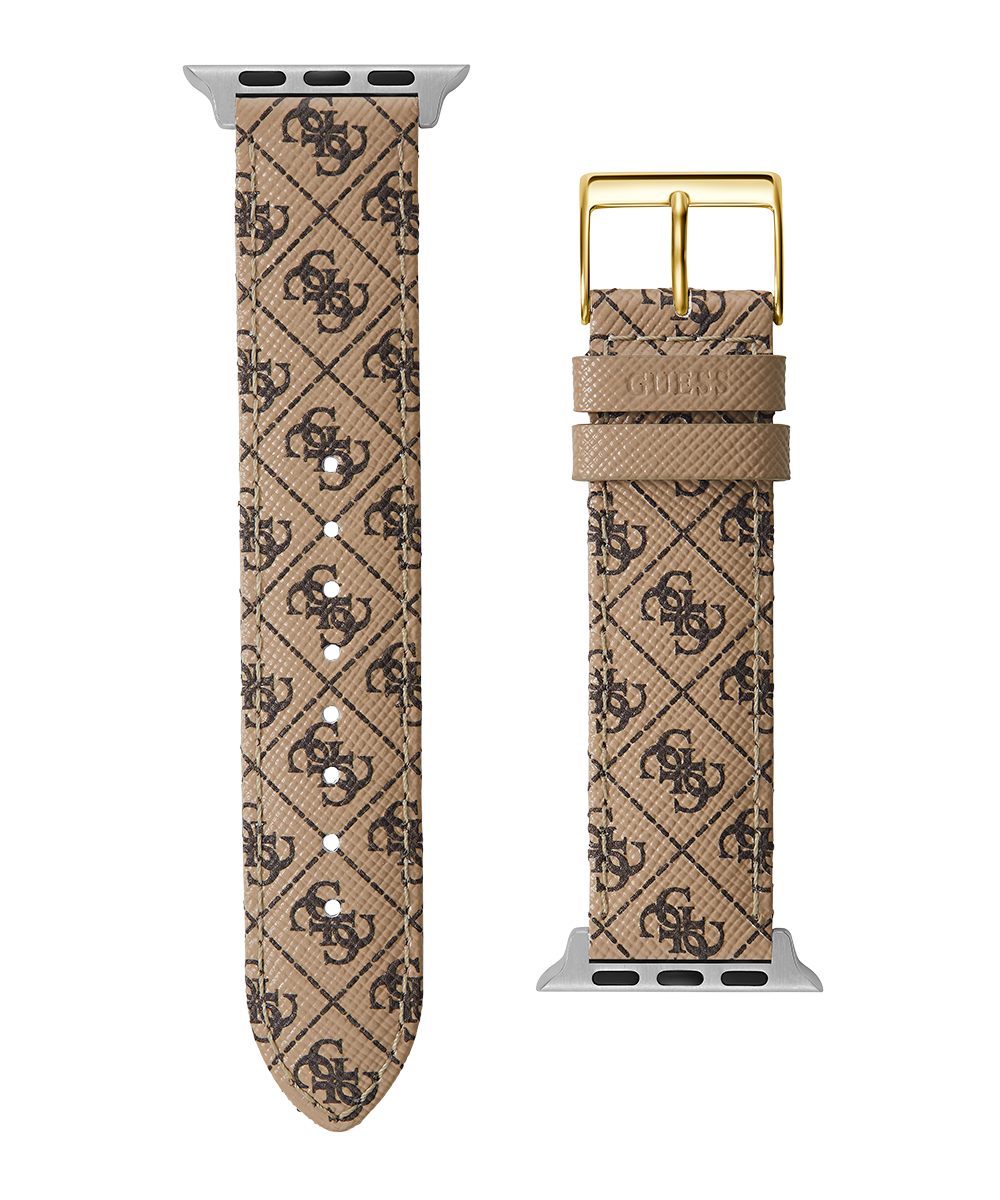 Go to the shopShow your love for GUESS with this signature quattro "G" pattern in chocolate brown on a tan leather band that is compatible with Apple Watches 38-40 mm. *Apple Watch not included