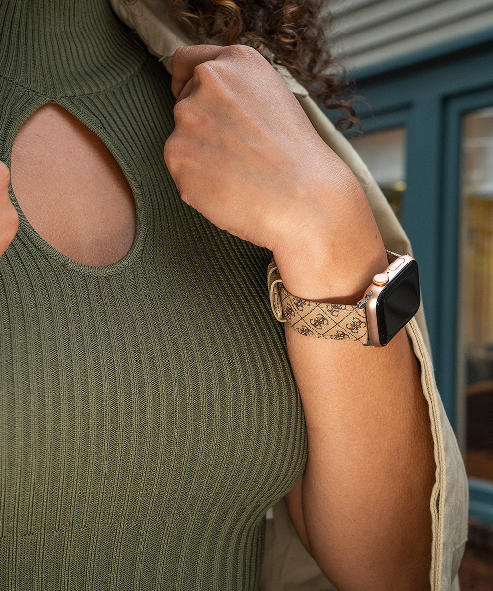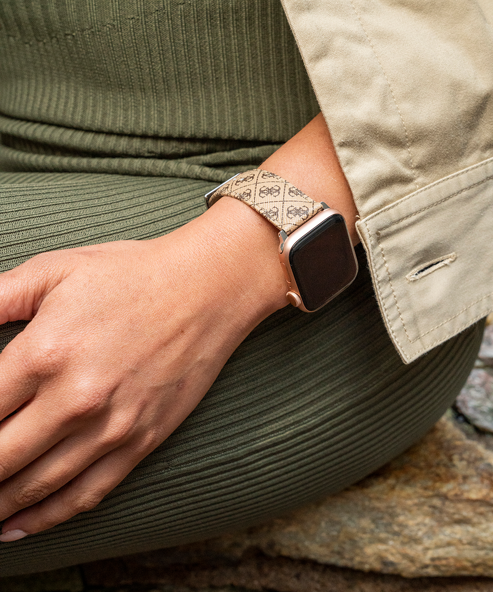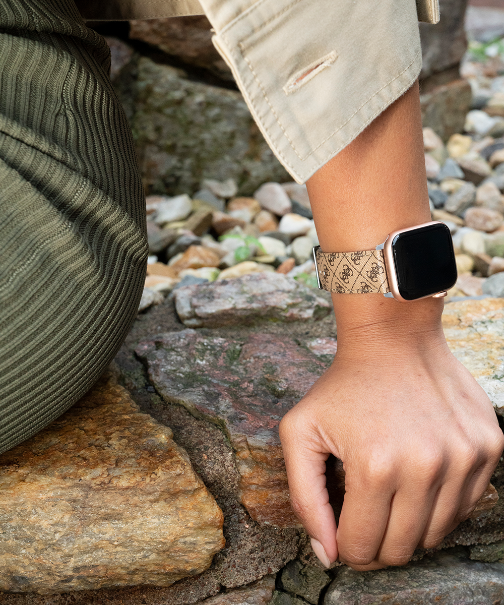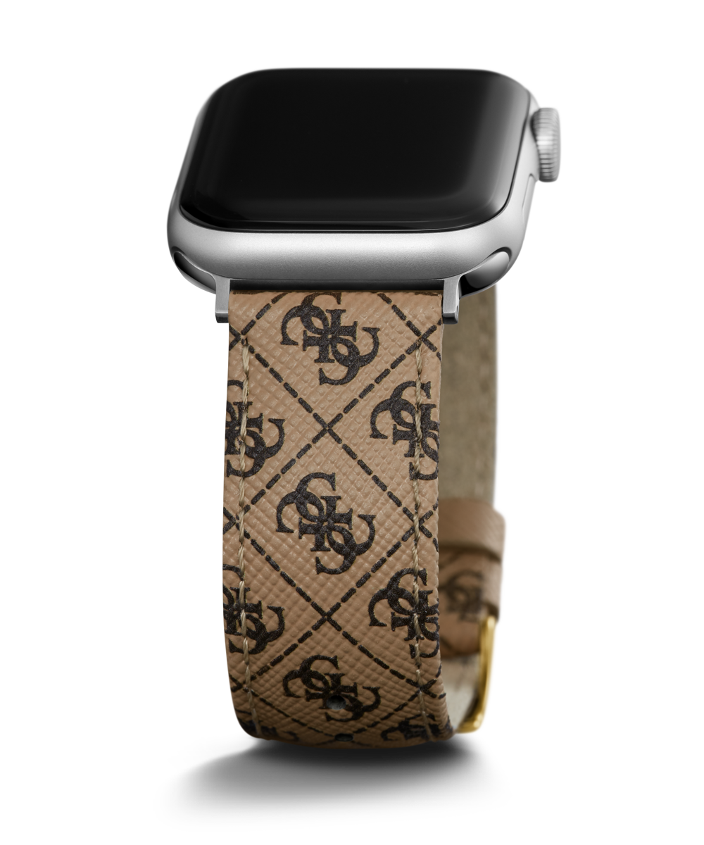 Go to the shopShow your love for GUESS with this signature quattro "G" pattern in chocolate brown on a tan leather band that is compatible with Apple Watches 38-40 mm. *Apple Watch not included