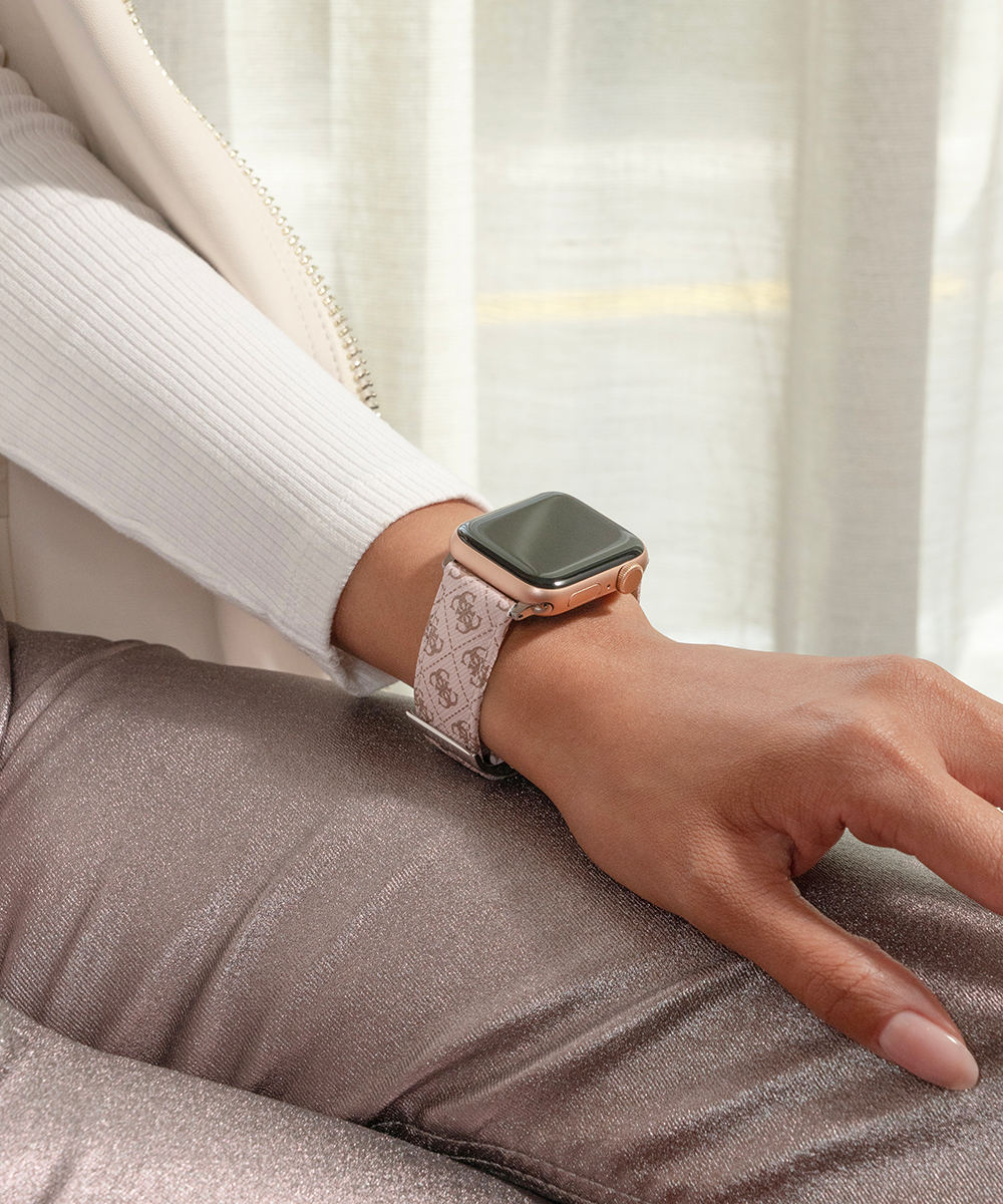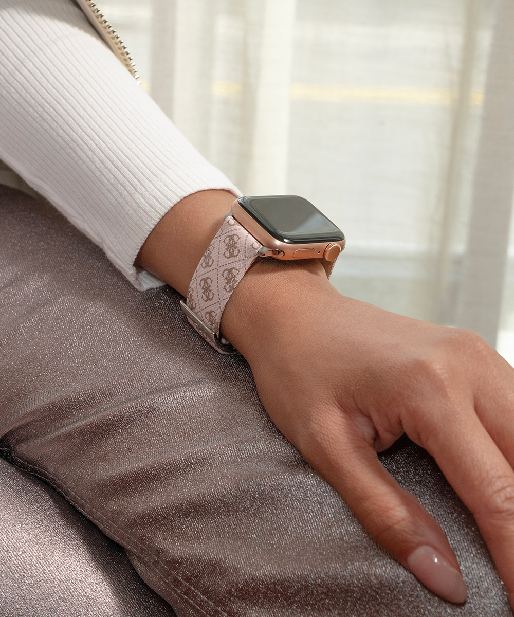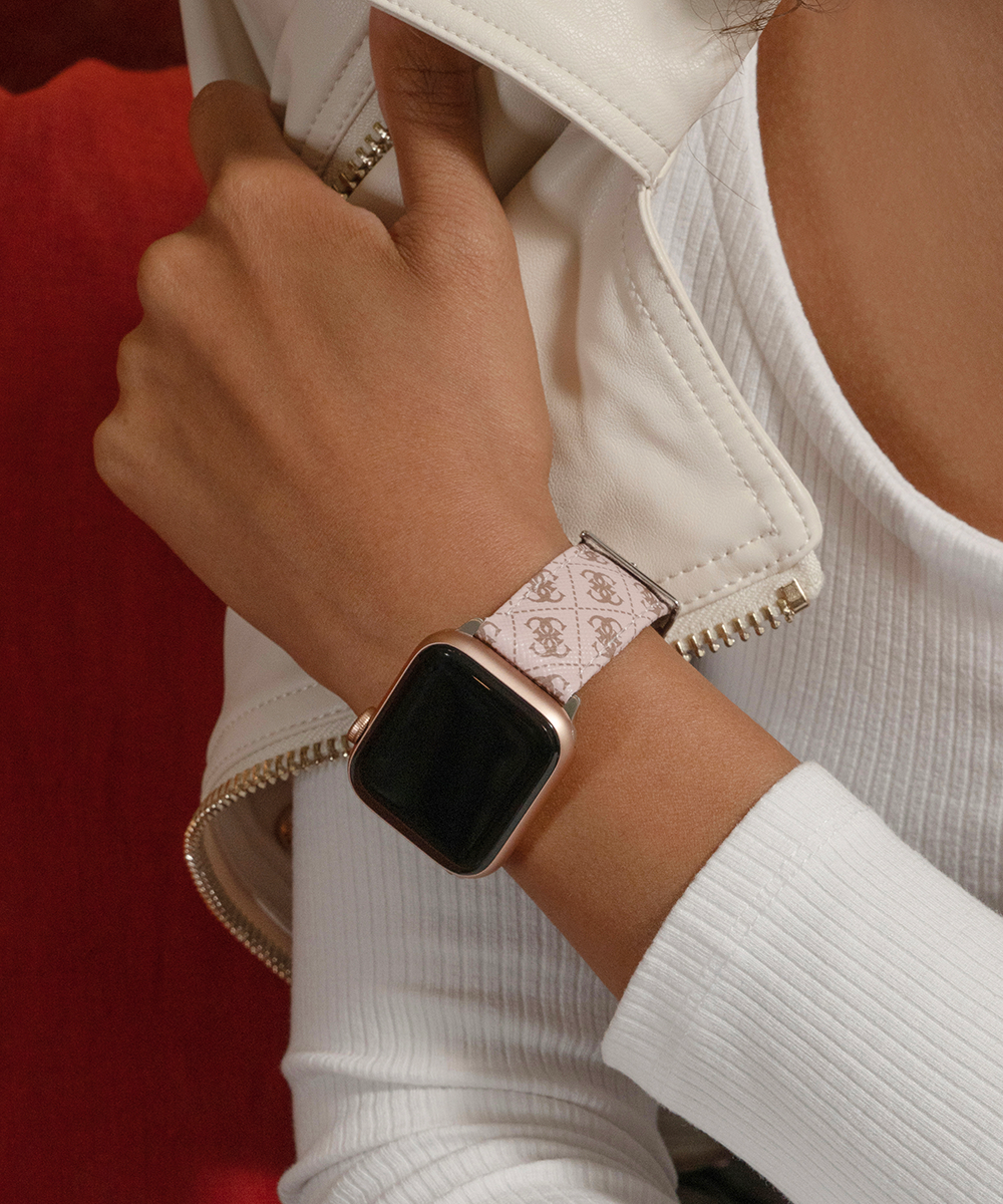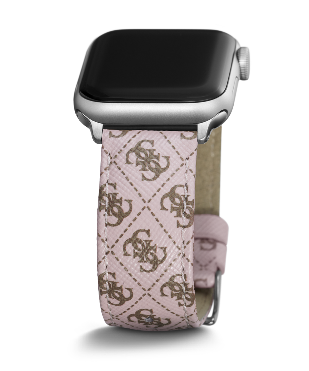 Go to the shopShow your love for GUESS with this signature quattro "G" pattern in taupe on a pink leather strap that is compatible with Apple Watches 38-40 mm. *Apple Watch not included