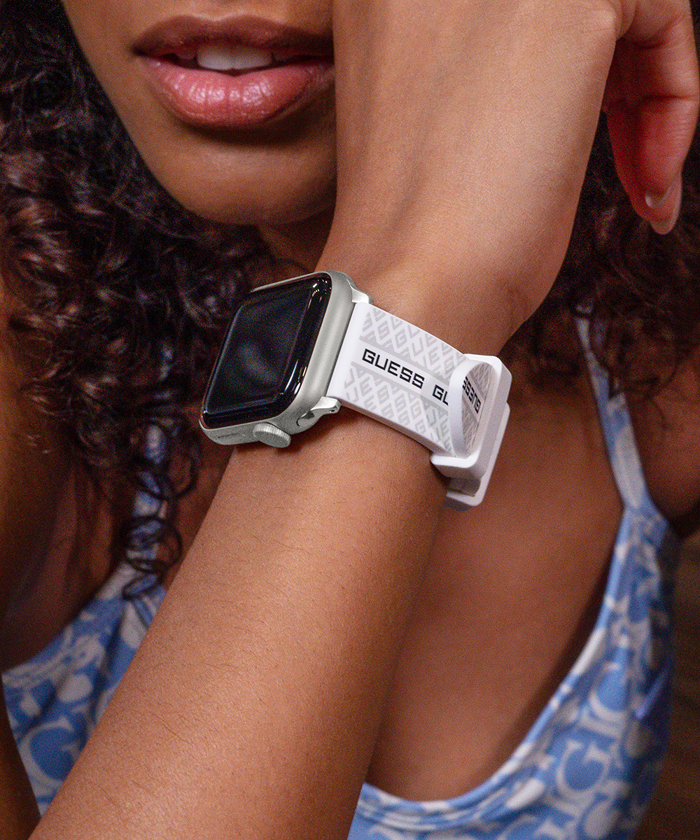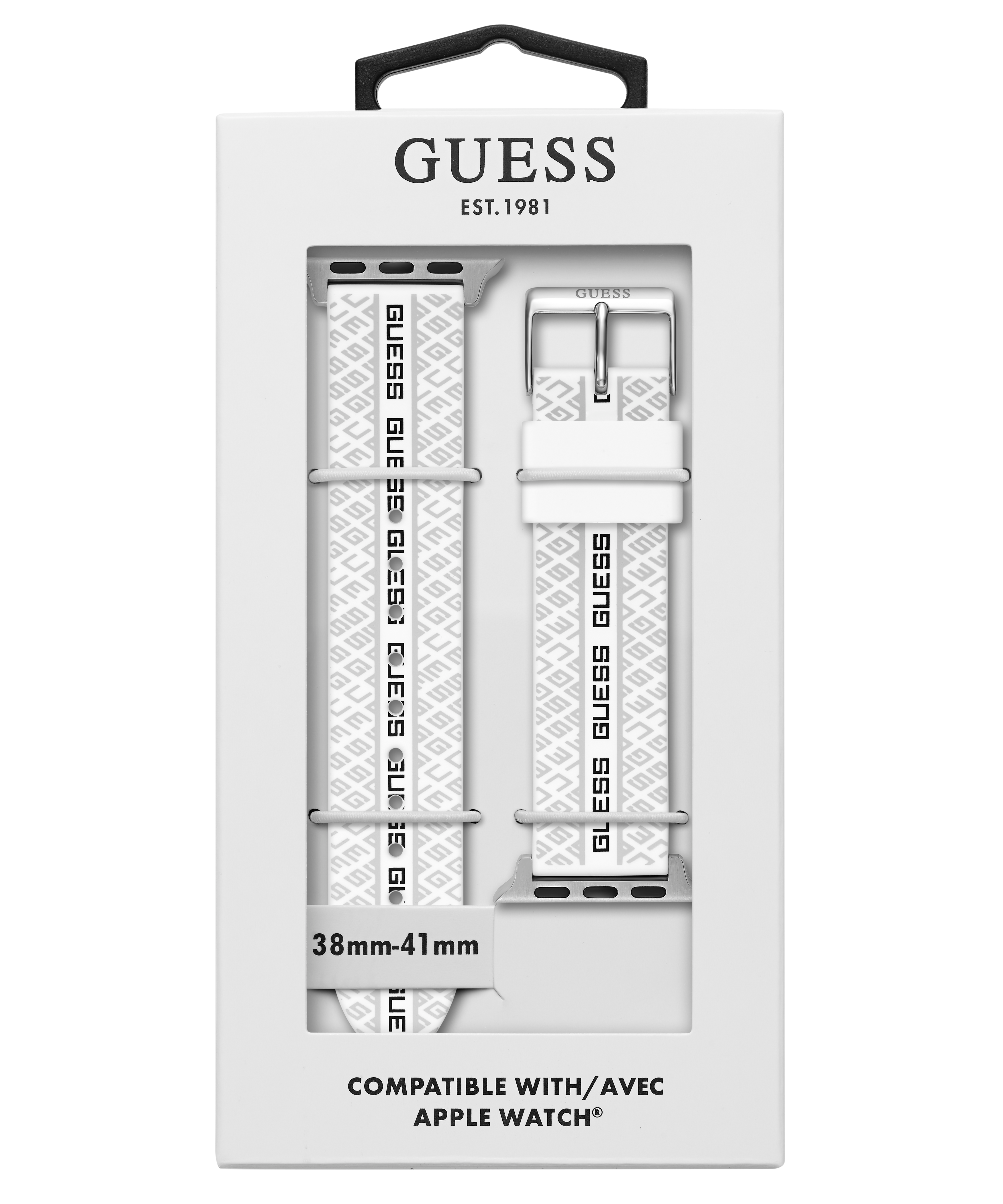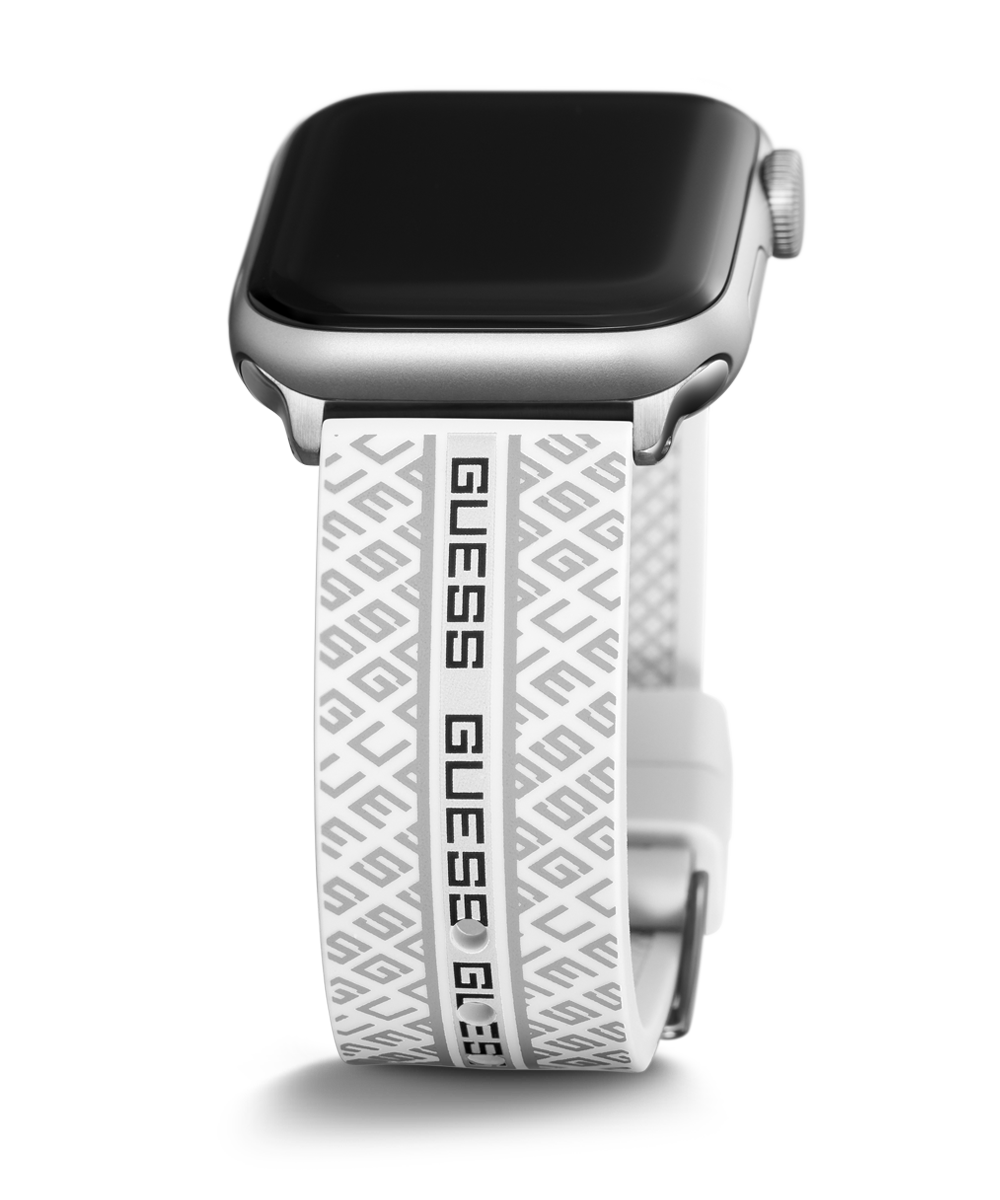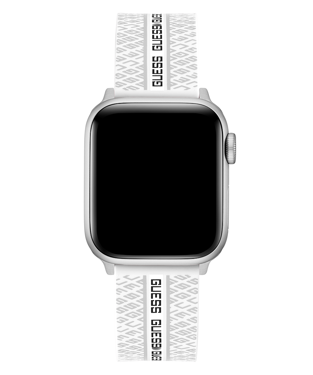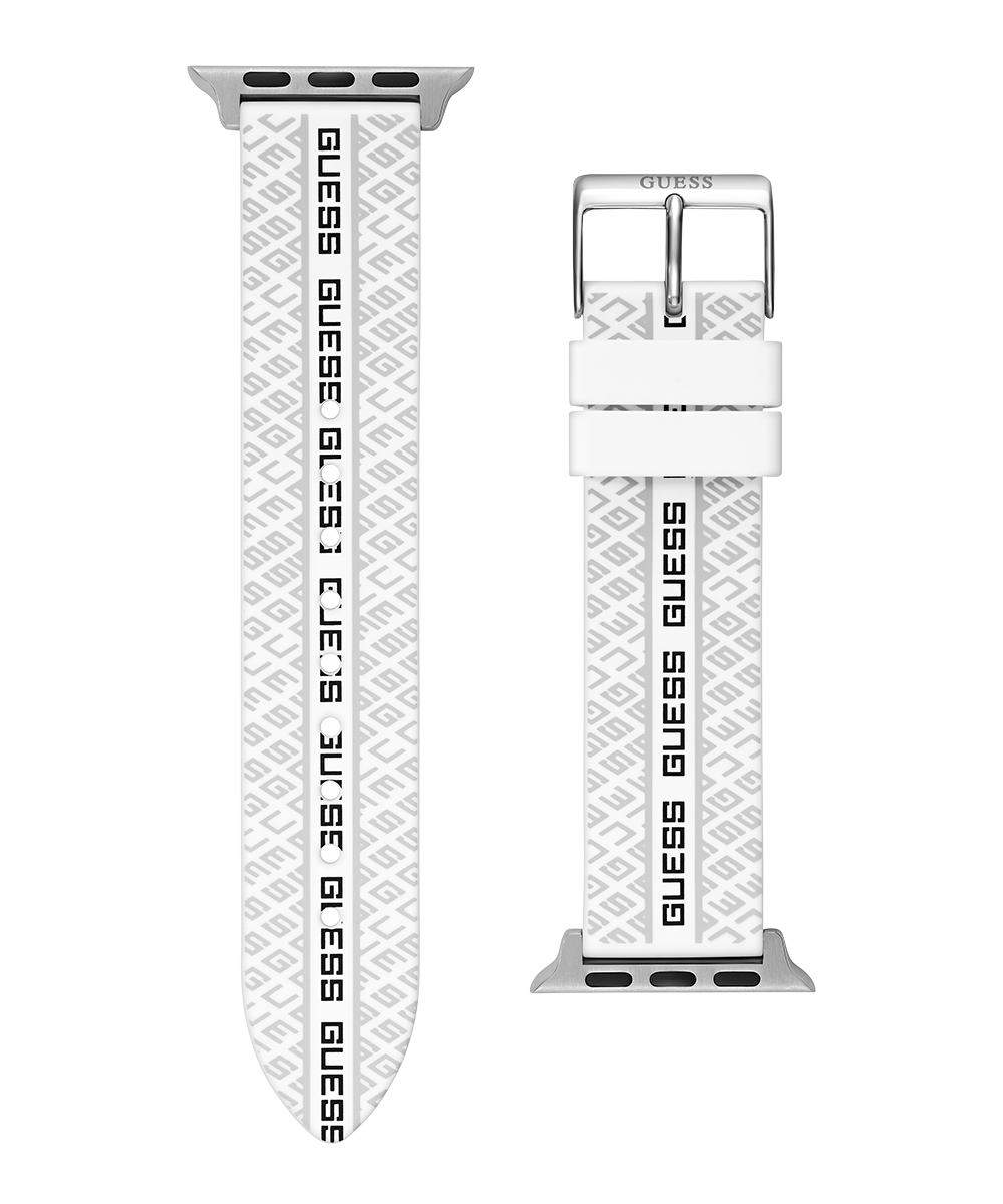 Go to the shopThis white silicone strap features a signature GUESS "G" cube pattern with a white logo striping down the center that is compatible with Apple Watches 38-40 mm. *Apple Watch not included