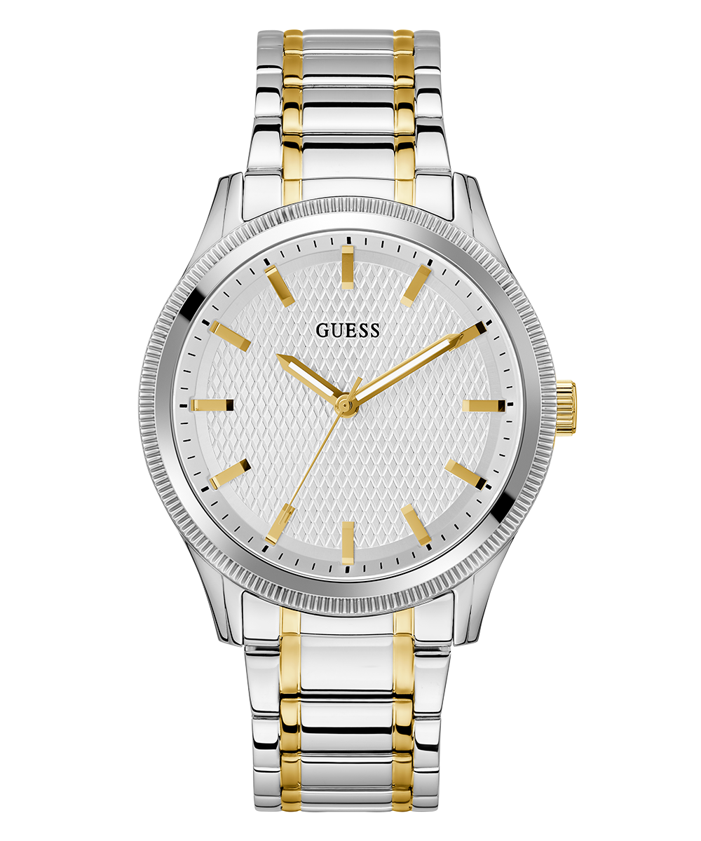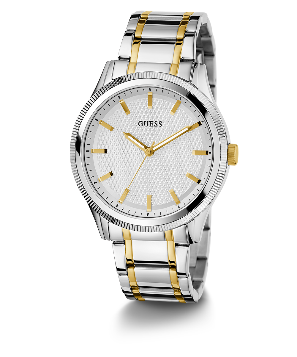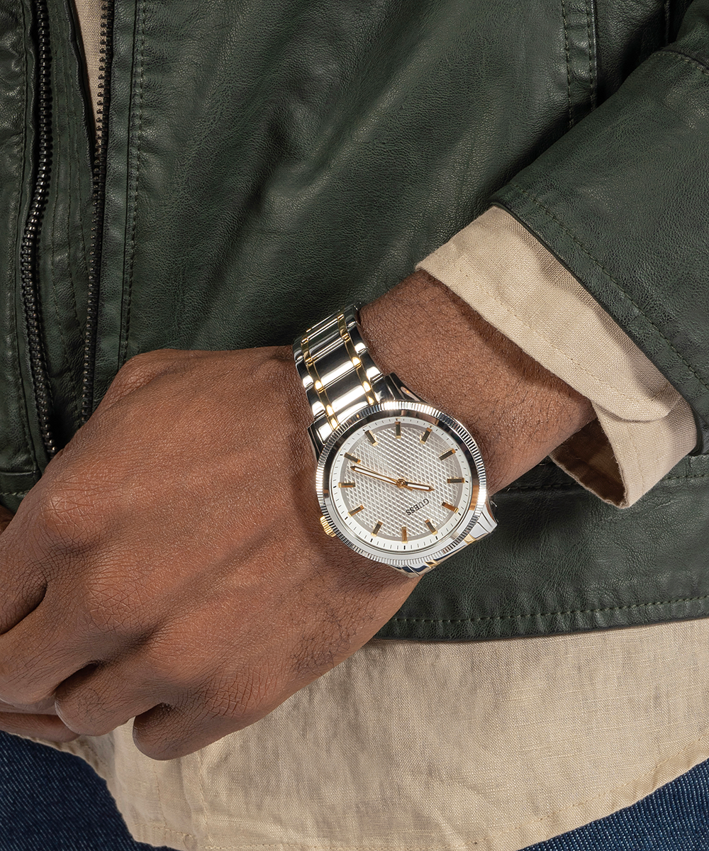 An easy go-to for any guy's wardrobe is this sophisticated dress watch featuring a refined textured pattern on the bezel as well as on its dial.