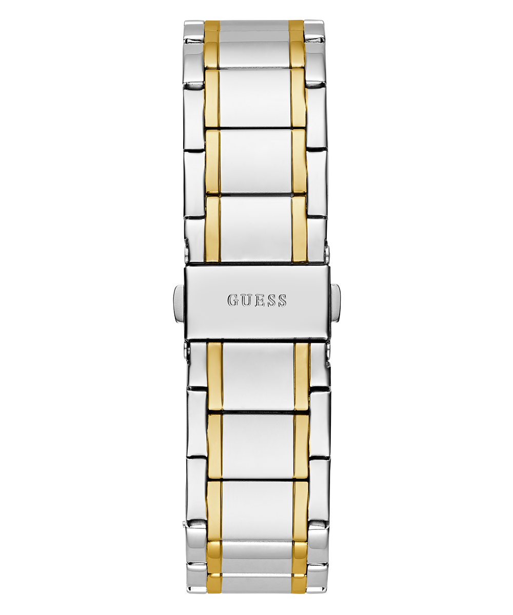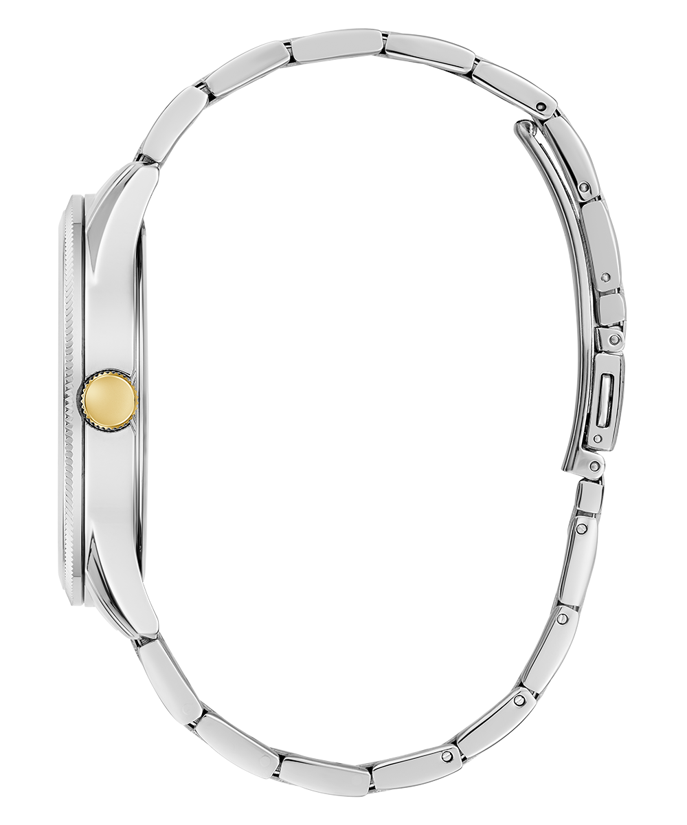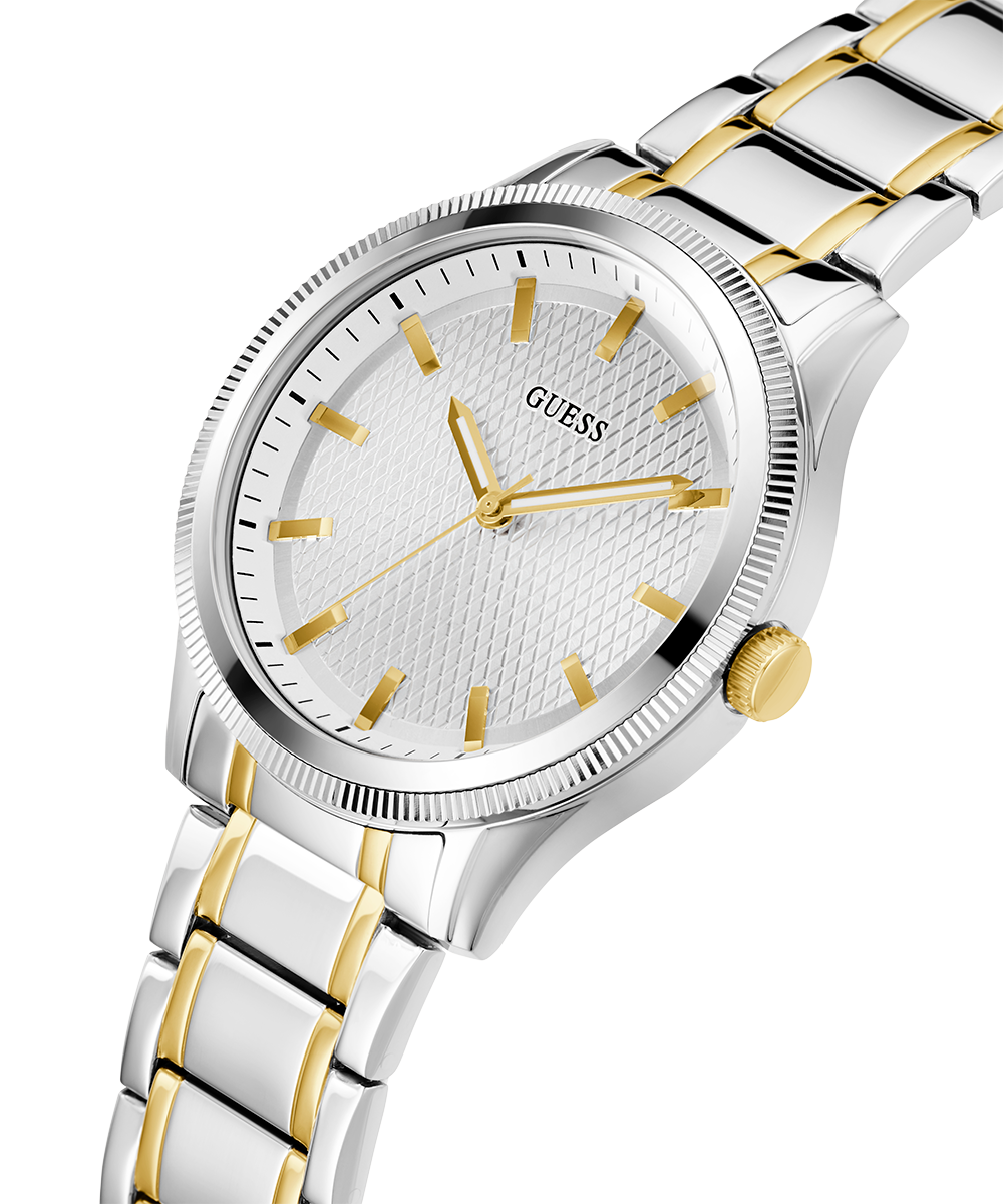 An easy go-to for any guy's wardrobe is this sophisticated dress watch featuring a refined textured pattern on the bezel as well as on its dial.
