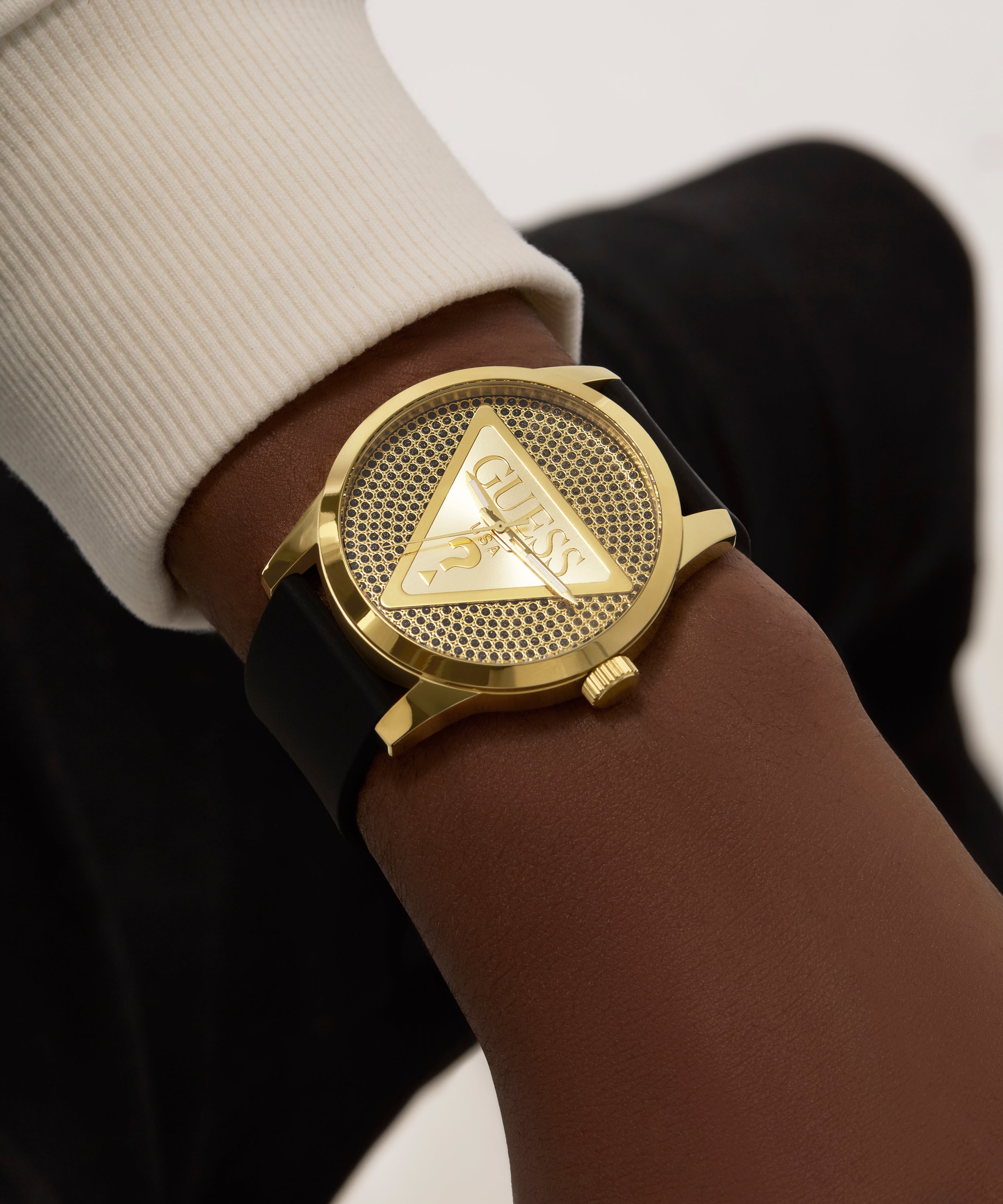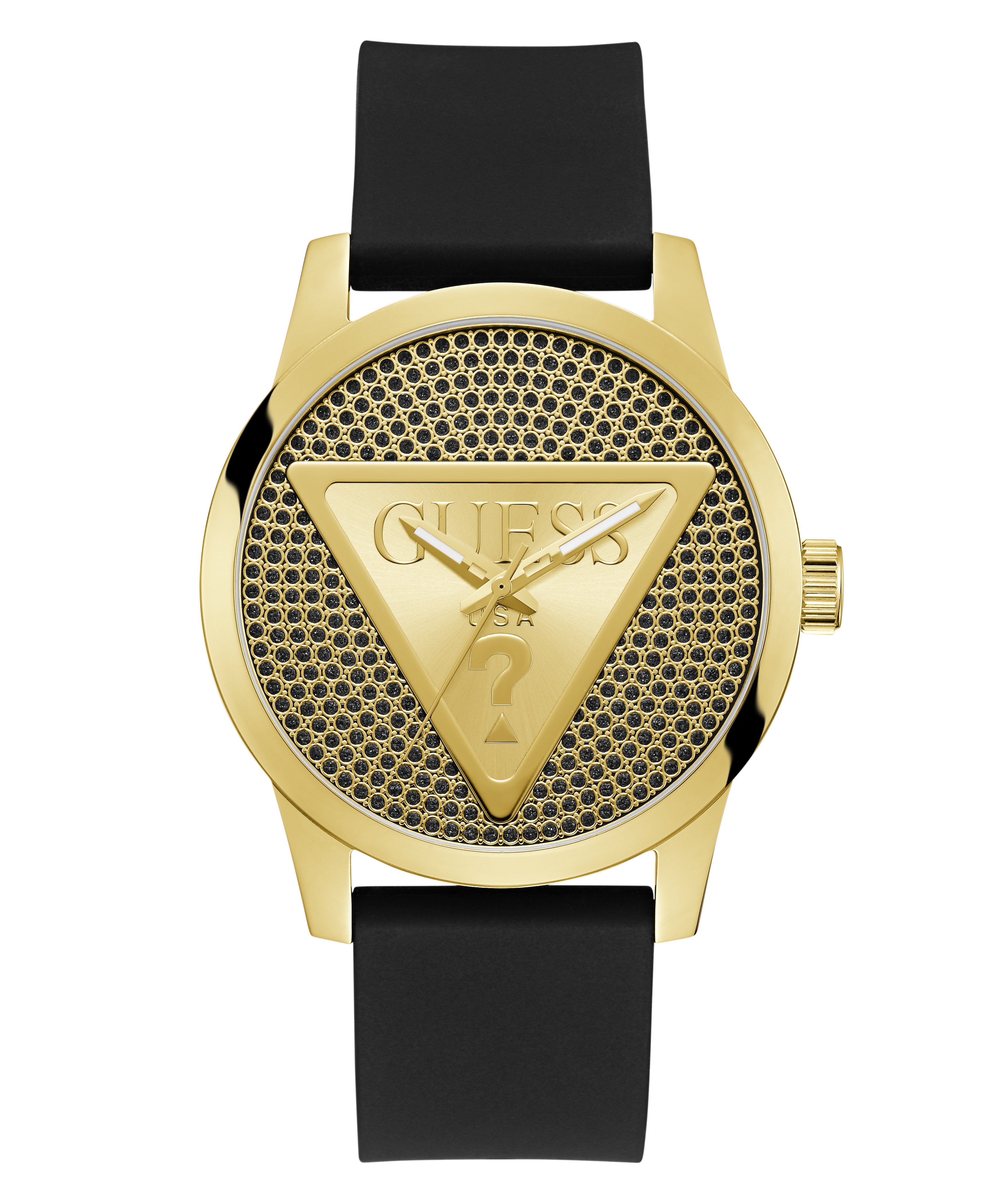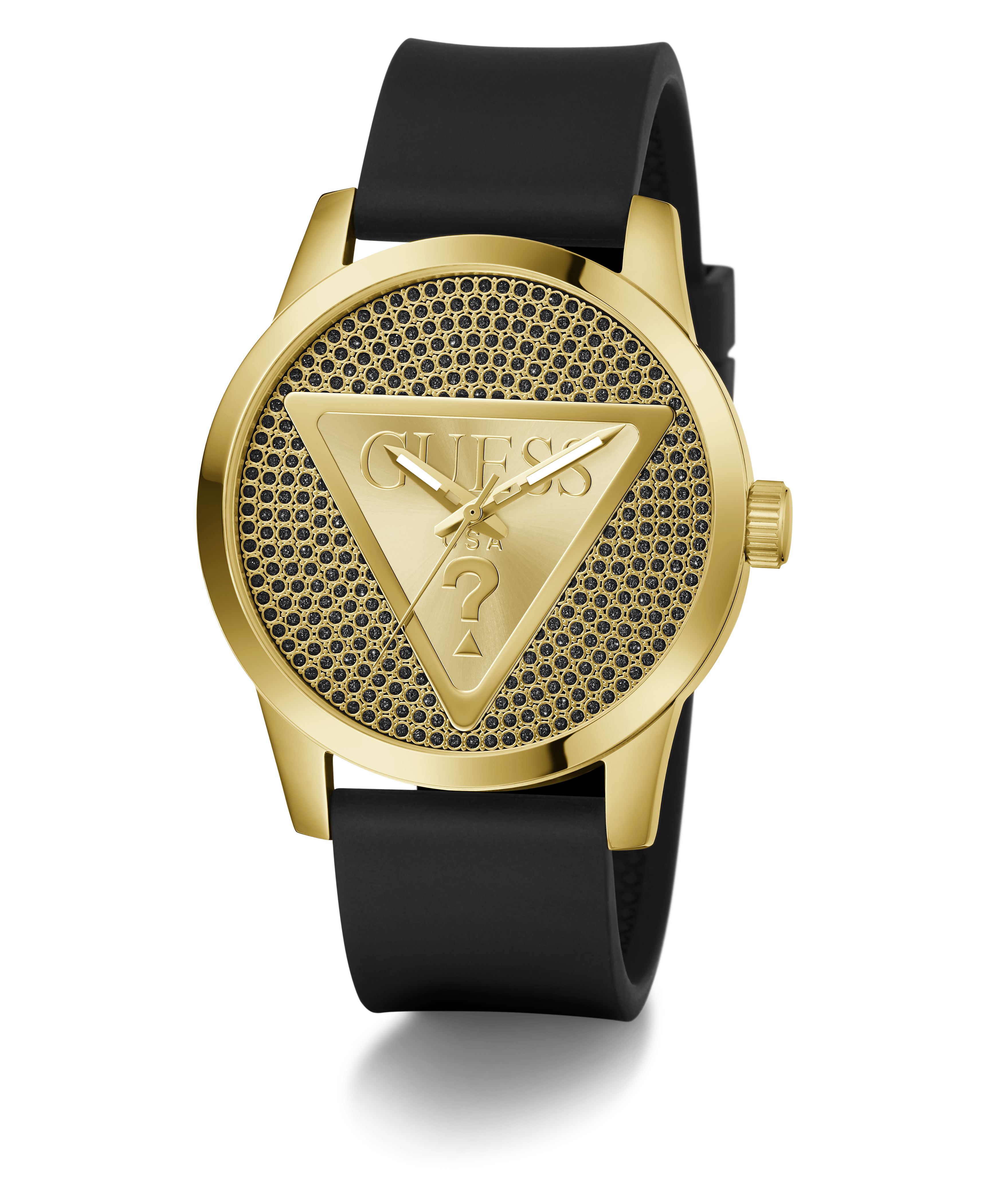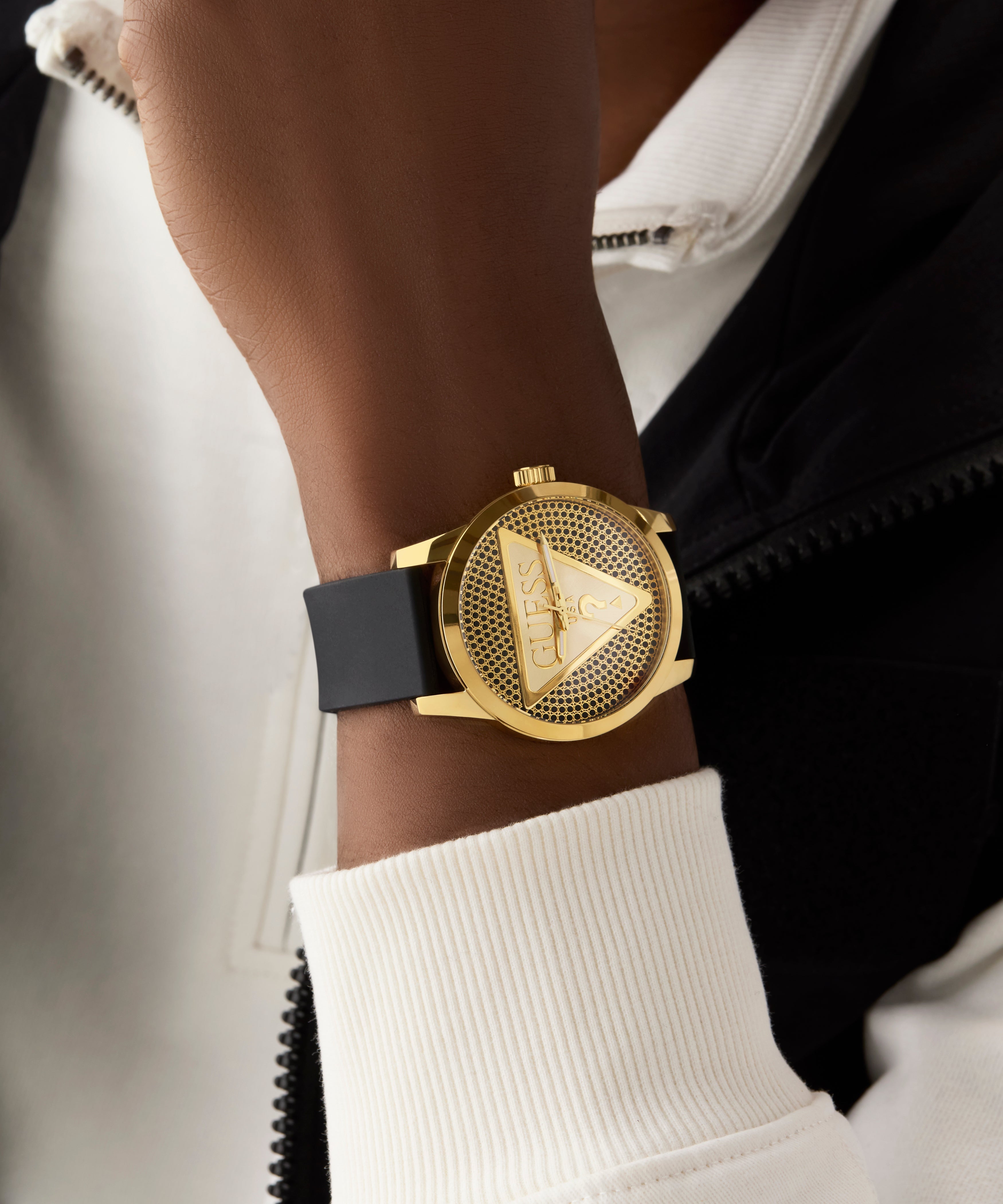 Wear your love for GUESS like a badge on your wrist with this iconic logo look paired with a smooth silicone strap and a glitzed out dial