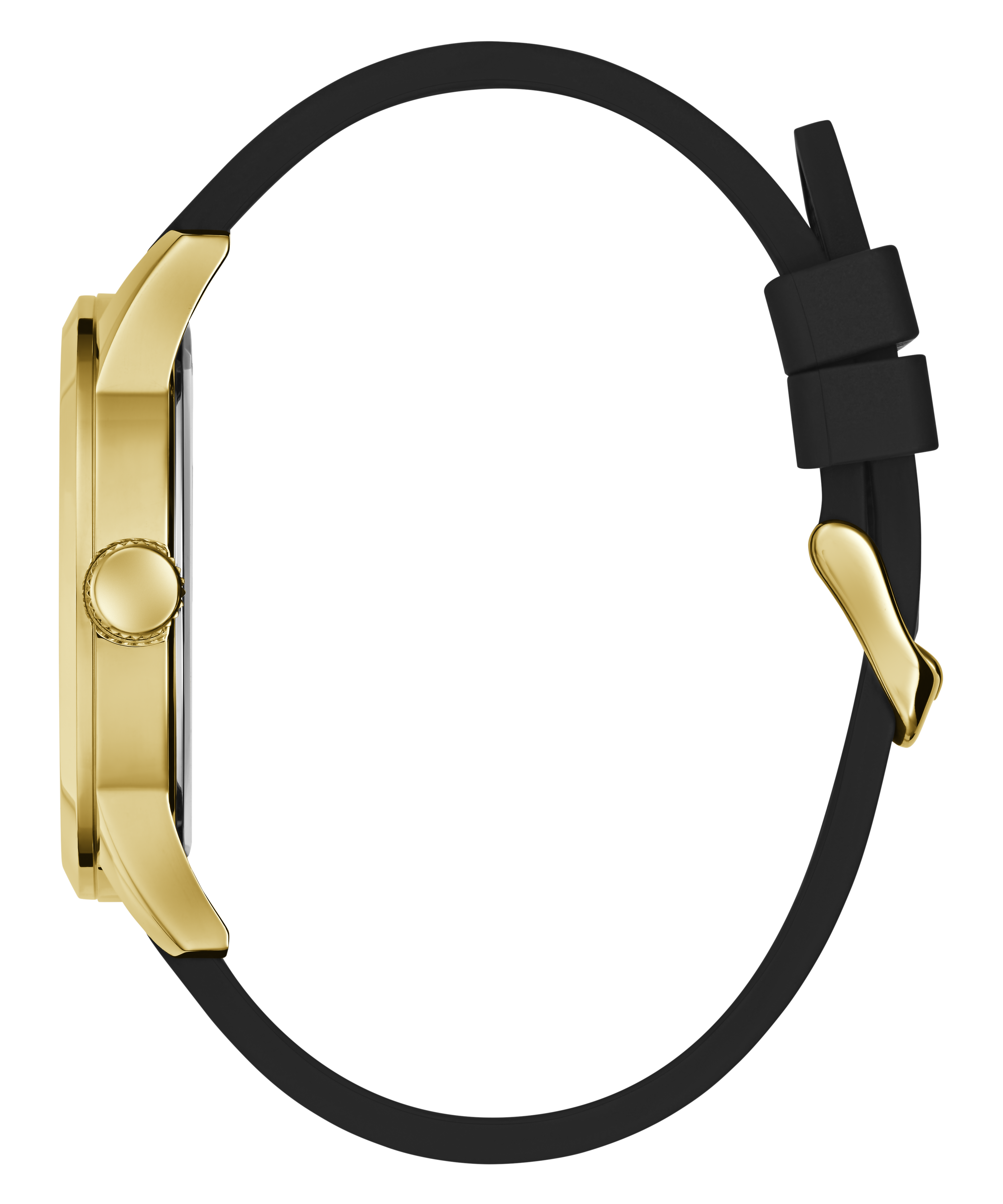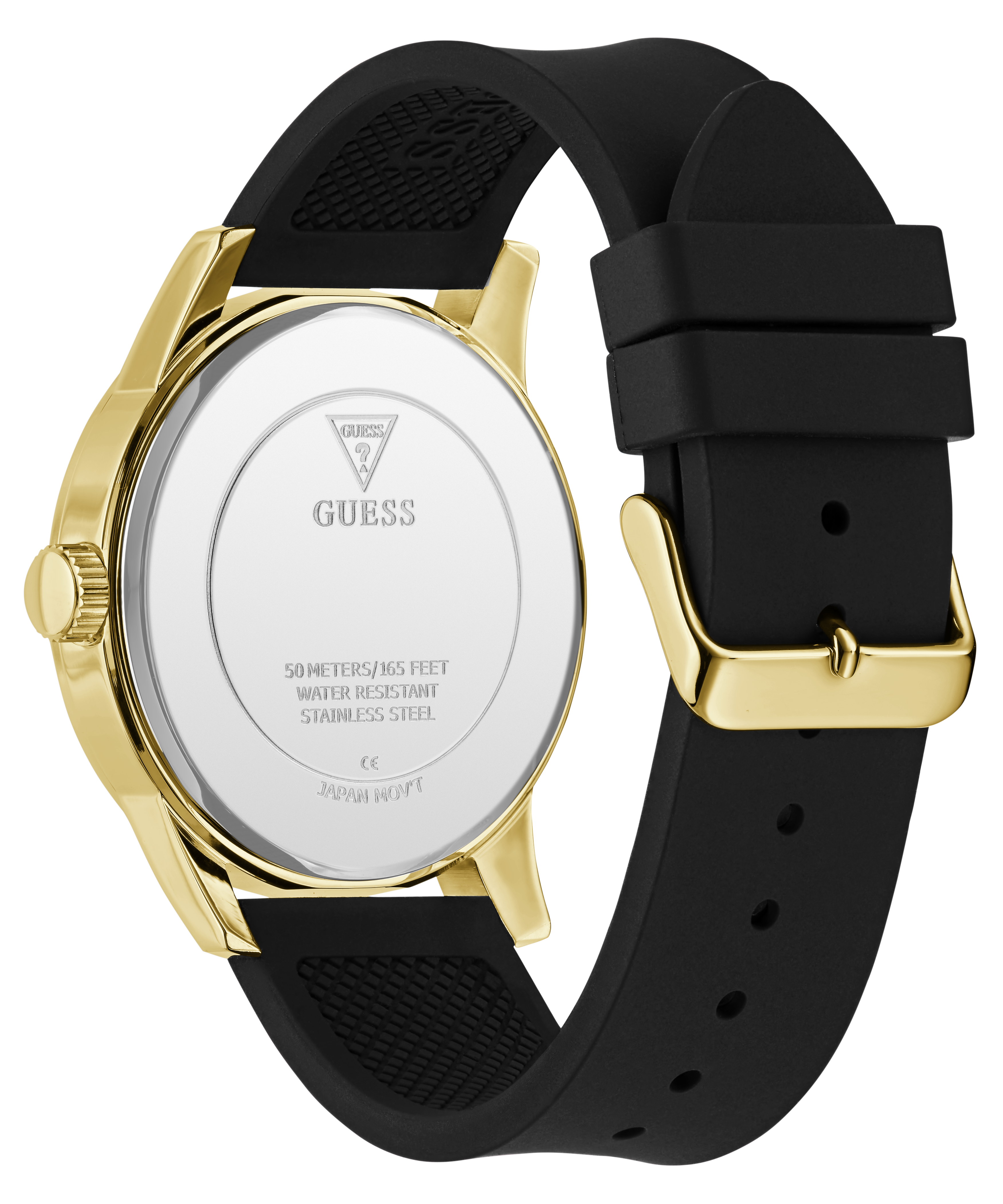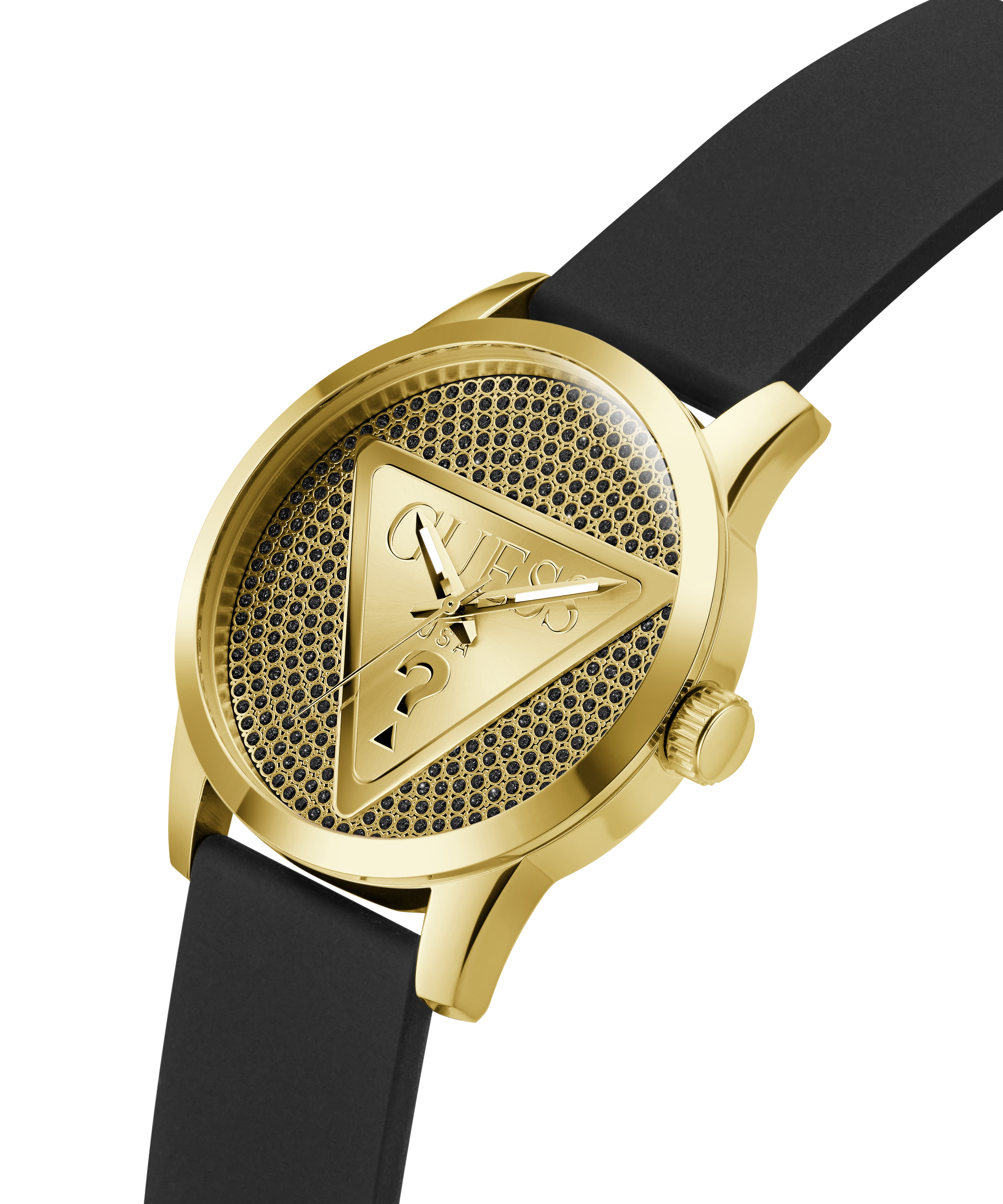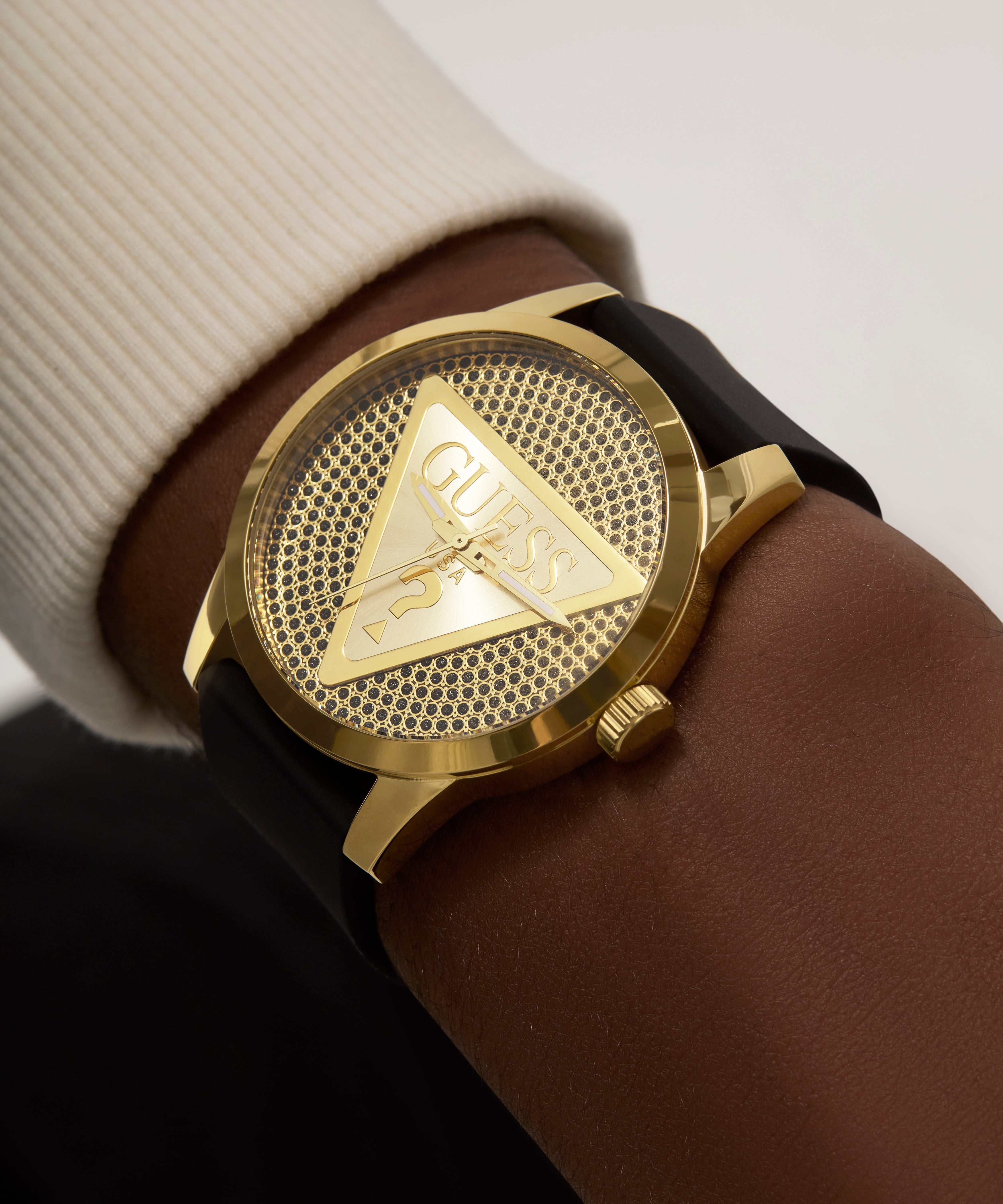 Wear your love for GUESS like a badge on your wrist with this iconic logo look paired with a smooth silicone strap and a glitzed out dial