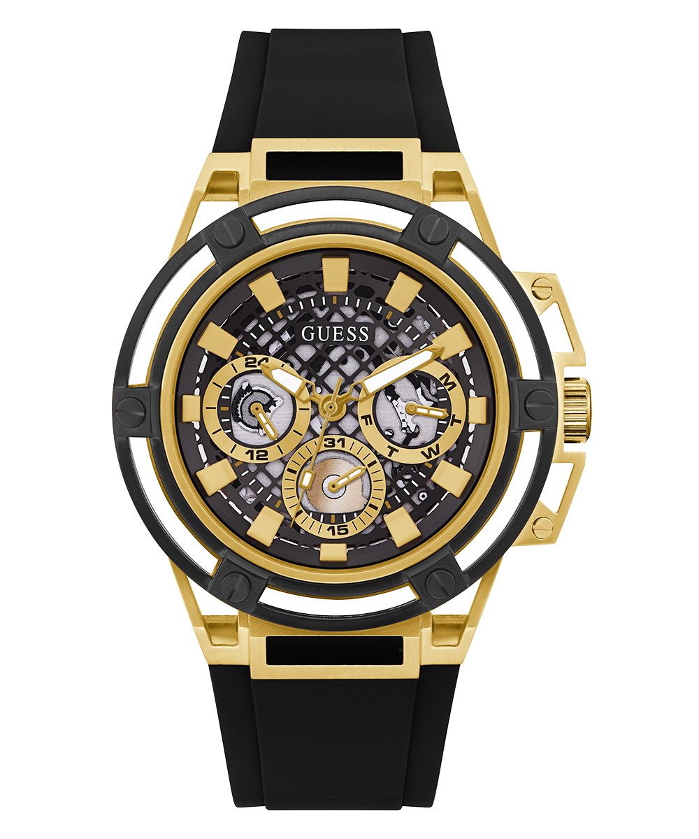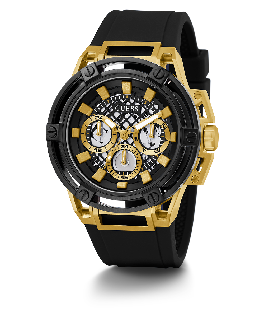 Go to the shopMatrix like patterns create a unique dial with cut thru details surrounded by a cut thru bezel and pushers and paired on silicone for whatever adventure awaits