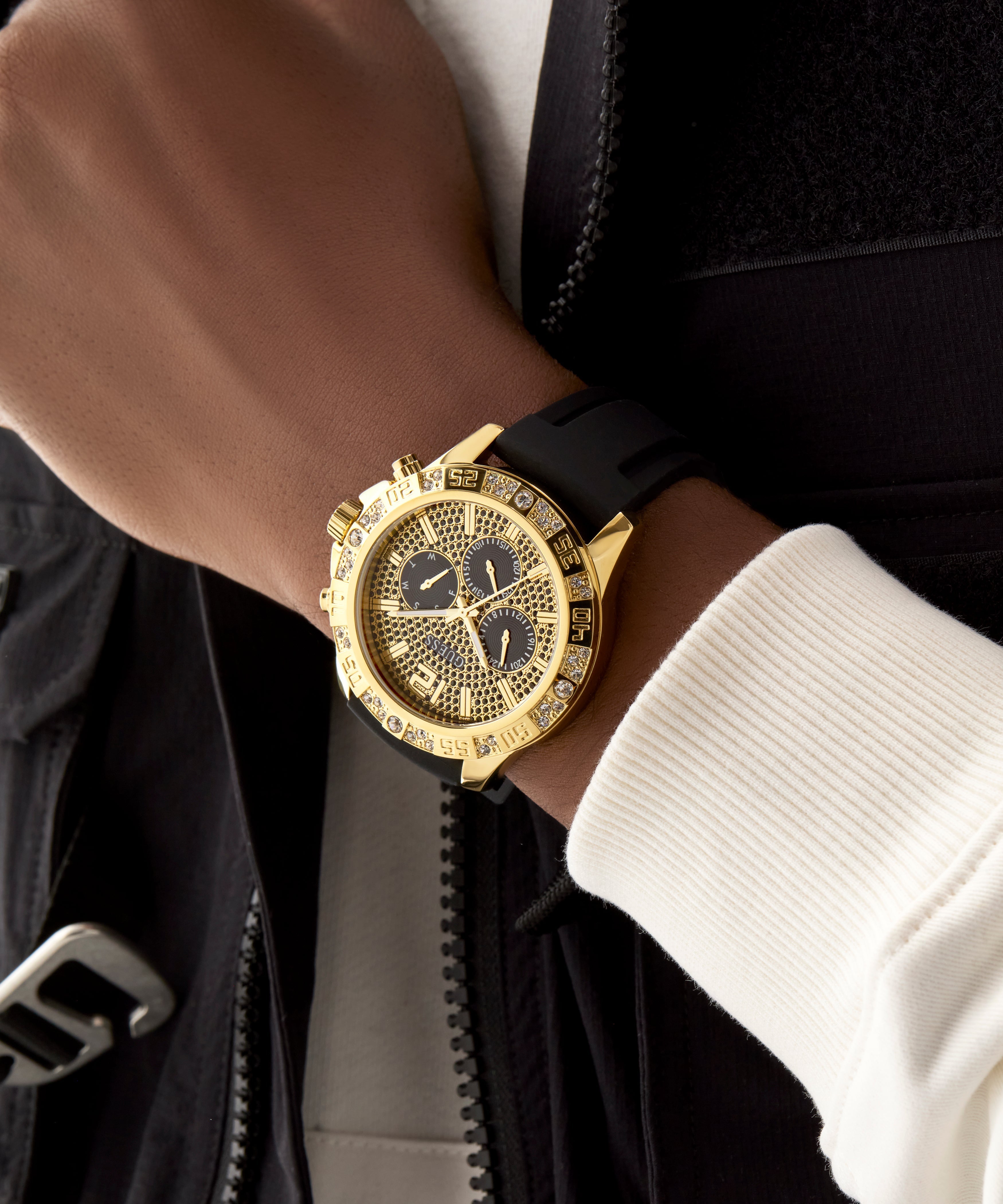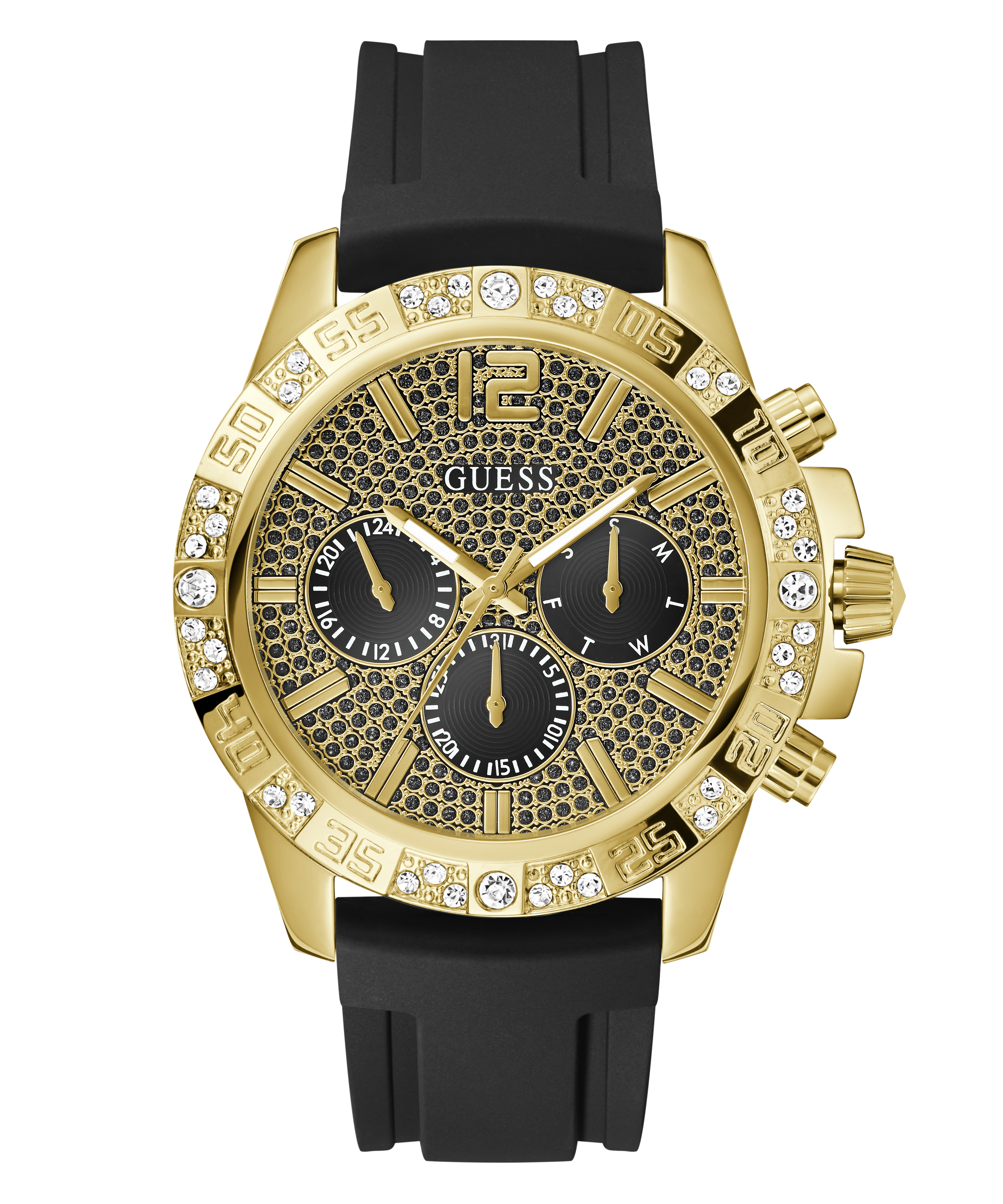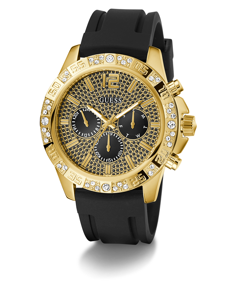 Go to the shopA truly majestic timepiece this style boasts a glitzed out multi-function chrono-look dial and a crystal bezel paired with a silicone strap.