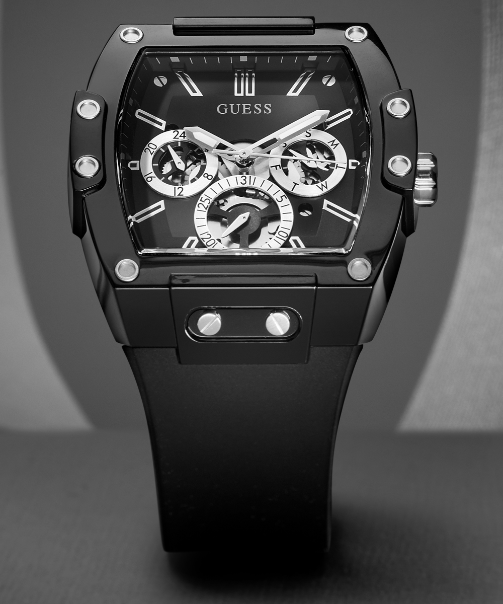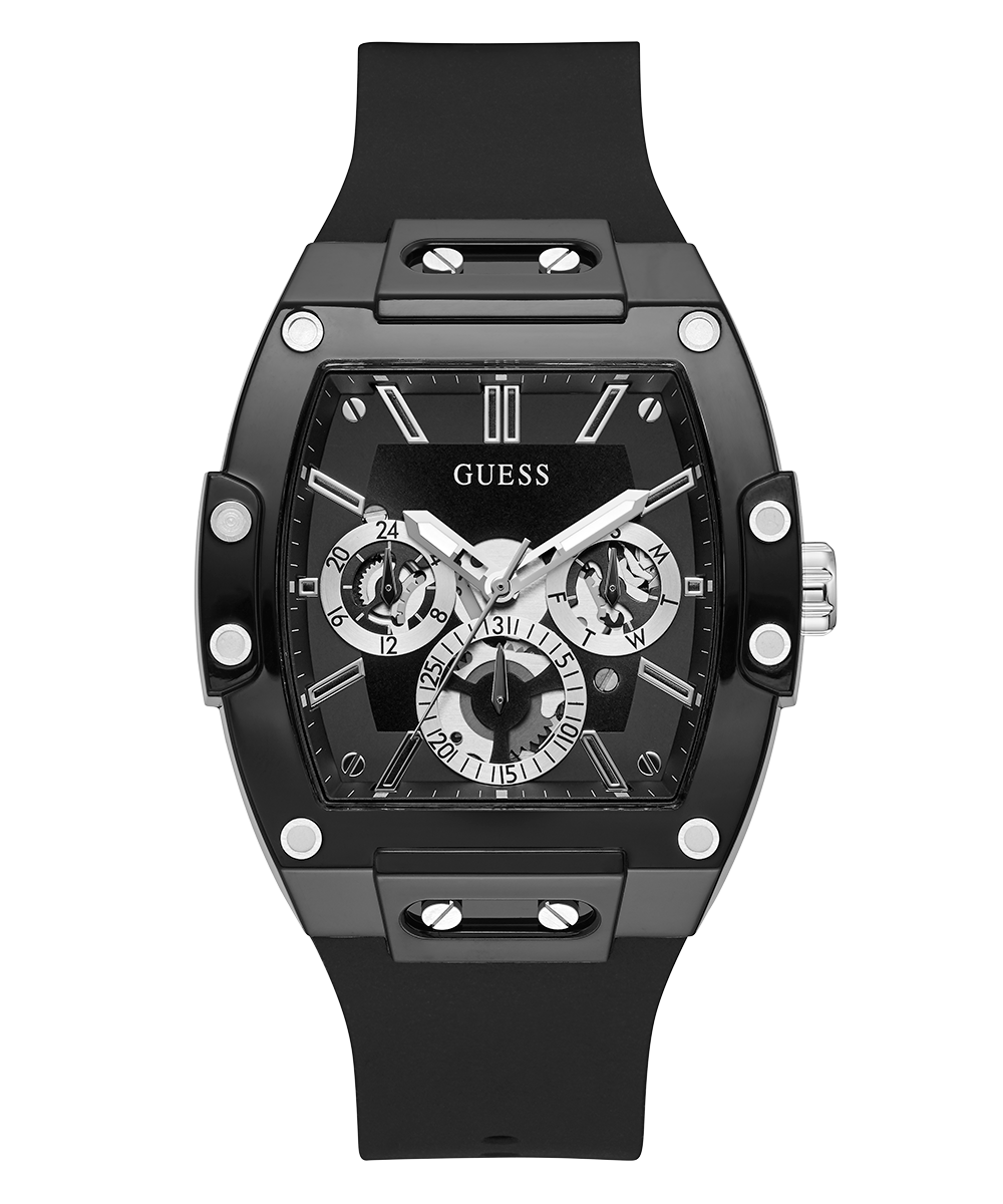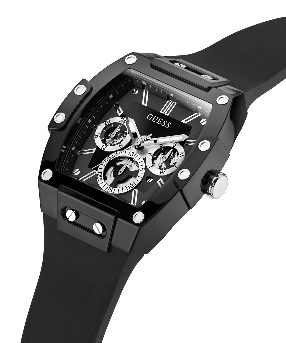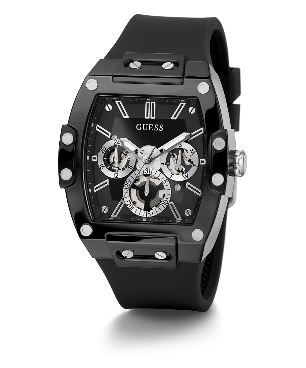 Skeleton dial details keep this phoenix on the rise. Featuring a black barrel shaped case with matching multi-function dial, this pairs perfectly with a smooth black silicone strap.