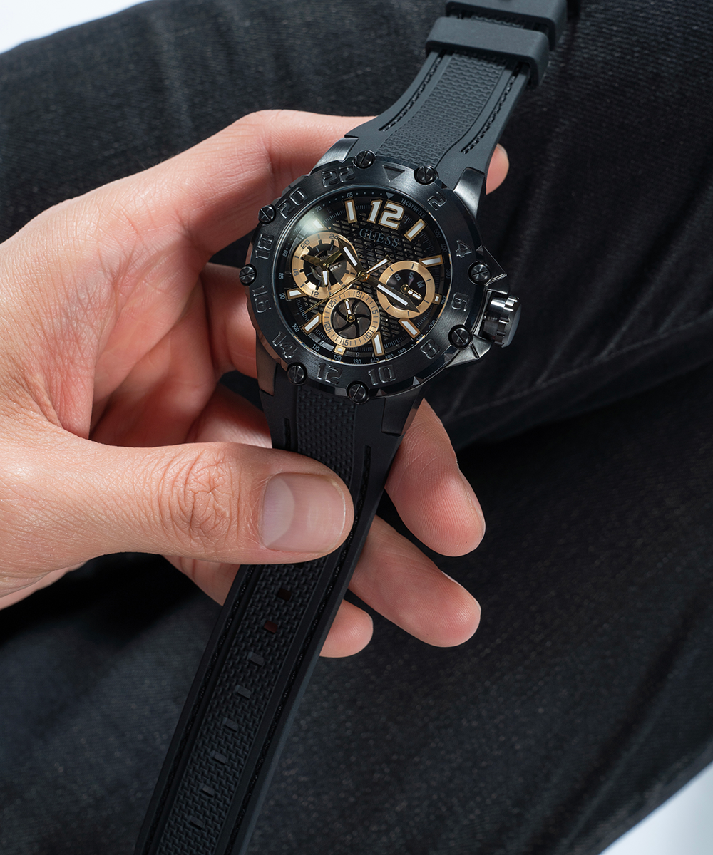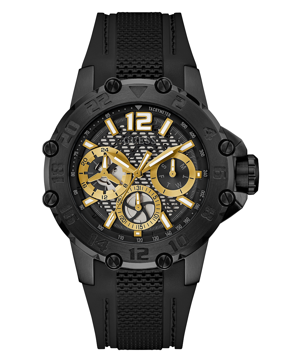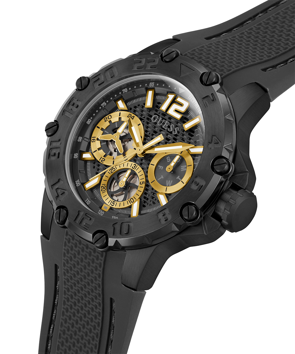 This oversized men's timepiece features a unique bezel that includes screw details as well as a dial that has cut thru details in its multi-function movement
