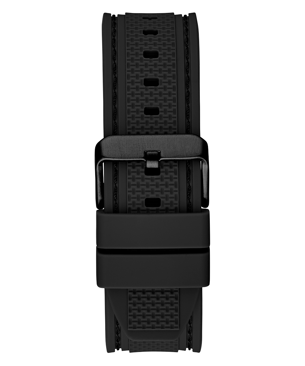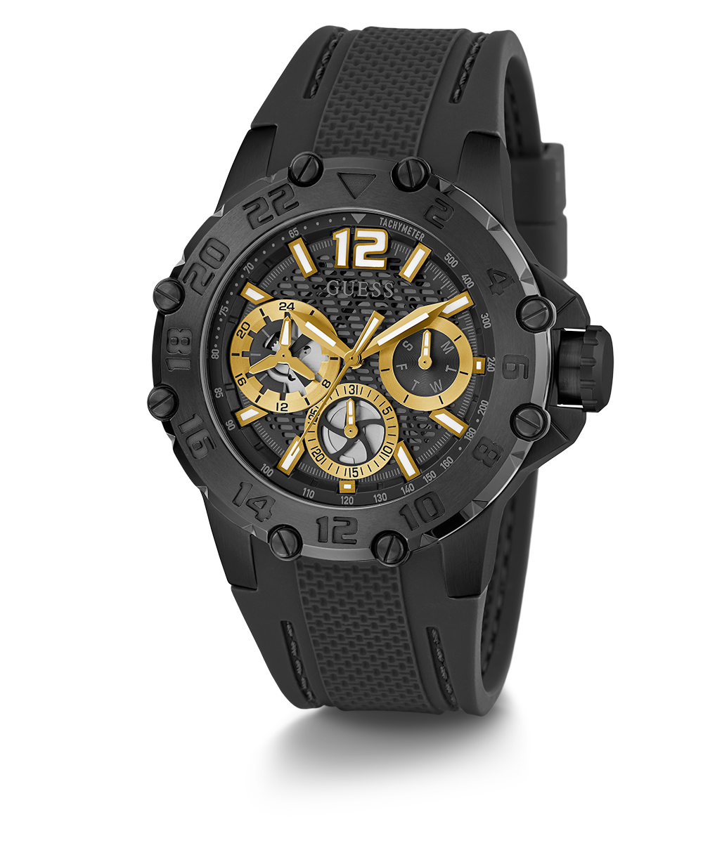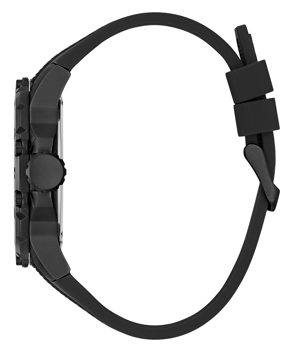 This oversized men's timepiece features a unique bezel that includes screw details as well as a dial that has cut thru details in its multi-function movement