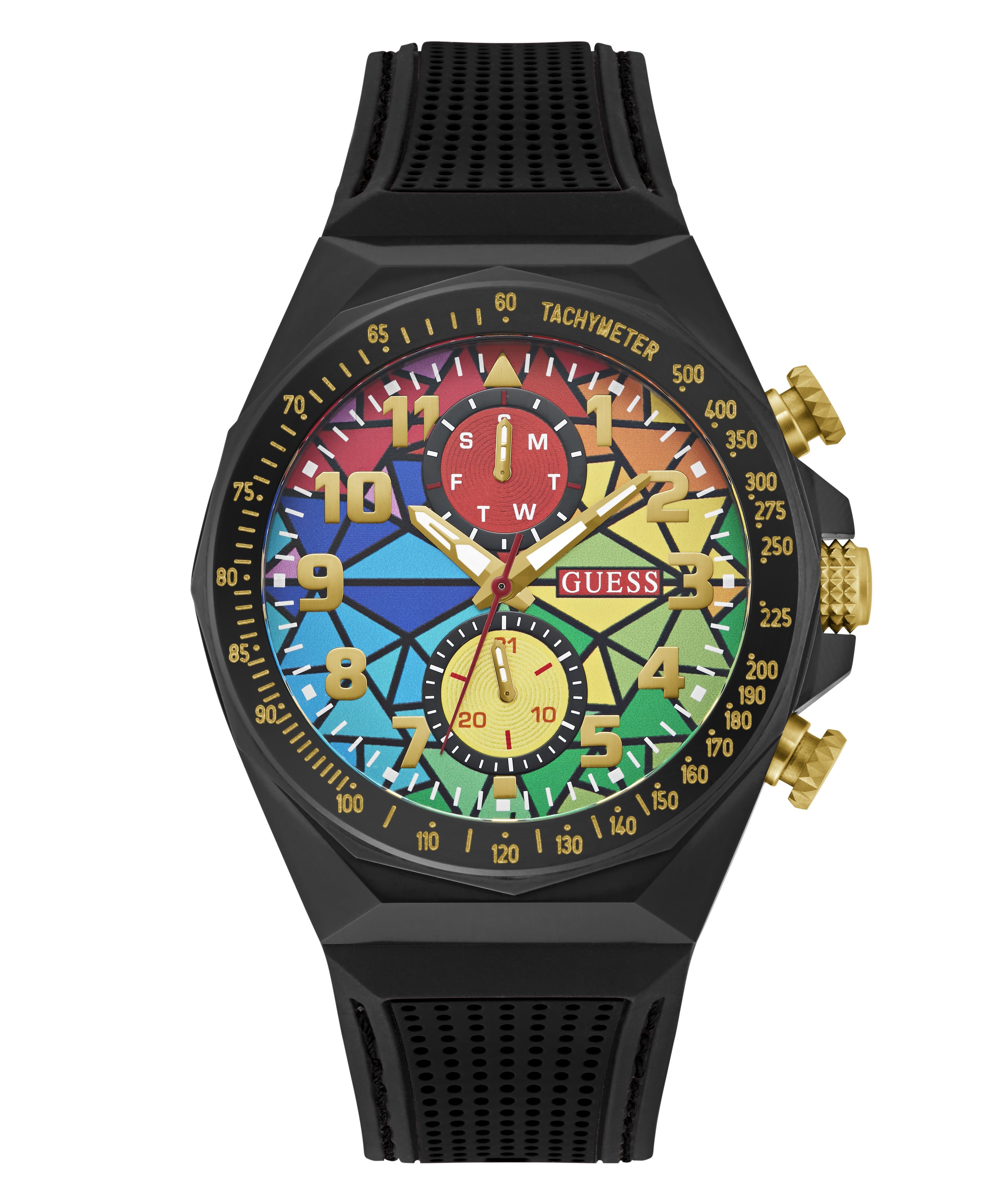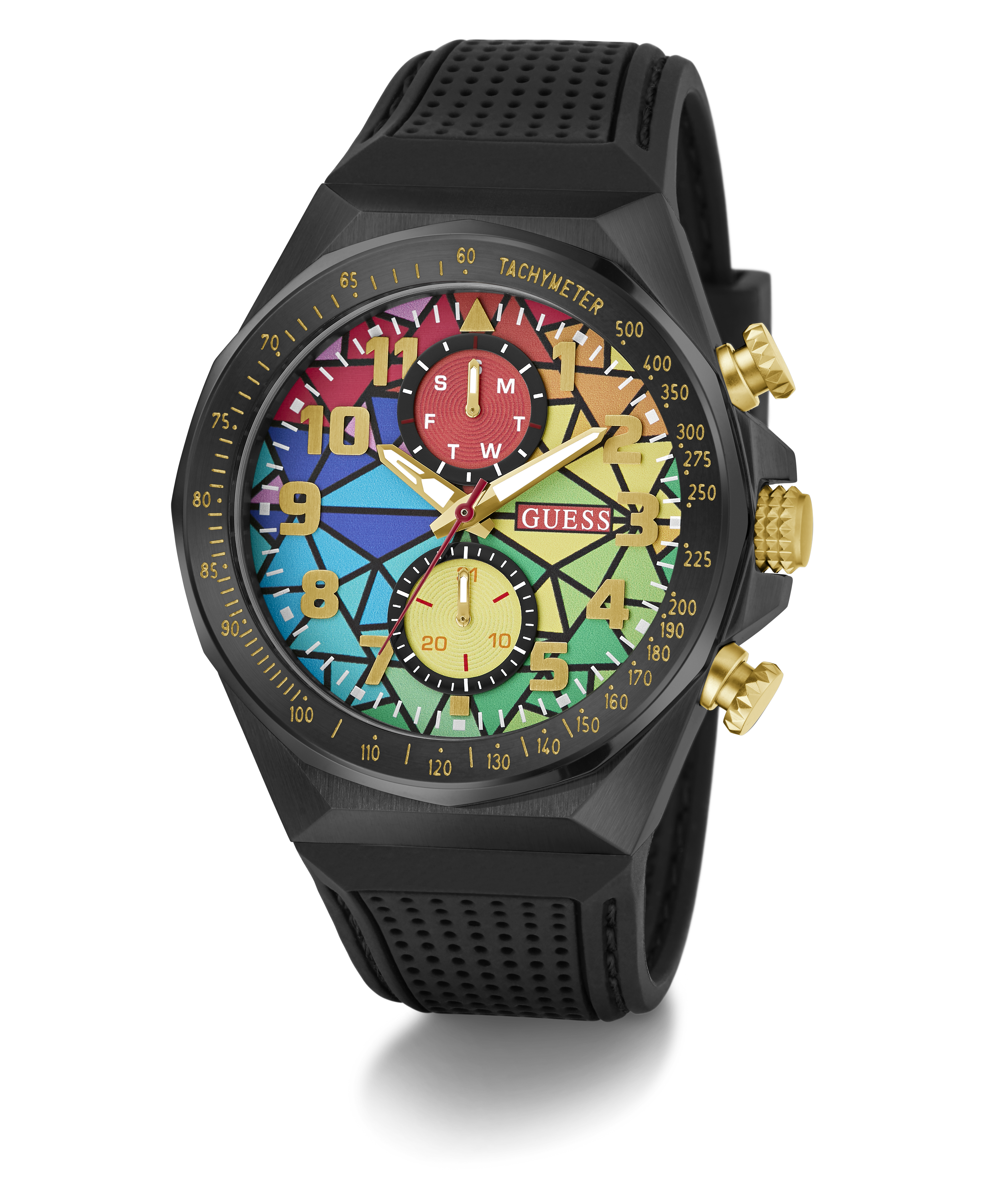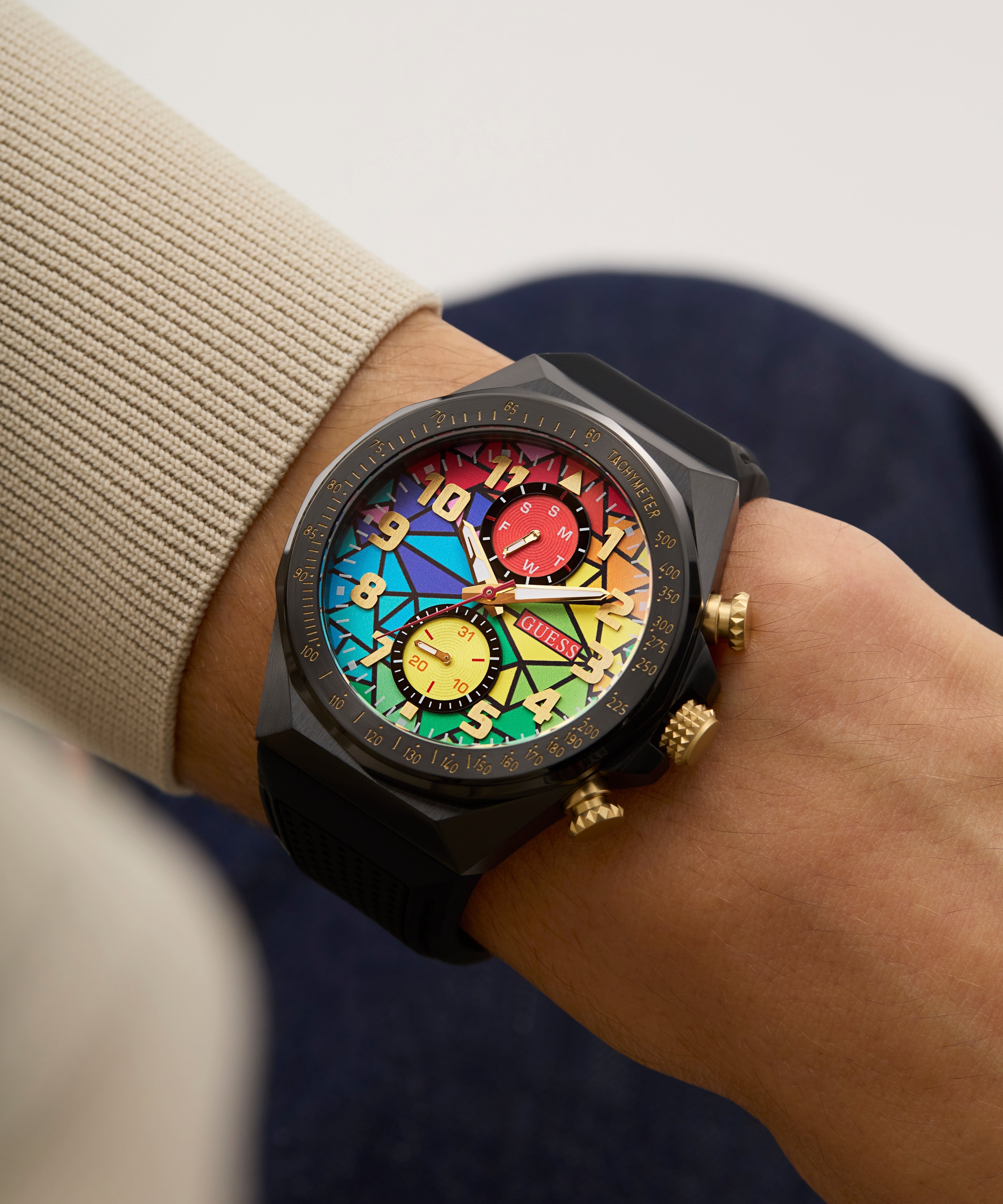Go to the shopScore the envy of everyone with this cool new sport look featuring a chrono-look multi-function movement paired with a rainbow mosaic detailed dial and a cool silicone strap.