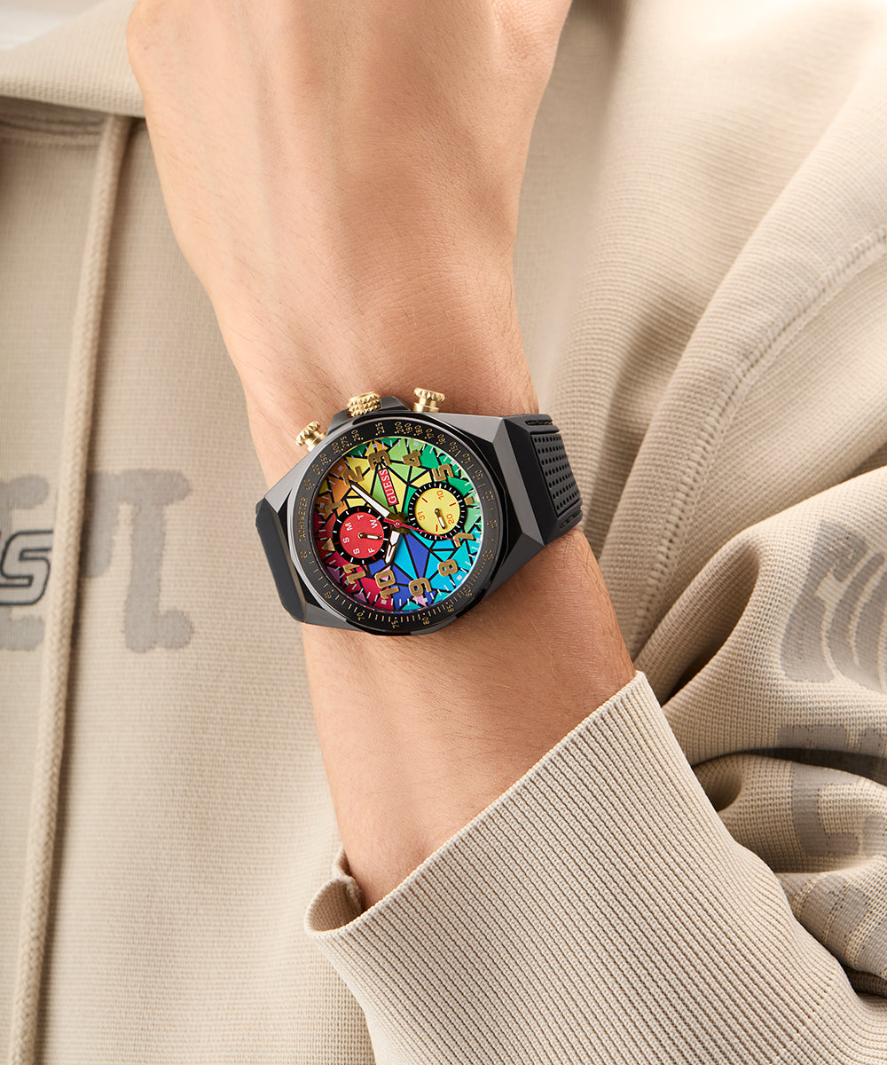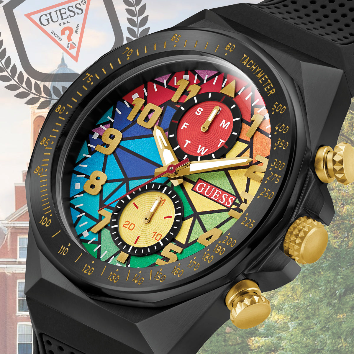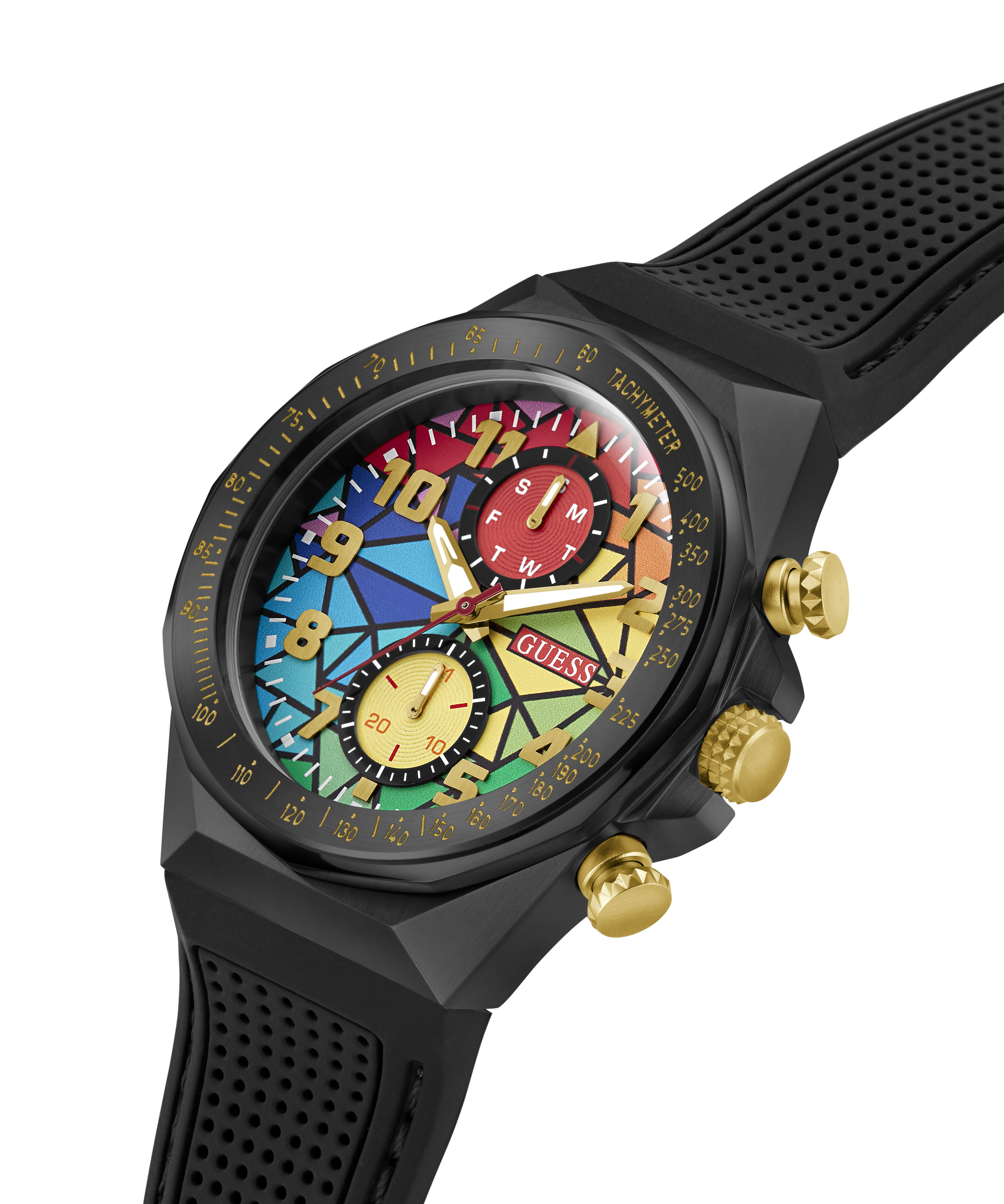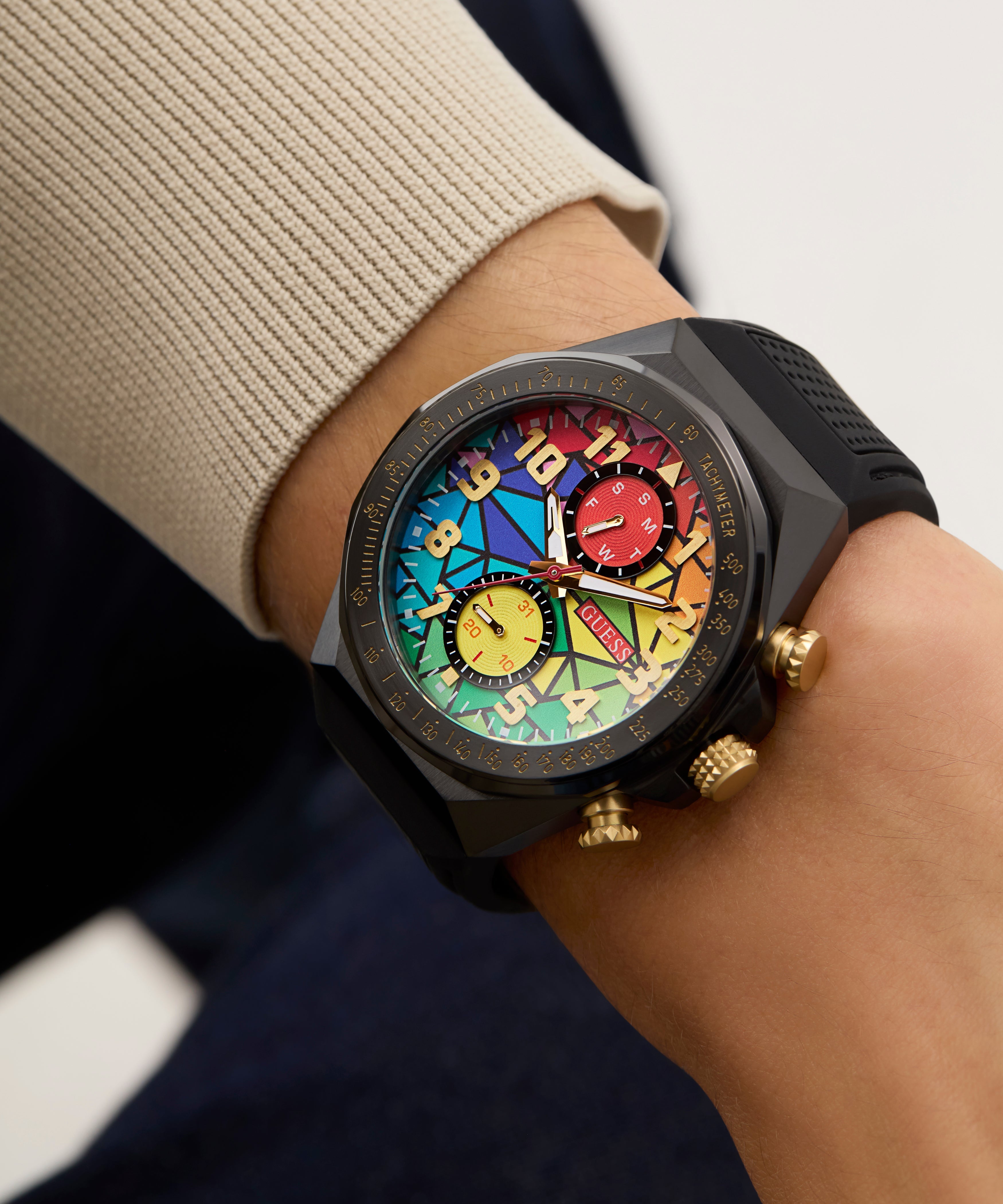 Go to the shopScore the envy of everyone with this cool new sport look featuring a chrono-look multi-function movement paired with a rainbow mosaic detailed dial and a cool silicone strap.