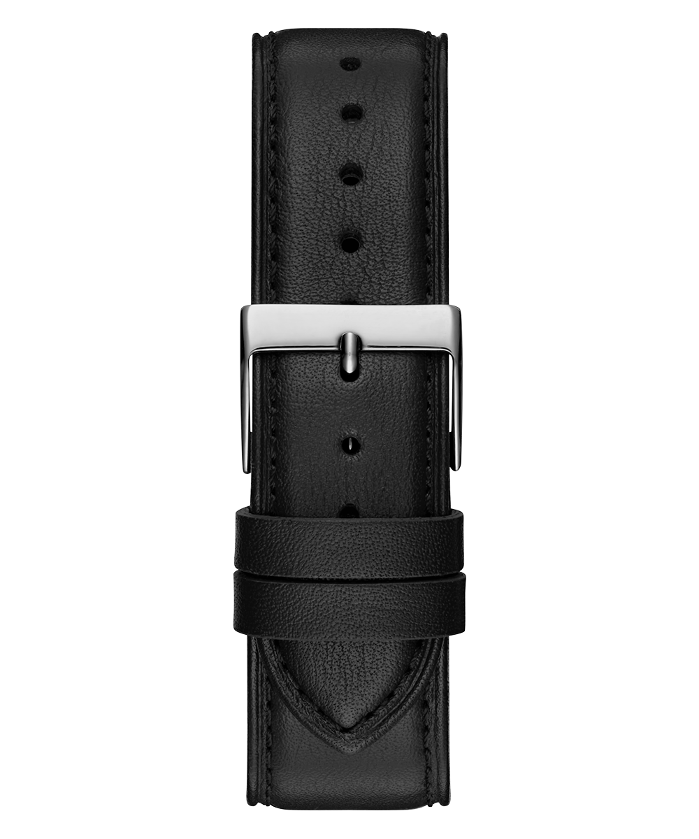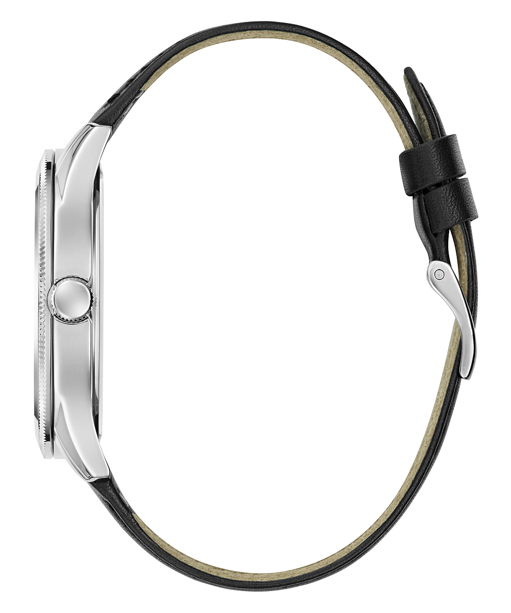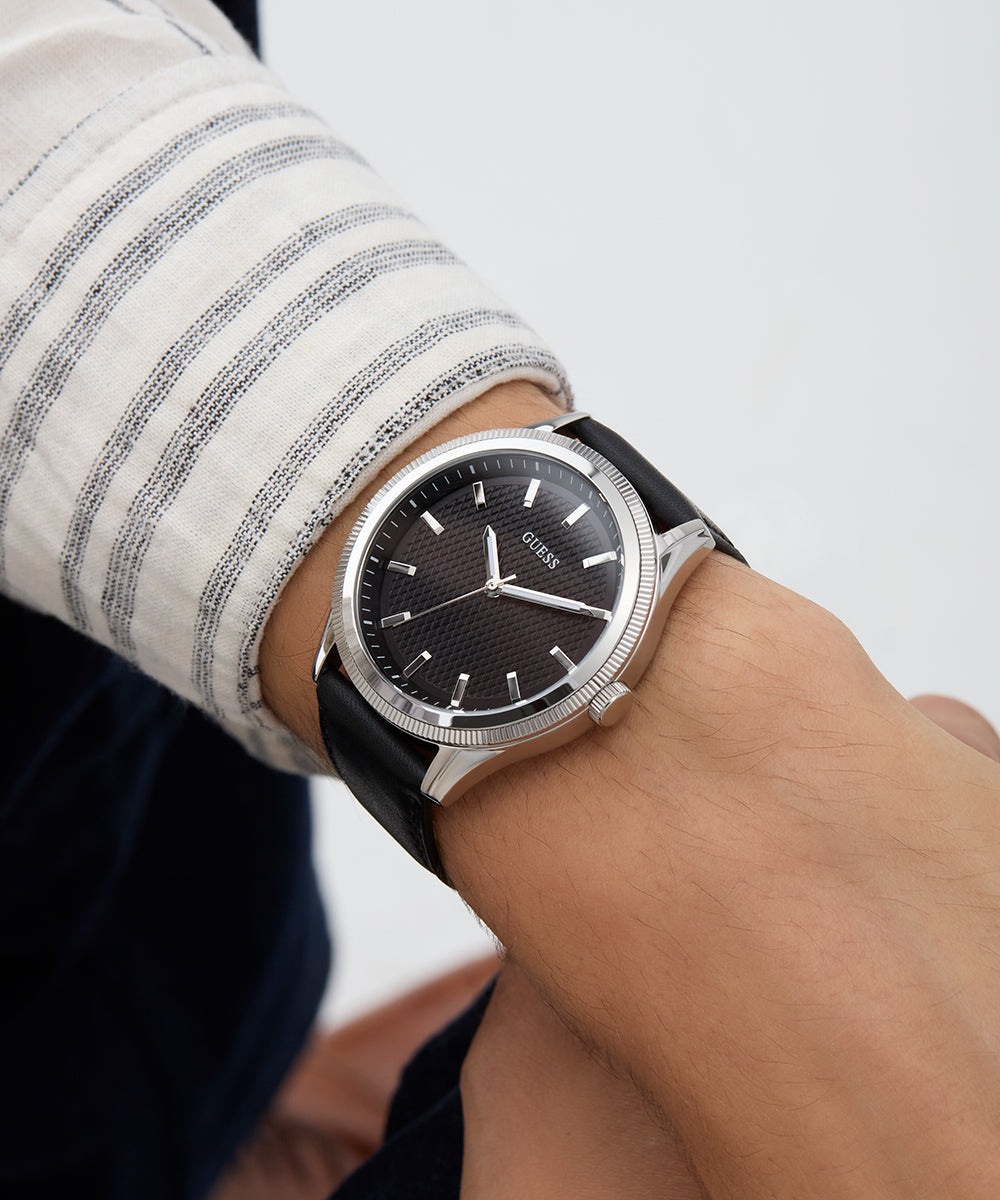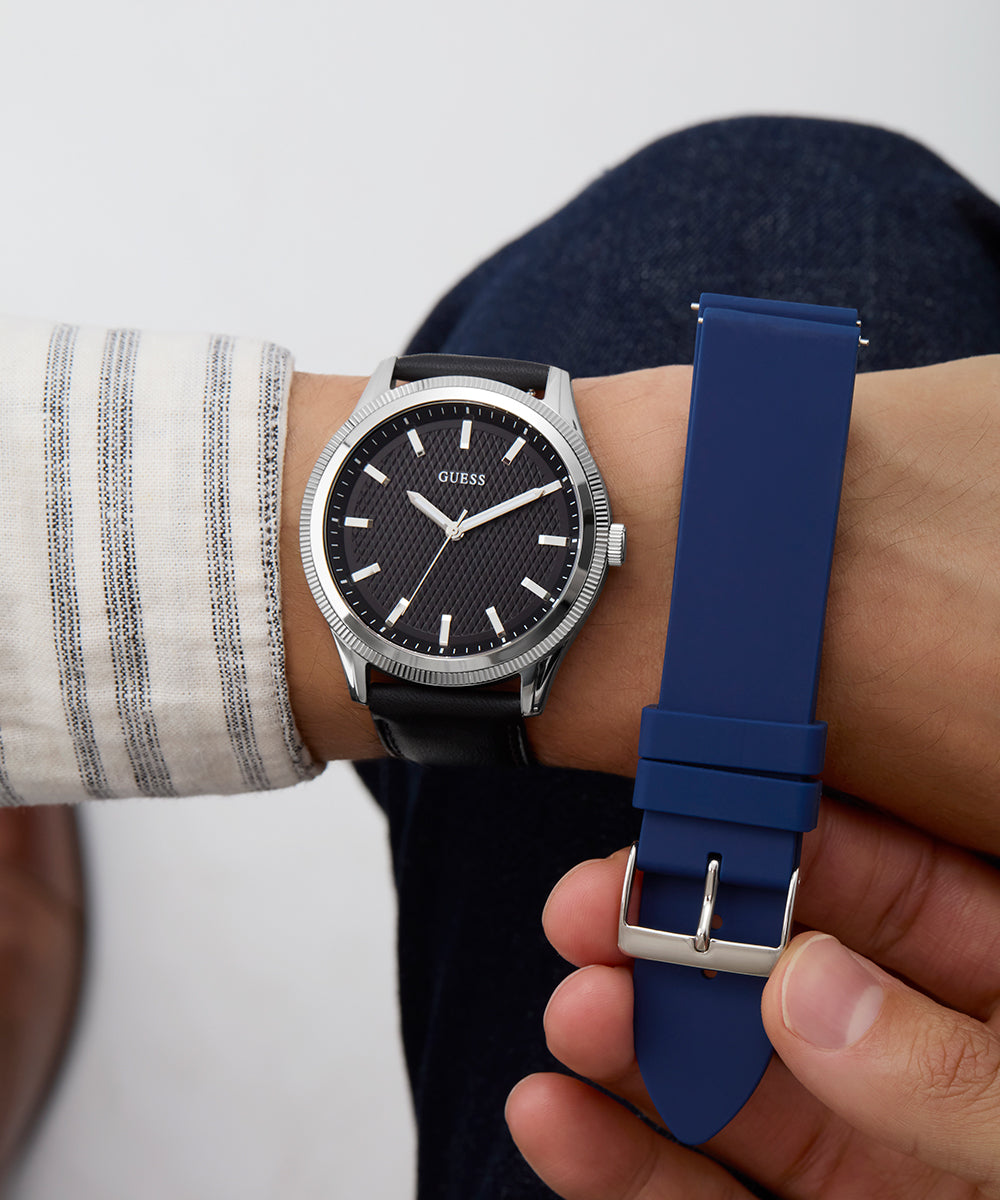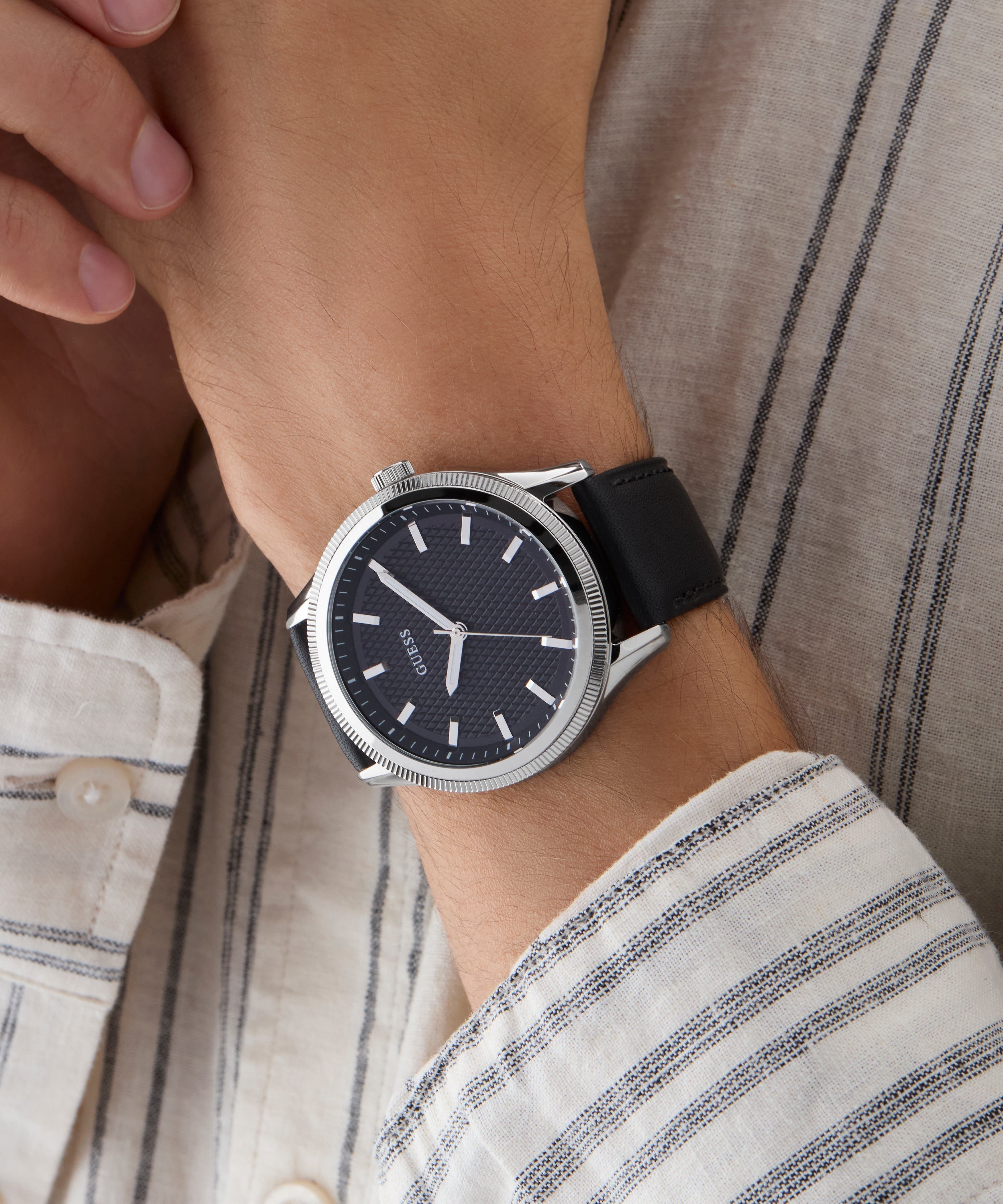 An easy go-to for any guy's wardrobe is this sophisticated dress watch featuring a refined textured pattern on the bezel as well as on its dial. Paired with a black smooth leather strap, interchangeable with a blue smooth silicone strap.