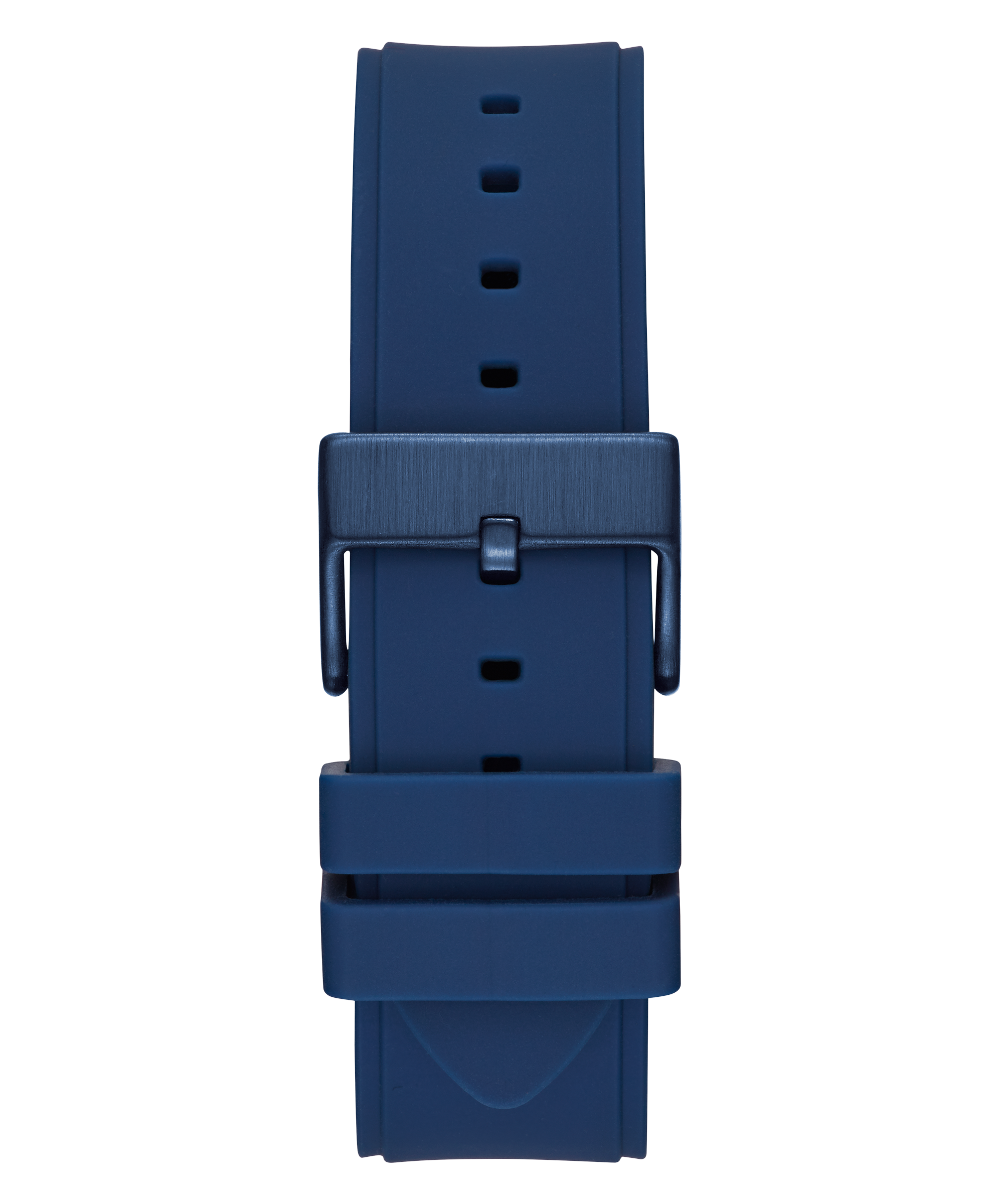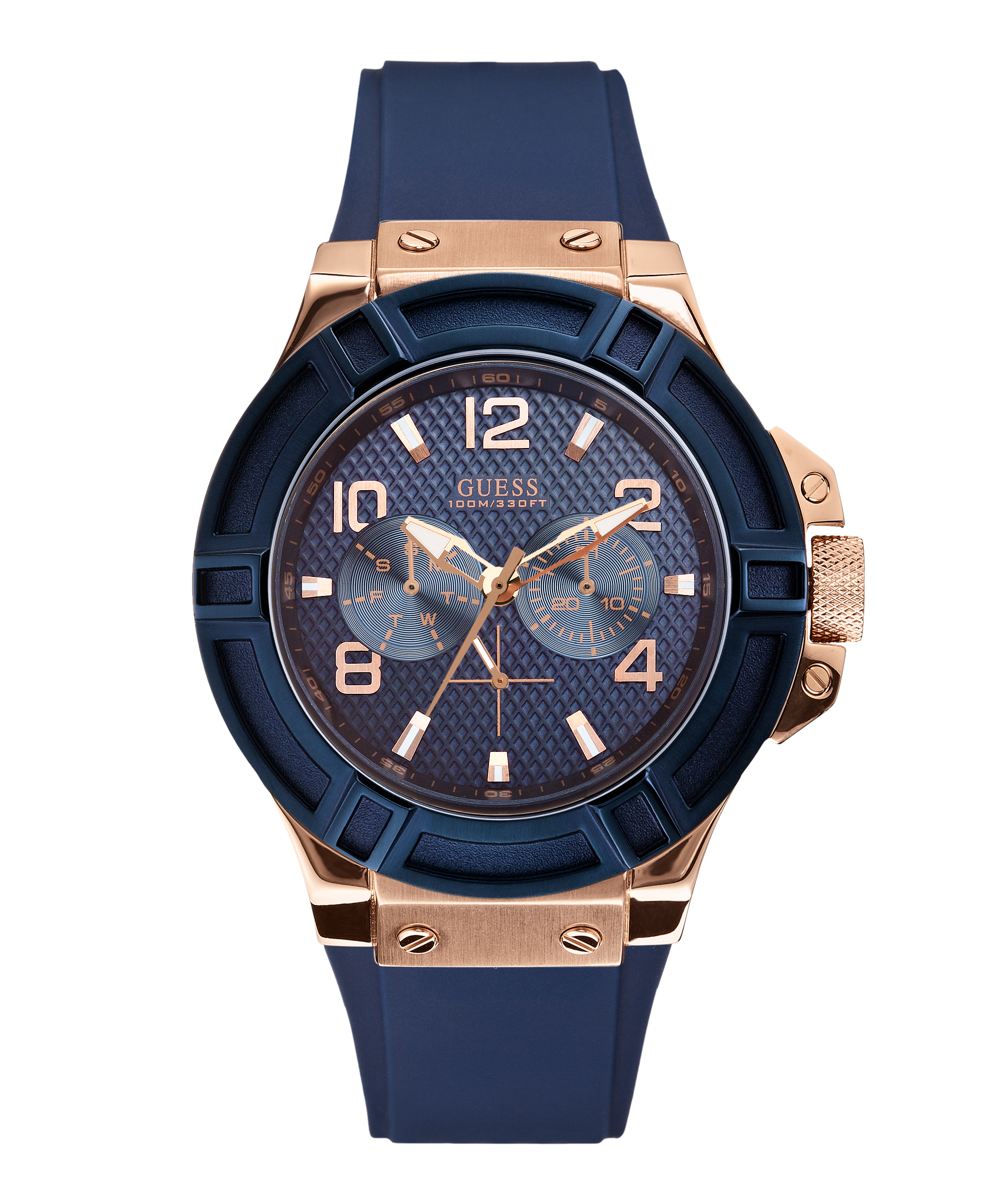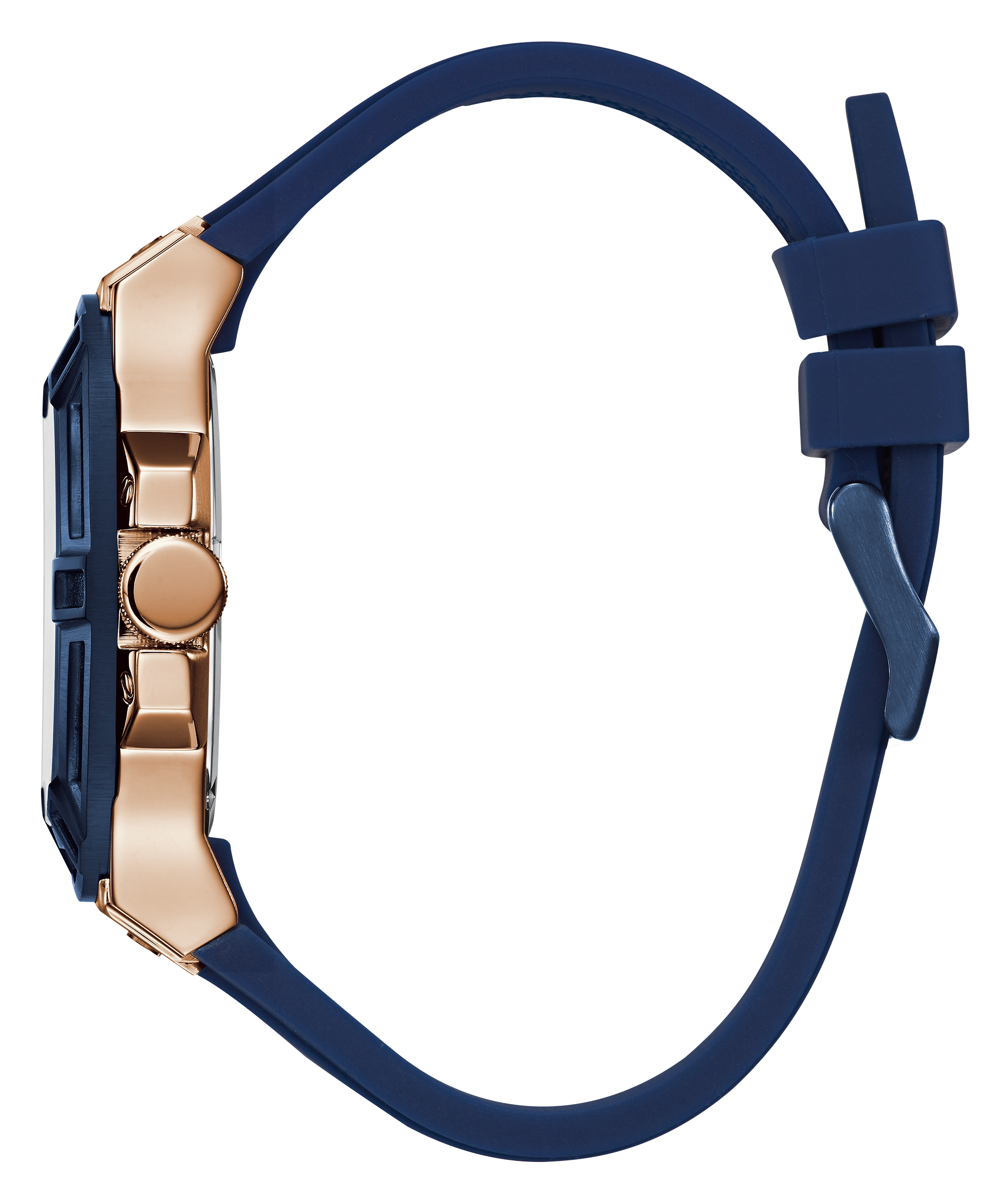 Bring your style to new heights in a stunning multi-function sport watch in rose gold with the GUESS signature blue plating on a smooth blue silicone strap.