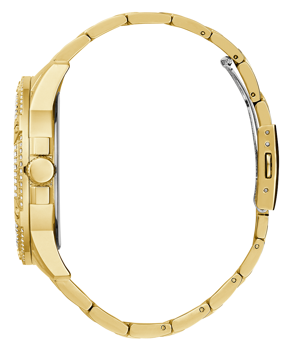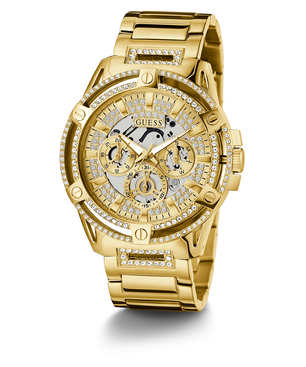 This new take on a classic style has a cutting-edge design with all over cut-thru details from the case to the bracelet as well as integrated on the dial design where you can see thru to the movement of this multi-function watch. Bringing bling elements to a new level with case and bracelet adornment and glitz powder on the dial to give an overall look of luxury.