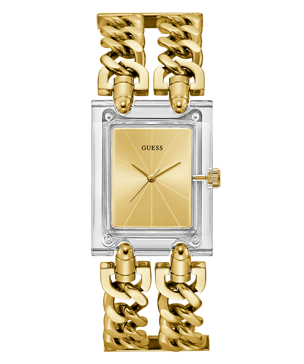 A new trendy look for a tried and true style this watch features a transparent clear case with sleek gold chains and adjustable G-links for easy sizing. Great on its own or layered with other jewelry!