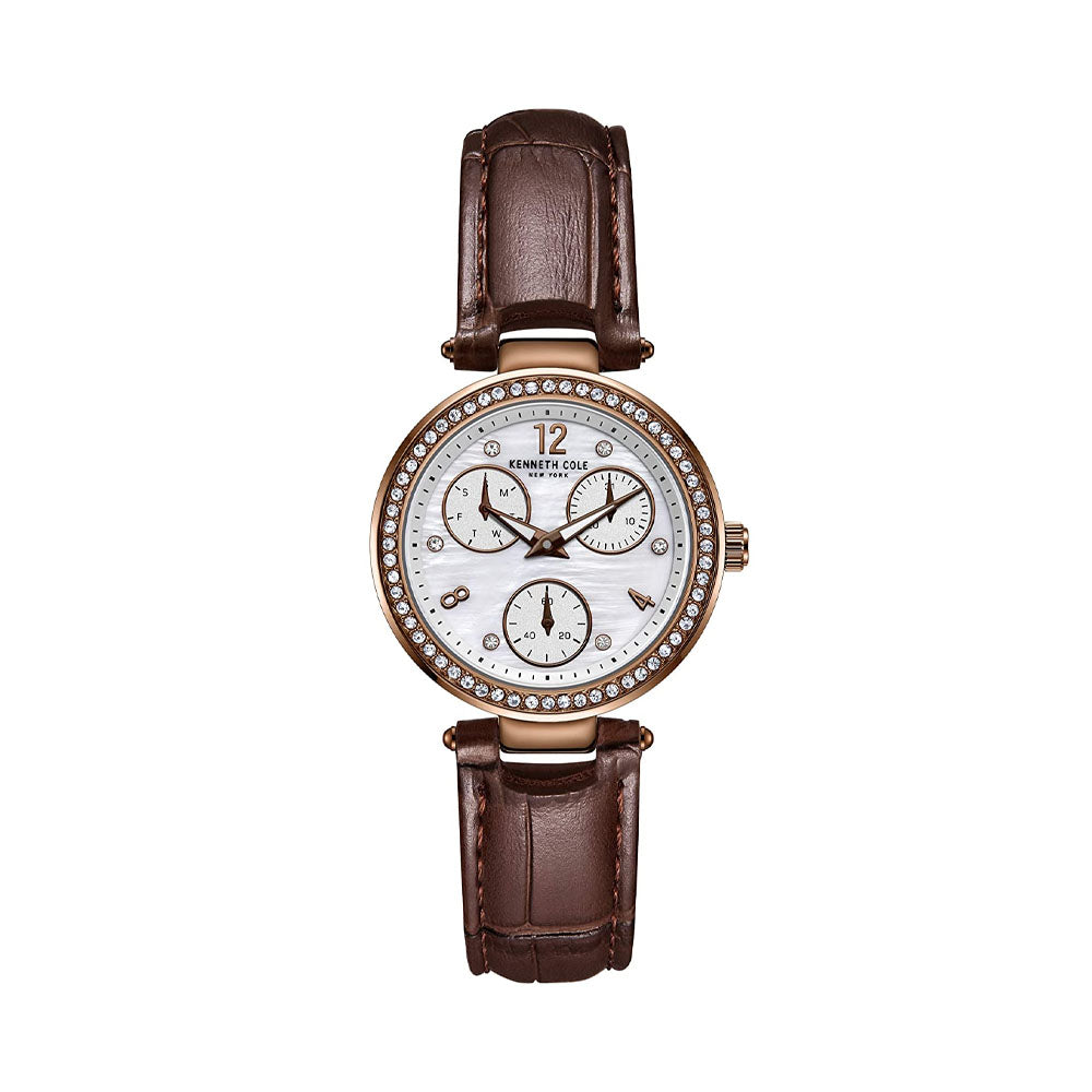 A new addition to your premium repertoire of timepieces, this women's analog watch from the Dress Sport collection by Kenneth Cole is a must-have wrist essential. The genuine leather strap exudes a brown hue that accentuates the look of the timekeeper. Encased in a 35 mm case, the mother of...