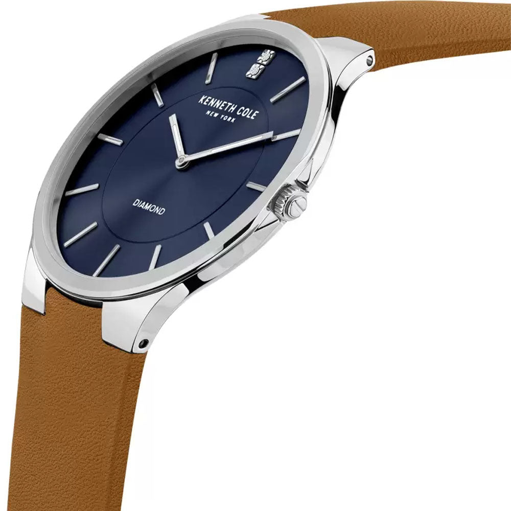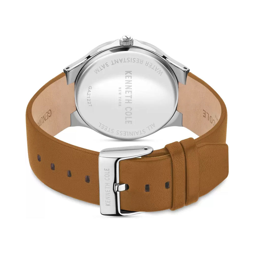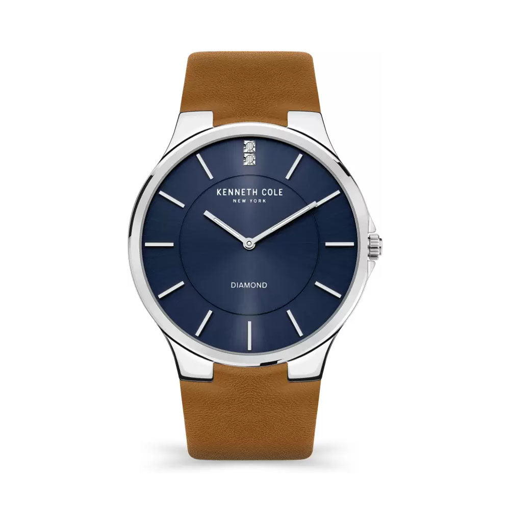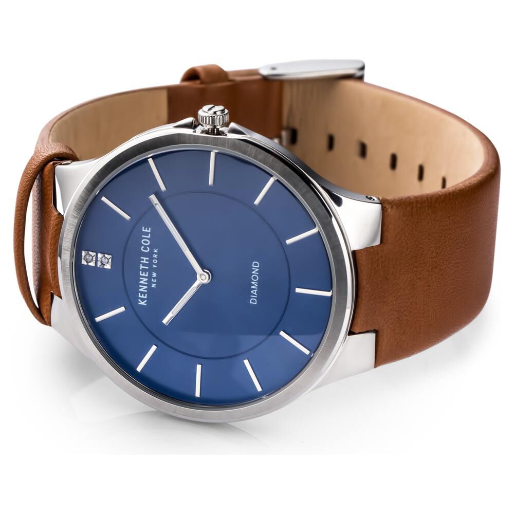 Simple yet stylish, this men's analog watch by Kenneth Cole will be a perfect pick for you. Its genuine leather strap flaunts a brown hue that accentuates the look of the watch. The blue round dial is encased in a sturdy case. It exudes plain two hands and a crown...