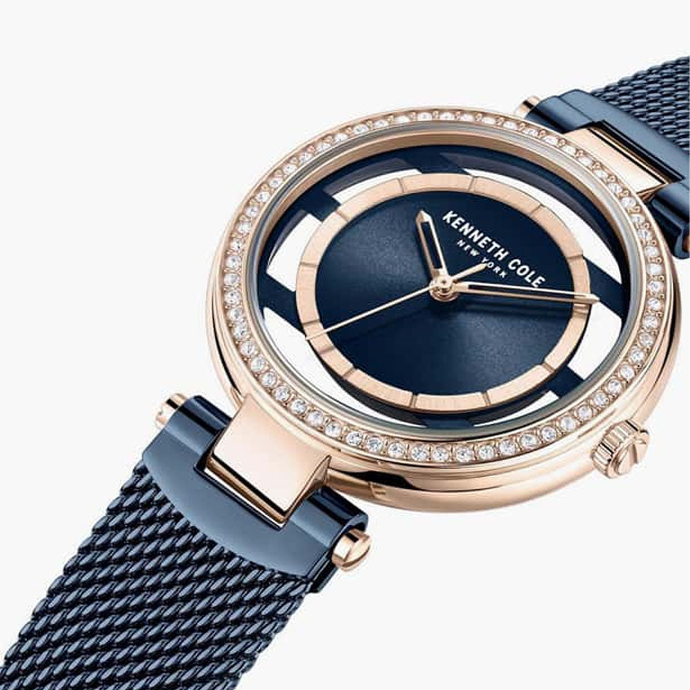 Give your wrist the perfect blend of style and comfort by wearing this women's analog watch from Kenneth Cole. Functional on a movement, the blue round dial is housed in a 34 mm case. It displays plain three hands and a crown for time adjustment. The stainless steel strap comes in a blue hue that further elevates the look of the watch. Besides, it is completed with a hook buckle clasp to ensure a secure fit on the wrist. This water-resistant watch will be your timeless possession.